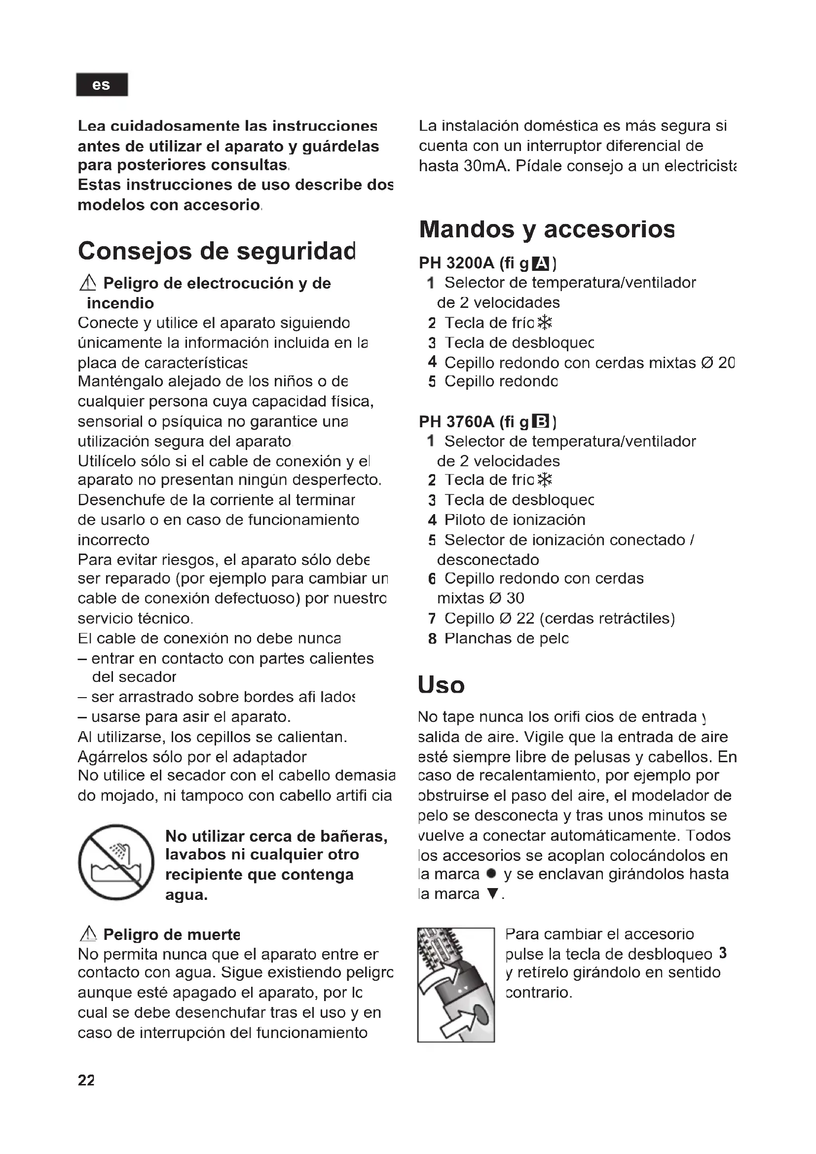 Peligro de electrocución y de incendio Conecte y utilice el aparato siguiendo únicamente la información incluida en la placa de características Manténgalo alejado de los niños o de cualquier persona cuya capacidad física, sensorial o psíquica no garantice una utilización segura del aparato. Utilícelo sólo si el cable de conexión y el aparato no presentan ningún desperfecto. Desenchufe de la corriente al terminar de usarlo o en caso de funcionamiento incorrecto. Para evitar riesgos, el aparato sólo debe ser reparado (por ejemplo para cambiar un cable de conexión defectuoso) por nuestro servicio técnico. El cable de conexión no debe nunca – entrar en contacto con partes calientes del secador – ser arrastrado sobre bordes afi lados – usarse para asir el aparato. Al utilizarse, los cepillos se calientan. Agárrelos sólo por el adaptador. No utilice el secador con el cabello demasia- do mojado, ni tampoco con cabello artifi cial. No utilizar cerca de bañeras, lavabos ni cualquier otro recipiente que contenga agua.