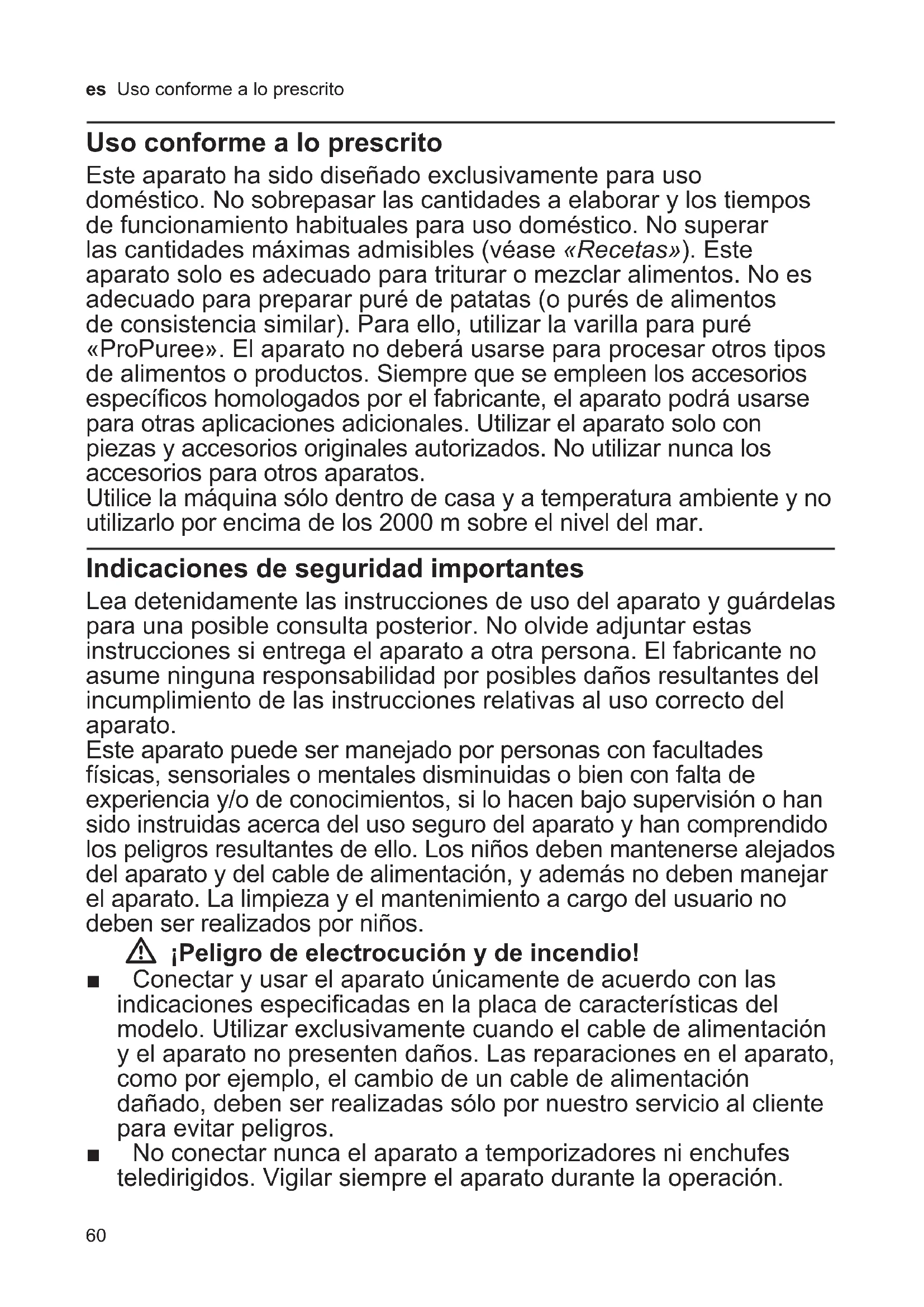 - Indicaciones de seguridad importantes ■ No coloque el aparato sobre o cerca de superficies calientes, como p. ej. placas eléctricas. ■ No sumergir nunca la unidad motriz en líquidos. No lavarla debajo del grifo de agua ni tampoco en el lavavajillas. ¡No utilizar limpiadoras de vapor! No usar el aparato con las manos húmedas. ■ Está prohibido continuar utilizando el aparato si se cae dentro del agua o de otro líquido. ■ ¡Sumergir el pie de la batidora en los alimentos como máximo hasta la marca Í, de lo contrario existe peligro de descarga eléctrica! ■ El aparato debe desconectarse siempre de la red eléctrica después de cada uso, cuando se vaya a dejar sin vigilancia, antes del montaje, desmontaje o limpieza y en caso de avería. W ¡Peligro de lesiones! ■ El aparato debe desconectarse siempre de la red eléctrica después de cada uso, cuando se vaya a dejar sin vigilancia, antes del montaje, desmontaje o limpieza y en caso de avería. ■ Tras desconectar el aparato, el accionamiento del mismo continúa girando durante unos instantes. Esperar a que el accionamiento se detenga completamente. ■ No tocar nunca la cuchilla. No limpiar nunca la cuchilla con las manos sin protección. W ¡Peligro de quemaduras! Tenga cuidado al trabajar con alimentos calientes. Los alimentos calientes podrían salpicar. W ¡Peligro de asfixia! No deje que los niños jueguen con el embalaje. W ¡Atención! ■ Se aconseja dejar el aparato conectado sólo el tiempo absolutamente indispensable para elaborar los alimentos. No usar el aparato en seco, sin alimentos. ■ El vaso de la batidora no es adecuado para usarlo en el horno microondas. ■ No colocar nunca el pie de la batidora sobre superficies calientes ni procesar con él tampoco alimentos muy calientes. Los alimentos que estén hirviendo deberán dejarse enfriar hasta una temperatura mínima de 80°C antes de procesarlos. En caso de usar la batidora en el interior de una cacerola, retirar ésta primero de la zona de cocción.62 es Indicaciones de seguridad importantes W ¡Importante! Es imprescindible limpiar en profundidad el aparato después de cada uso y después de que no se haya utilizado durante un tiempo prolongado. X «Cuidado y limpieza diaria» véase la página 64 Enhorabuena por la compra de su nuevo aparato de la casa Bosch. En nuestra página web encontrará más información sobre nuestros productos. Para utilizar este manual de instrucciones: pueden desplegarse las páginas con las instrucciones. En ellas encontrará ilustraciones con letras y números a los que se hace referencia en estas instrucciones (p. ej., X Secuencia de imágenes B). Contenido Uso conforme a lo prescrito p. 60