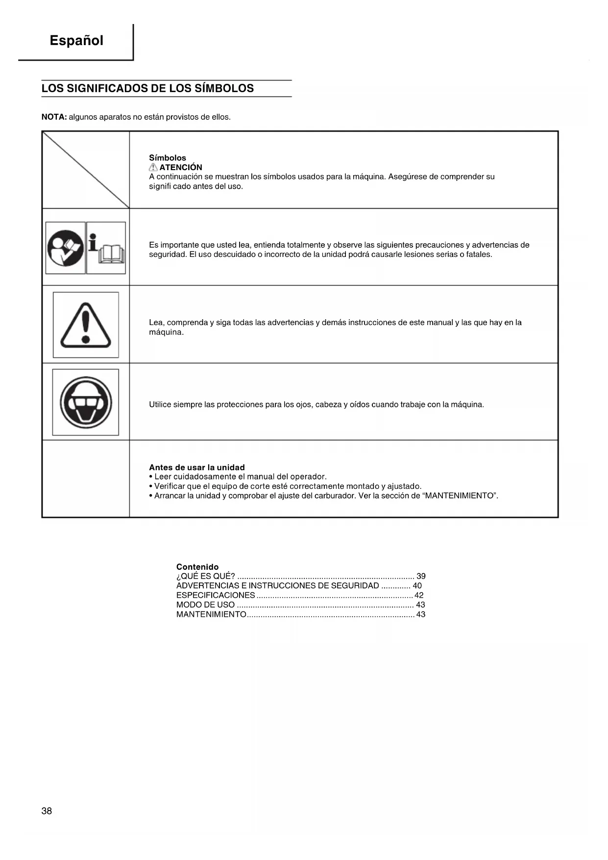 NOTA: algunos aparatos no están provistos de ellos. Símbolos ATENCIÓN A continuación se muestran los símbolos usados para la máquina. Asegúrese de comprender su signifi cado antes del uso. Es importante que usted lea, entienda totalmente y observe las siguientes precauciones y advertencias de seguridad. El uso descuidado o incorrecto de la unidad podrá causarle lesiones serias o fatales. Lea, comprenda y siga todas las advertencias y demás instrucciones de este manual y las que hay en la máquina. Utilice siempre las protecciones para los ojos, cabeza y oídos cuando trabaje con la máquina. Antes de usar la unidad