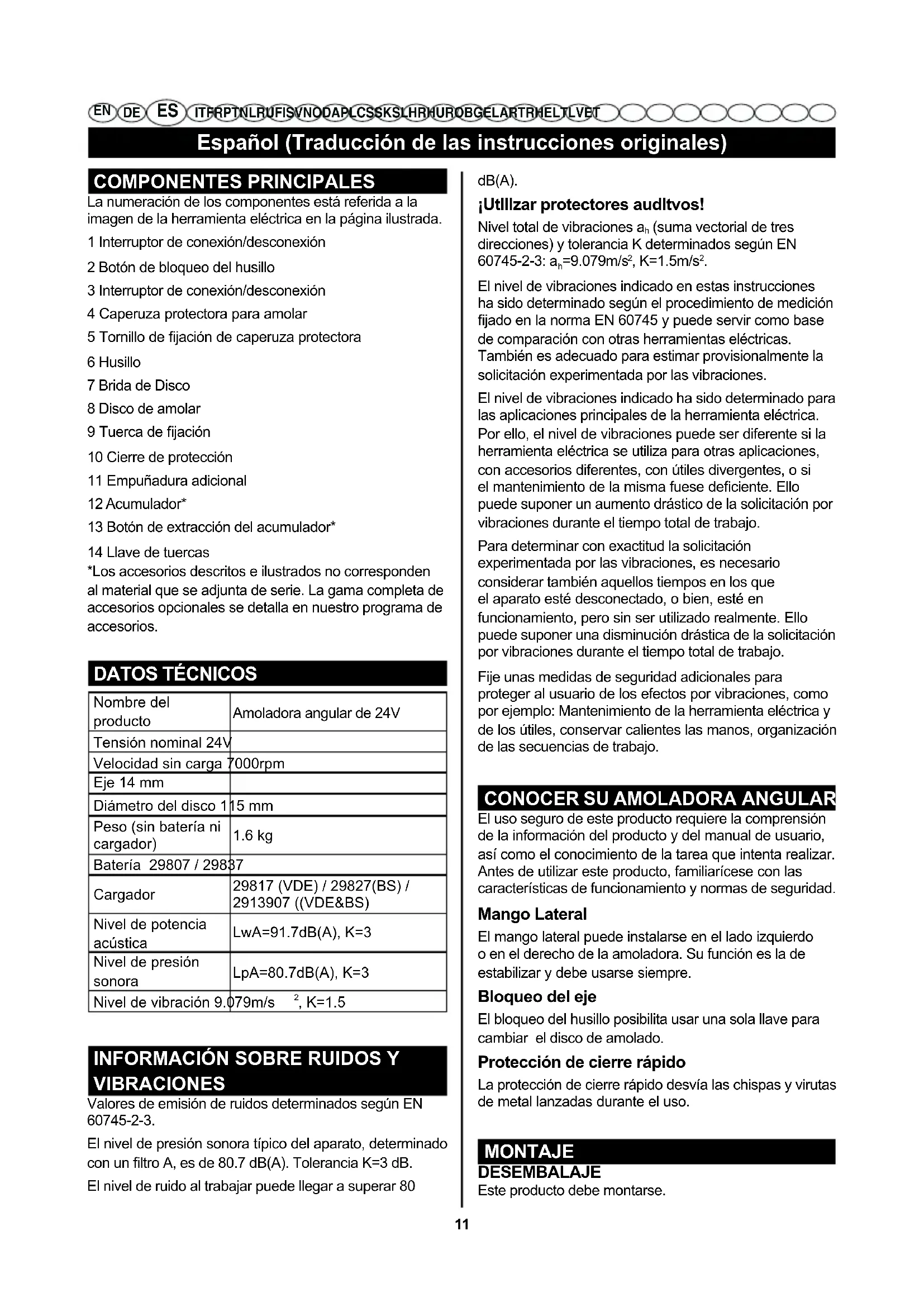 IT FR PT NL RU FI SV NO DA PL CS SK SL HR HU RO BG EL AR TR HE LT LV ET COMPONENTES PRINCIPALES La numeración de los componentes está referida a la imagen de la herramienta eléctrica en la página ilustrada. 1 Interruptor de conexión/desconexión 2 Botón de bloqueo del husillo 3 Interruptor de conexión/desconexión 4 Caperuza protectora para amolar 5 Tornillo de jación de caperuza protectora 6 Husillo 7 Brida de Disco 8 Disco de amolar 9 Tuerca de jación 10 Cierre de protección 11 Empuñadura adicional 12 Acumulador* 13 Botón de extracción del acumulador* 14 Llave de tuercas *Los accesorios descritos e ilustrados no corresponden al material que se adjunta de serie. La gama completa de accesorios opcionales se detalla en nuestro programa de accesorios.