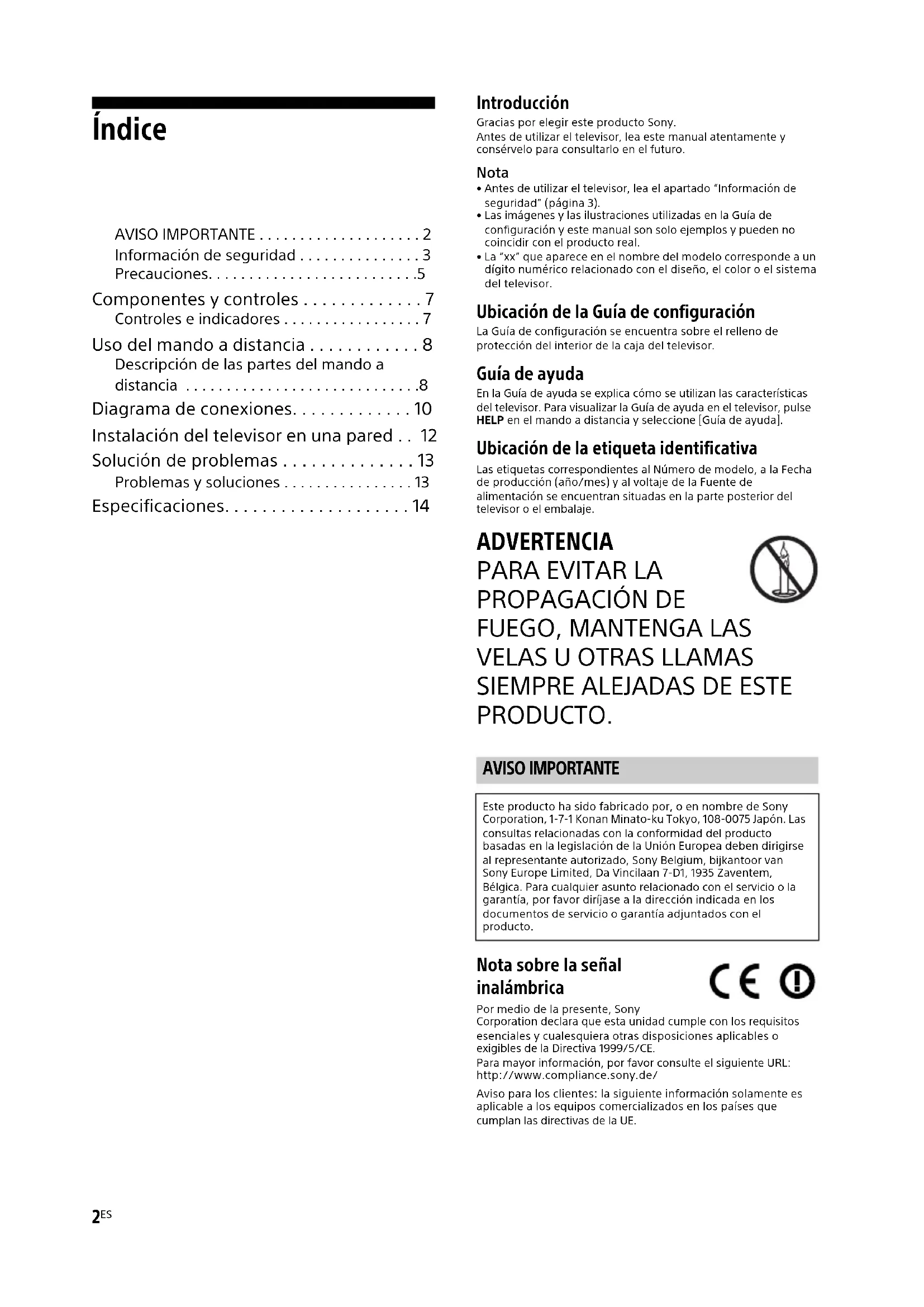 - Especificaciones Introducción Gracias por elegir este producto Sony. Antes de utilizar el televisor, lea este manual atentamente y consérvelo para consultarlo en el futuro. Nota p. 14