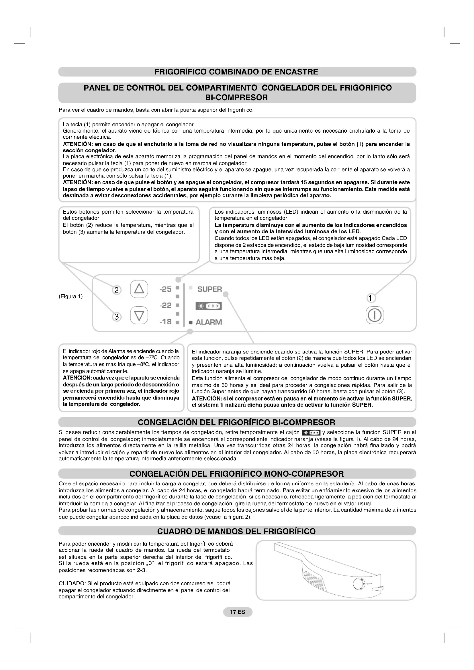 Para poder encender y modifi car la temperatura del frigorífi co deberá accionar la rueda del cuadro de mandos. La rueda del termostato est situada en la parte superior derecha del interior del frigorífi co. Si la rueda está en la posición „0“, el frigorífi co estará apagado. Las posiciones recomendadas son 2-3. CUIDADO: Si el producto está equipado con dos compresores, podrá apagar el congelador actuando directmente en el panel de control del compartimento del congelador. Estos botones permiten seleccionar la temperatura del congelador. El botón (2) reduce la temperatura, mientras que el botón (3) aumenta la temperatura del congelador. El indicador rojo de Alarma se enciende cuando la temperatura del congelador es de –7ºC. Cuando la temperatura es más fría que –8ºC, el indicador se apaga automáticamente. ATENCIÓN: cada vez que el aparato se encienda después de un largo período de desconexión o se encienda por primera vez, el indicador rojo permanecerá encendido hasta que disminuya la temperatura del congelador. El indicador naranja se enciende cuando se activa la función SUPER. Para poder activar esta función, pulse repetidamente el botón (2) de manera que todos los LED se enciendan y presenten una alta luminosidad; a continuación vuelva a pulsar el botón hasta que el indicador naranja se ilumine. Esta función alimenta el compresor del congelador de modo continuo durante un tiempo máximo de 50 horas y es ideal para proceder a congelaciones rápidas. Para salir de la función Super antes de que hayan transcurrido 50 horas, basta con pulsar el botón (3). ATENCIÓN: si el compresor está en pausa en el momento de activar la función SUPER, el sistema fi nalizará dicha pausa antes de activar la función SUPER. 17 ES Los indicadores luminosos (LED) indican el aumento o la disminución de la temperatura en el congelador. La temperatura disminuye con el aumento de los indicadores encendidos y con el aumento de la intensidad luminosa de los LED. Cuando todos los LED están apagados, el congelador está apagado Cada LED dispone de 2 estados de encendido, el estado de baja luminosidad corresponde a una temperatura intermedia, mientras que una alta luminosidad corresponde a una temperatura más baja. La tecla (1) permite encender o apagar el congelador. Generalmente, el aparato viene de fábrica con una temperatura intermedia, por lo que únicamente es necesario enchufarlo a la toma de corrinente eléctrica. ATENCIÓN: en caso de que al enchufarlo a la toma de red no visualizara ninguna temperatura, pulse el botón (1) para encender la sección congelador. La placa electrónica de este aparato memoriza la programación del panel de mandos en el momento del encendido, por lo tanto sólo será necesario pulsar la tecla (1) para poner de nuevo en marcha el congelador. En caso de que se produzca un corte del suministro eléctrico y el aparato se apague, una vez recuperada la corriente el aparato se volverá a poner en marcha con sólo pulsar la tecla (1). ATENCIÓN: en caso de que pulse el botón y se apague el congelador, el compresor tardará 15 segundos en apagarse. Si durante este lapso de tiempo vuelve a pulsar el botón, el aparato seguirá funcionando sin que se interrumpa su funcionamiento. Esta medida está destinada a evitar desconexiones accidentales, por ejemplo durante la limpieza periódica del aparato.