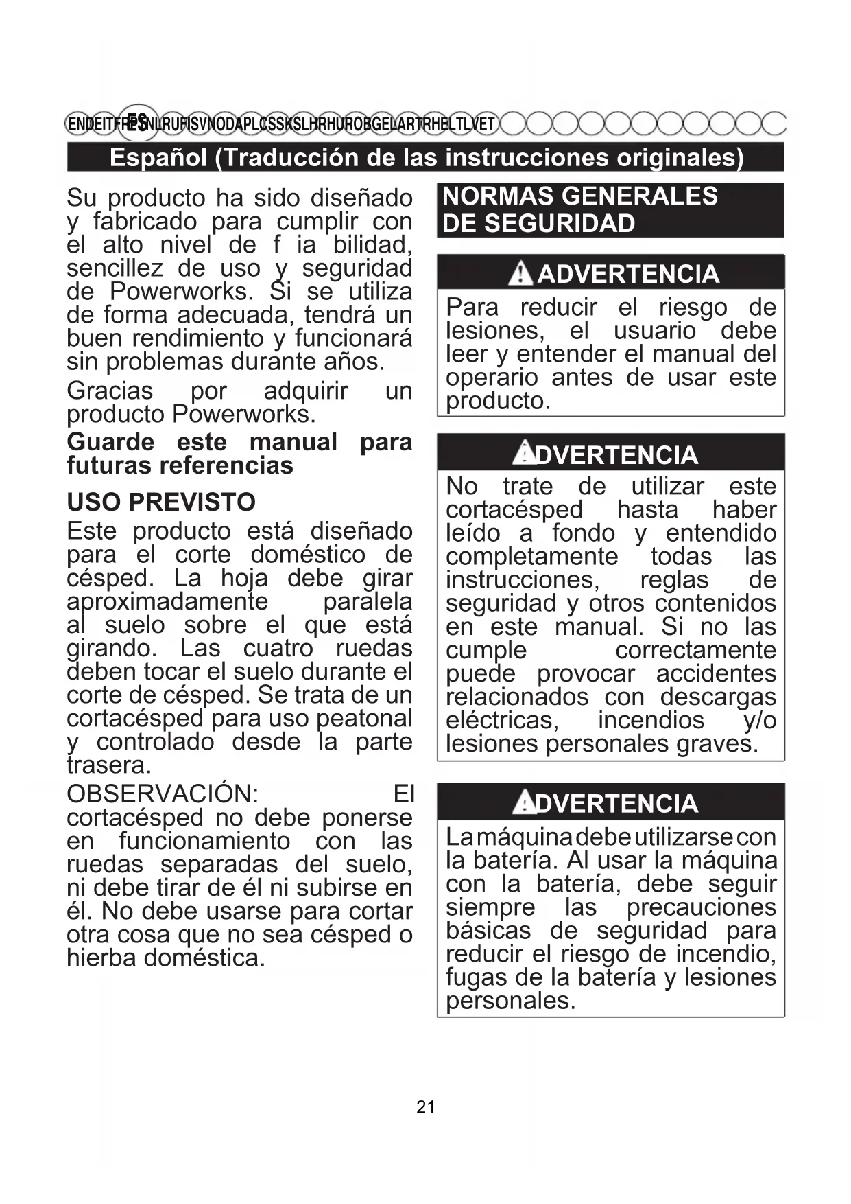EN DE IT FR PT NL RU FI SV NO DA PL CS SK SL HR HU RO BG EL AR TR HE LT LV ET Su producto ha sido diseñado y fabricado para cumplir con el alto nivel de f ia bilidad, sencillez de uso y seguridad de Powerworks. Si se utiliza de forma adecuada, tendrá un buen rendimiento y funcionará sin problemas durante años. Gracias por adquirir un producto Powerworks. Guarde este manual para futuras referencias USO PREVISTO Este producto está diseñado para el corte doméstico de césped. La hoja debe girar aproximadamente paralela al suelo sobre el que está girando. Las cuatro ruedas deben tocar el suelo durante el corte de césped. Se trata de un cortacésped para uso peatonal y controlado desde la parte trasera. OBSERVACIÓN: El cortacésped no debe ponerse en funcionamiento con las ruedas separadas del suelo, ni debe tirar de él ni subirse en él. No debe usarse para cortar otra cosa que no sea césped o hierba doméstica. NORMAS GENERALES DE SEGURIDAD ADVERTENCIA Para reducir el riesgo de lesiones, el usuario debe leer y entender el manual del operario antes de usar este producto. ADVERTENCIA No trate de utilizar este cortacésped hasta haber leído a fondo y entendido completamente todas las instrucciones, reglas de seguridad y otros contenidos en este manual. Si no las cumple correctamente puede provocar accidentes relacionados con descargas eléctricas, incendios y/o lesiones personales graves. ADVERTENCIA La máquina debe utilizarse con la batería. Al usar la máquina con la batería, debe seguir siempre las precauciones básicas de seguridad para reducir el riesgo de incendio, fugas de la batería y lesiones personales. 21Español (Traducción de las instrucciones originales)