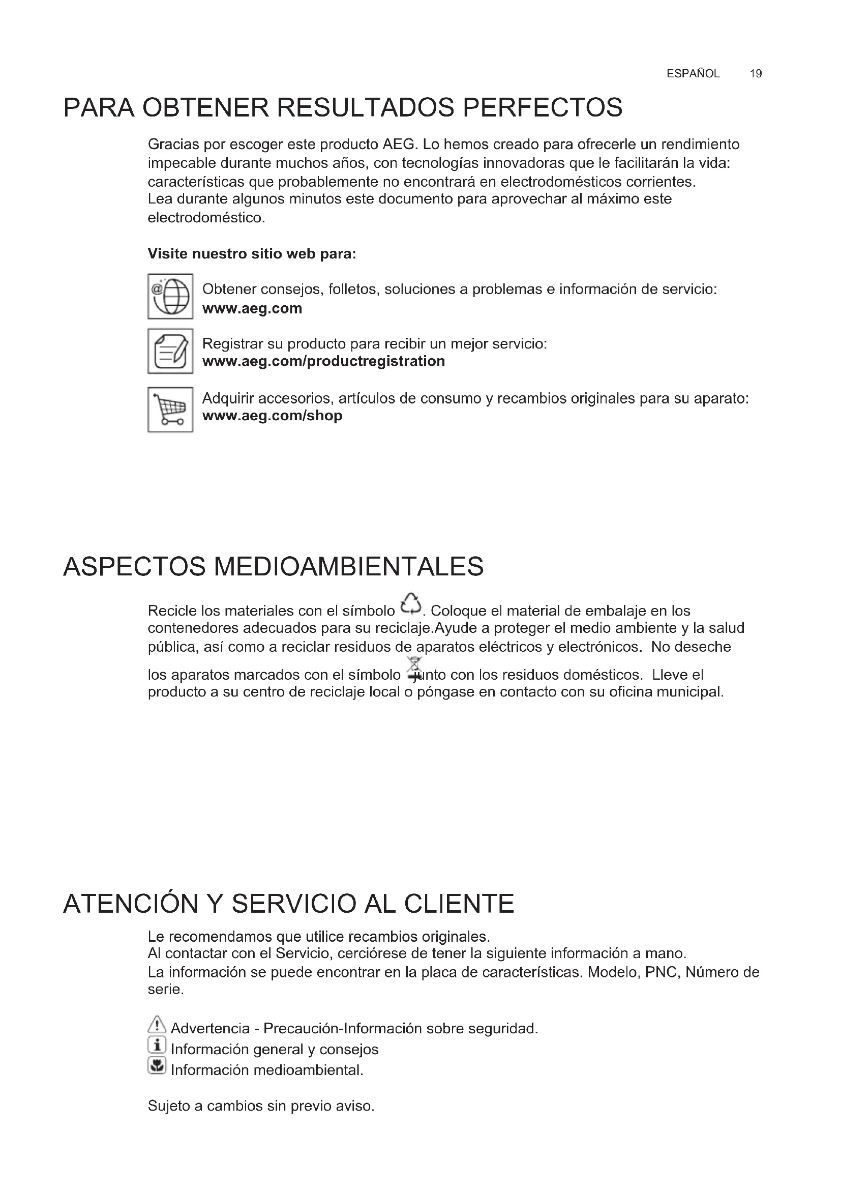 Gracias por escoger este producto AEG. Lo hemos creado para ofrecerle un rendimiento impecable durante muchos años, con tecnologías innovadoras que le facilitarán la vida: características que probablemente no encontrará en electrodomésticos corrientes. Lea durante algunos minutos este documento para aprovechar al máximo este electrodoméstico. Visite nuestro sitio web para: Obtener consejos, folletos, soluciones a problemas e información de servicio: www.aeg.com Registrar su producto para recibir un mejor servicio: www.aeg.com/productregistration Adquirir accesorios, artículos de consumo y recambios originales para su aparato: www.aeg.com/shop ASPECTOS MEDIOAMBIENTALES Recicle los materiales con el símbolo . Coloque el material de embalaje en los contenedores adecuados para su reciclaje.Ayude a proteger el medio ambiente y la salud pública, así como a reciclar residuos de aparatos eléctricos y electrónicos. No deseche los aparatos marcados con el símbolo junto con los residuos domésticos. Lleve el producto a su centro de reciclaje local o póngase en contacto con su ofi cina municipal.