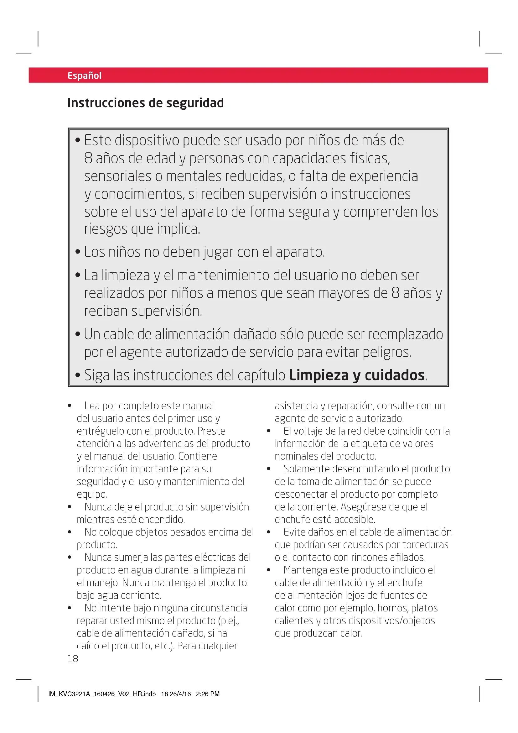 - Mantenga este producto incluido el cable de alimentación y el enchufe de alimentación lejos de fuentes de calor como por ejemplo, hornos, platos calientes y otros dispositivos/objetos que produzcan calor. IM_KVC3221A_160426_V02_HR.indb 18 26/4/16 2:26 PMEspañol
