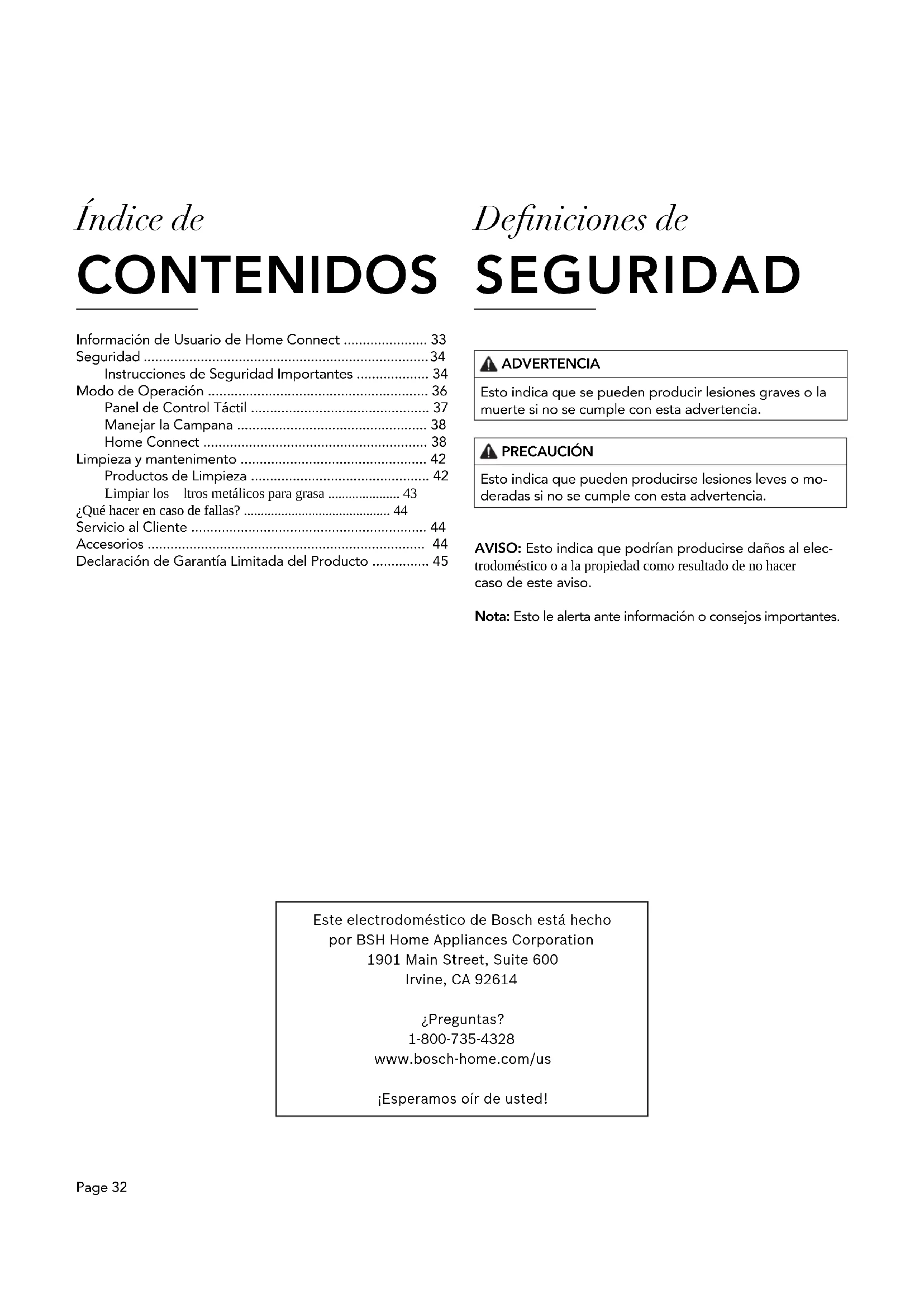 ADVERTENCIA Esto indica que se pueden producir lesiones graves o la muerte si no se cumple con esta advertencia. PRECAUCIÓN Esto indica que pueden producirse lesiones leves o mo- deradas si no se cumple con esta advertencia. AVISO: Esto indica que podrían producirse daños al elec- trodoméstico o a la propiedad como resultado de no hacer caso de este aviso. Nota: Esto le alerta ante información o consejos importantes. Este electrodoméstico de Bosch está hecho por BSH Home Appliances Corporation 1901 Main Street, Suite 600 Irvine, CA 92614 ¿Preguntas? 1-800-735-4328 www.bosch-home.com/us ¡Esperamos oír de usted!Page 33 Información de usuario de Home Connect FCC/IC CMIIT ID: 2017AJ4134 (M) FCC: 2AHES-COM2 IC: 21152-COM2 Modulo Wi-Fi
