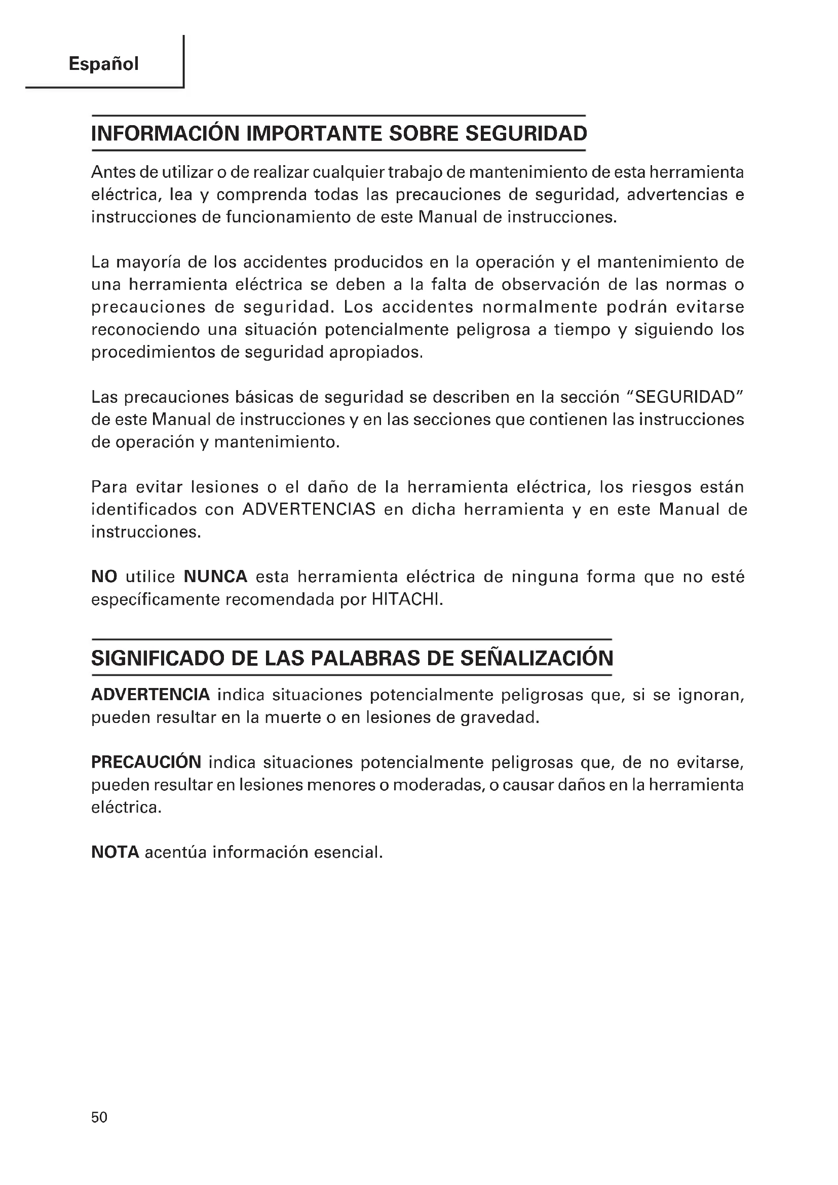 Antes de utilizar o de realizar cualquier trabajo de mantenimiento de esta herramienta eléctrica, lea y comprenda todas las precauciones de seguridad, advertencias e instrucciones de funcionamiento de este Manual de instrucciones. La mayoría de los accidentes producidos en la operación y el mantenimiento de una herramienta eléctrica se deben a la falta de observación de las normas o precauciones de seguridad. Los accidentes normalmente podrán evitarse reconociendo una situación potencialmente peligrosa a tiempo y siguiendo los procedimientos de seguridad apropiados. Las precauciones básicas de seguridad se describen en la sección “SEGURIDAD” de este Manual de instrucciones y en las secciones que contienen las instrucciones de operación y mantenimiento. Para evitar lesiones o el daño de la herramienta eléctrica, los riesgos están identificados con ADVERTENCIAS en dicha herramienta y en este Manual de instrucciones. NO utilice NUNCA esta herramienta eléctrica de ninguna forma que no esté específicamente recomendada por HITACHI. SIGNIFICADO DE LAS PALABRAS DE SEÑALIZACIÓN ADVERTENCIA indica situaciones potencialmente peligrosas que, si se ignoran, pueden resultar en la muerte o en lesiones de gravedad. PRECAUCIÓN indica situaciones potencialmente peligrosas que, de no evitarse, pueden resultar en lesiones menores o moderadas, o causar daños en la herramienta eléctrica. NOTA acentúa información esencial.Español