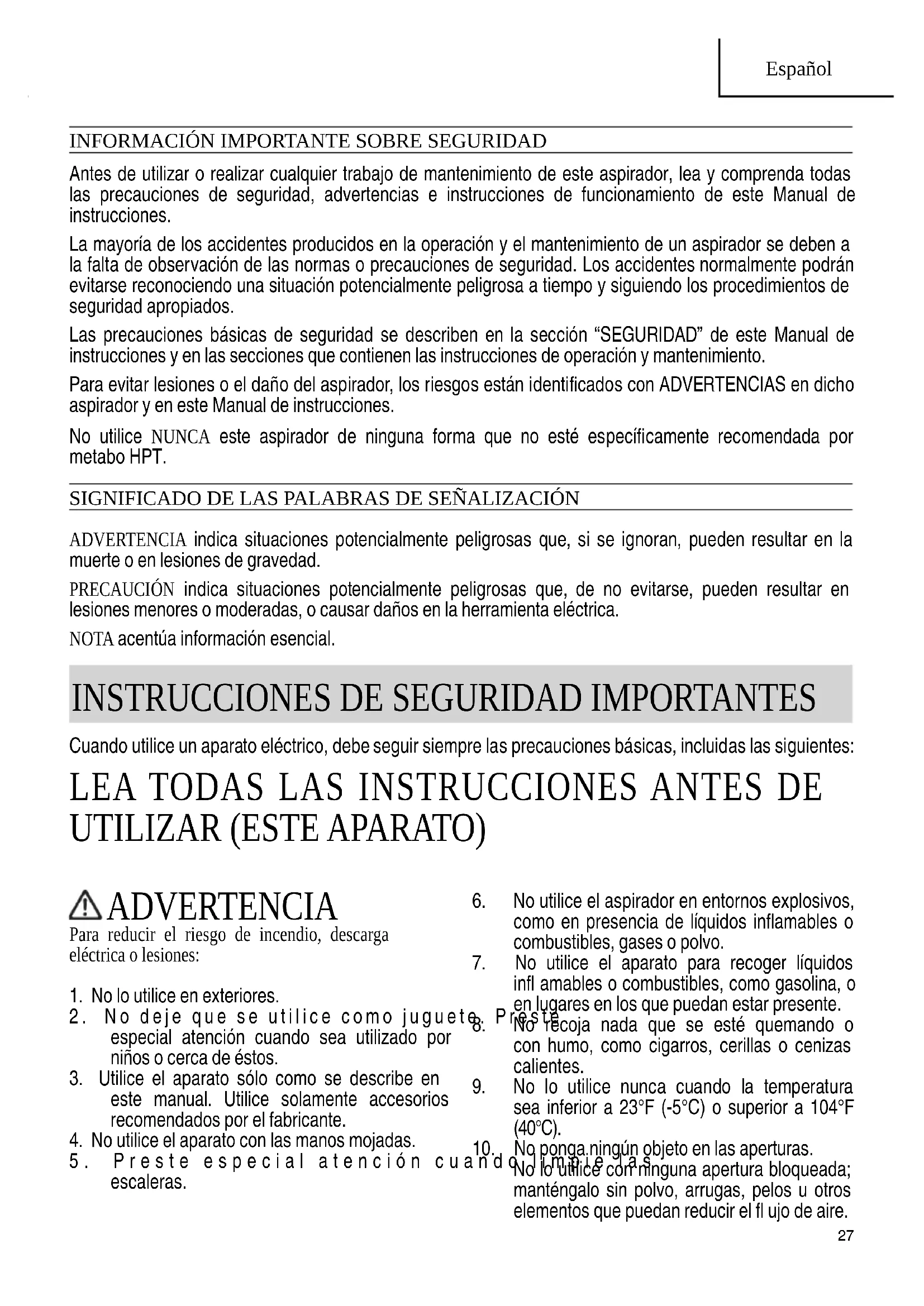 Para evaporar lesiones o el dano del aspirador, los riesgos estan identificados con ADVERTENCIAS en dato aspirador y en este Manual de instrucciones.