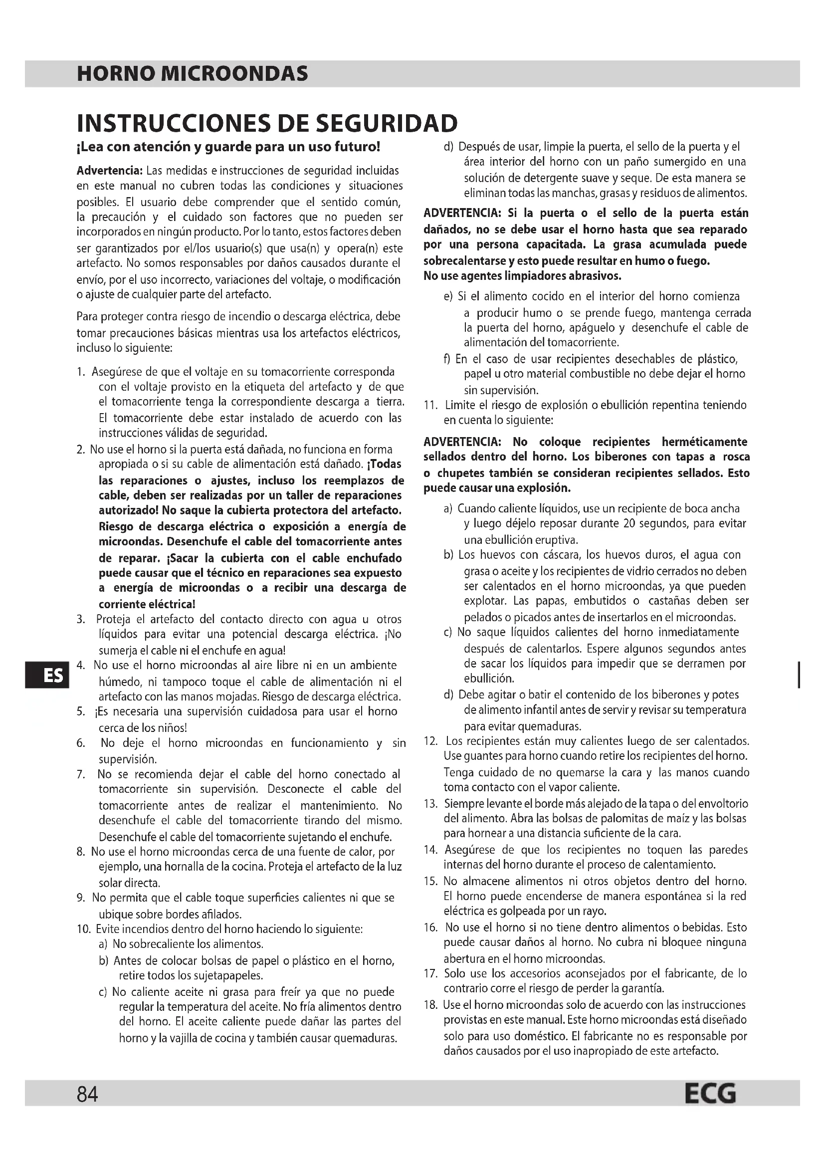 Use el horno microondas solo de acuerdo con las instrucciones provistas en este manual. Este horno microondas está diseñado solo para uso doméstico. El fabricante no es responsable por daños causados por el uso inapropiado de este artefacto.