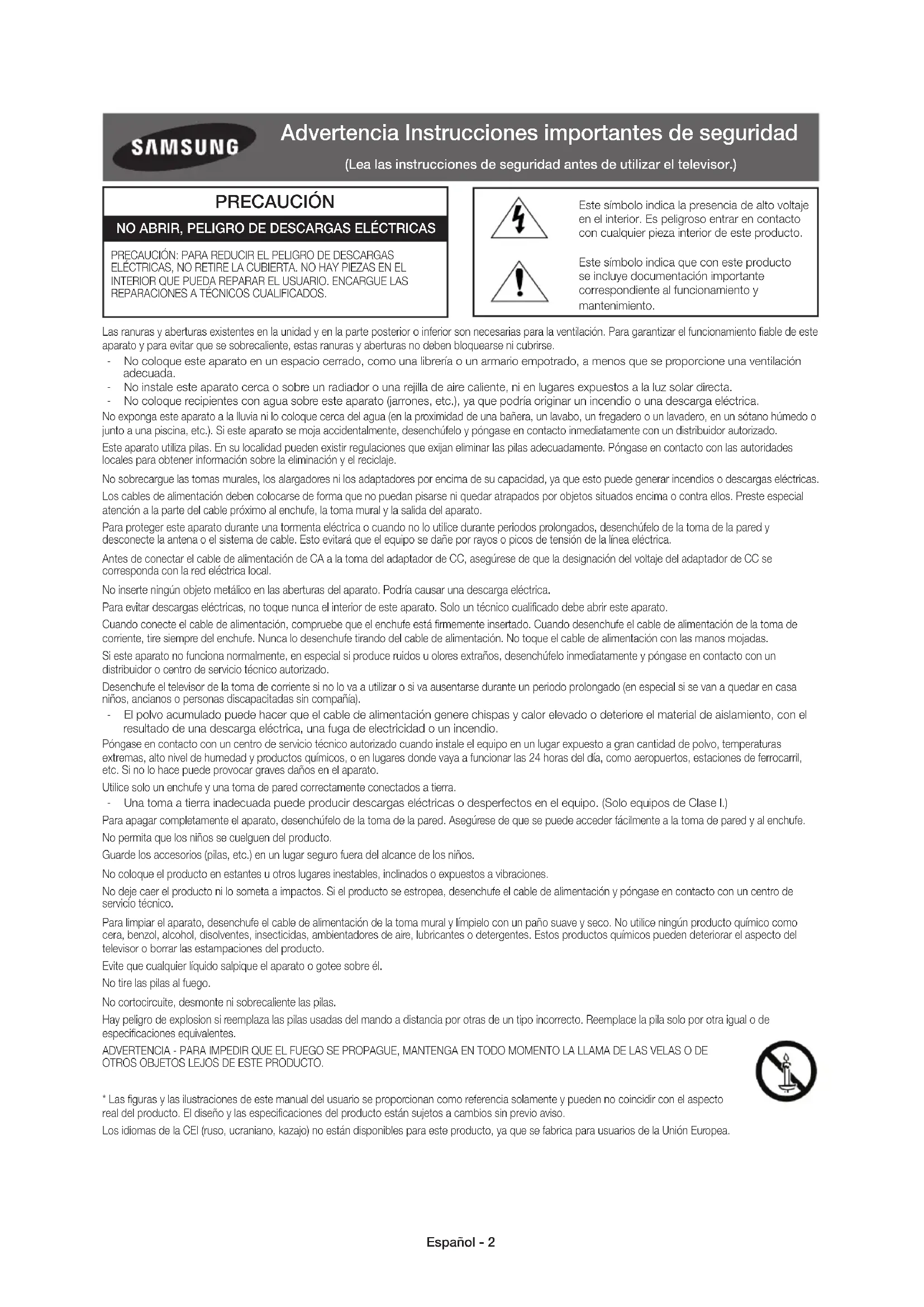 Nombre del modelo UE40JU6510 / UE40JU6610 UE48JU6510 / UE48JU6610 Tamaño de pantalla (diagonal) 40 pulgadas (101 cm) 48 pulgadas (121 cm) Curvatura de la pantalla 3,000R Sonido (salida) 20 W (L: 10 W, R: 10 W) Dimensiones (an. x al. x pr.) Cuerpo principal Con el soporte 918,5 x 534,0 x 104,2 mm 918,5 x 588,5 x 294,8 mm 1084,8 x 628,9 x 117,6 mm 1084,8 x 682,7 x 308,6 mm Peso Sin el soporte Con el soporte 8,0 kg 10,1 kg 11,3 kg 14,2 kg Nombre del modelo UE55JU6510 / UE55JU6610 Tamaño de pantalla (diagonal) 55 pulgadas (138 cm) Curvatura de la pantalla 4,200R Sonido (salida) 20 W (L: 10 W, R: 10 W) Dimensiones (an. x al. x pr.) Cuerpo principal Con el soporte 1241,7 x 715,3 x 111,9 mm 1241,7 x 770,7 x 308,6 mm Peso Sin el soporte Con el soporte 16,2 kg 19,1 kg - El diseño y las especificaciones pueden cambiar sin previo aviso. - Para obtener información sobre la fuente de alimentación y el consumo de energía, consulte la etiqueta adherida al producto. - El consumo de energía normal se mide de acuerdo con IEC 62087 Ed.2 Reducción del consumo de energía El televisor entra en modo de espera cuando se apaga. Cuando está en modo de espera, sigue consumiendo una pequeña cantidad de energía. Para reducir el consumo de energía, desenchufe el cable de alimentación si no tiene intención de utilizarlo durante un periodo largo. Español - 13 Español [JU6570-TK]BN68-07200J-00L04.indb 13 2015-03-02 오후 1:16:43Licencias The terms HDMI and HDMI High-Definition Multimedia Interface, and the HDMI Logo are trademarks or registered trademarks of HDMI Licensing LLC in the United States and other countries. Recomendación - Solo UE Por el presente documento Samsung Electronics declara que este televisor cumple con los requisitos esenciales y otras disposiciones relevantes de la Directiva 1999/5/CE. La Declaración de conformidad oficial se puede encontrar en http://www.samsung.com/es. Vaya a Atención al cliente > Soporte para productos e introduzca el nombre del modelo. Este equipo solo se debe utilizar en interiores. Este equipo puede funcionar en todos los países de la UE. Correcta eliminación del producto (desechos de equipos eléctricos y electrónicos) (Aplicable en países con sistemas de recogida selectiva) Esta marca en el producto, los accesorios o la documentación indica que el producto y los accesorios electrónicos (como cargador, auriculares, cable USB) no se deben desechar junto con los residuos domésticos al final de su vida útil. Para prevenir posibles daños al medio ambiente o a la salud de las personas por una eliminación incontrolada, cuando decida desprenderse del aparato debe acudir a un centro de reciclaje donde se promueva la reutilización sostenible de los recursos materiales. Los usuarios particulares pueden ponerse en contacto con el comercio donde adquirieron el aparato o con su oficina municipal donde le informarán de dónde debe depositar el electrodoméstico para su reciclaje. Los comerciantes deben ponerse en contacto con el distribuidor y comprobar los términos y las condiciones del contrato de compra. Este producto y sus accesorios electrónicos no se deben mezclar con otros deshechos comerciales para su eliminación. Correcta eliminación de las pilas de este producto (Aplicable en países con sistemas de recogida selectiva) Esta marca en las pilas, el manual o el embalaje indica que las pilas de este producto no se deben desechar junto con los residuos domésticos al término de su vida útil. Cuando está indicado, los símbolos químicos Hg, Cd o Pb indican que las pilas contienen mercurio, cadmio o plomo que superan los niveles de referencia de la directiva CE 2006/66. Si las pilas no se eliminan adecuadamente, estas sustancias pueden causar daños a la salud humana y al medio ambiente. Para proteger los recursos naturales y promover la reutilización de los materiales, separe la pilas de otros tipos de residuos domésticos y recíclelas en su sistema local de recogida gratuita de pilas. Español - 14 [JU6570-TK]BN68-07200J-00L04.indb 14 2015-03-02 오후 1:16:43This page is intentionally left blank. [JU6570-TK]BN68-07200J-00L04.indb 15 2015-03-02 오후 1:16:43This page is intentionally left blank. [JU6570-TK]BN68-07200J-00L04.indb 16 2015-03-02 오후 1:16:43This page is intentionally left blank. [JU6570-TK]BN68-07200J-00L04.indb 17 2015-03-02 오후 1:16:44Contact SAMSUNG WORLD WIDE If you have any questions or comments relating to Samsung products, please contact the SAMSUNG customer care centre. Country Customer Care Centre Web Site AUSTRIA 0800 - SAMSUNG (0800 - 7267864) www.samsung.com/at/support BELGIUM 02-201-24-18 www.samsung.com/be/support (Dutch) www.samsung.com/be_fr/support (French) BOSNIA 051 331 999 www.samsung.com/support BULGARIA 800 111 31 , Безплатна телефонна линия www.samsung.com/bg/support CROATIA 072 726 786 www.samsung.com/hr/support CZECH 800 - SAMSUNG (800-726786) www.samsung.com/cz/support Samsung Electronics Czech and Slovak, s.r.o. V Parku 2343/24, 148 00 - Praha 4 DENMARK 70 70 19 70 www.samsung.com/dk/support FINLAND 030-6227 515 www.samsung.com/fi/support FRANCE 01 48 63 00 00 www.samsung.com/fr/support GERMANY 0180 6 SAMSUNG bzw. 0180 6 7267864* (*0,20 €/Anruf aus dem dt. Festnetz, aus dem Mobilfunk max. 0,60 €/Anruf) www.samsung.com/de/support CYPRUS 8009 4000 only from landline, toll free www.samsung.com/gr/support GREECE 80111-SAMSUNG (80111 726 7864) only from land line (+30) 210 6897691 from mobile and land line HUNGARY 0680SAMSUNG (0680-726-786) 0680PREMIUM (0680-773-648) http://www.samsung.com/hu/support ITALIA 800-SAMSUNG (726-7864) www.samsung.com/it/support LUXEMBURG 261 03 710 www.samsung.com/support MONTENEGRO 020 405 888 www.samsung.com/support SLOVENIA 080 697 267