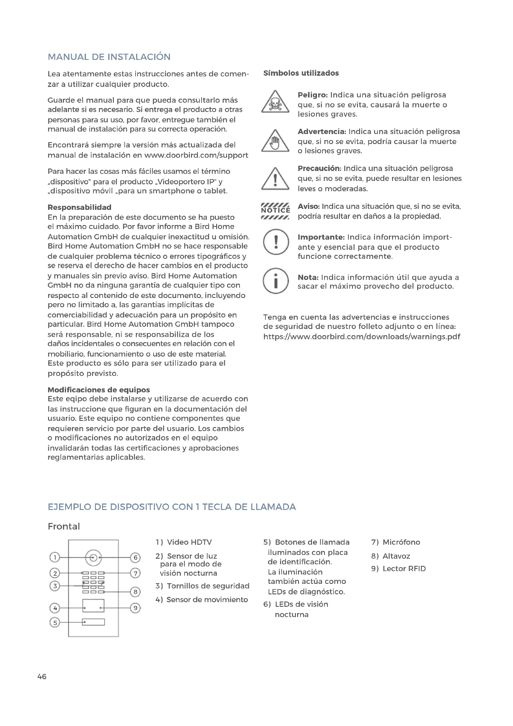 Lea atentamente estas instrucciones antes de comen- zar a utilizar cualquier producto. Guarde el manual para que pueda consultarlo más adelante si es necesario. Si entrega el producto a otras personas para su uso, por favor, entregue también el manual de instalación para su correcta operación. Encontrará siempre la versión más actualizada del manual de instalación en www.doorbird.com/support Para hacer las cosas más fáciles usamos el término „dispositivo“ para el producto „Videoportero IP“ y „dispositivo móvil „para un smartphone o tablet. Responsabilidad En la preparación de este documento se ha puesto el máximo cuidado. Por favor informe a Bird Home Automation GmbH de cualquier inexactitud u omisión. Bird Home Automation GmbH no se hace responsable de cualquier problema técnico o errores tipográficos y se reserva el derecho de hacer cambios en el producto y manuales sin previo aviso. Bird Home Automation GmbH no da ninguna garantía de cualquier tipo con respecto al contenido de este documento, incluyendo pero no limitado a, las garantías implícitas de comerciabilidad y adecuación para un propósito en particular. Bird Home Automation GmbH tampoco será responsable, ni se responsabiliza de los daños incidentales o consecuentes en relación con el mobiliario, funcionamiento o uso de este material. Este producto es sólo para ser utilizado para el propósito previsto. Modificaciones de equipos Este eqipo debe instalarse y utilizarse de acuerdo con las instruccione que figuran en la documentación del usuario. Este equipo no contiene componentes que requieren servicio por parte del usuario. Los cambios o modificaciones no autorizados en el equipo invalidarán todas las certificaciones y aprobaciones reglamentarias aplicables. Precaución: Indica una situación peligrosa que, si no se evita, puede resultar en lesiones leves o moderadas. Peligro: Indica una situación peligrosa que, si no se evita, causará la muerte o lesiones graves. Advertencia: Indica una situación peligrosa que, si no se evita, podría causar la muerte o lesiones graves. Aviso: Indica una situación que, si no se evita, podría resultar en daños a la propiedad. Nota: Indica información útil que ayuda a sacar el máximo provecho del producto. NOTICE Importante: Indica información import- ante y esencial para que el producto funcione correctamente. Tenga en cuenta las advertencias e instrucciones de seguridad de nuestro folleto adjunto o en línea: https://www.doorbird.com/downloads/warnings.pdf
