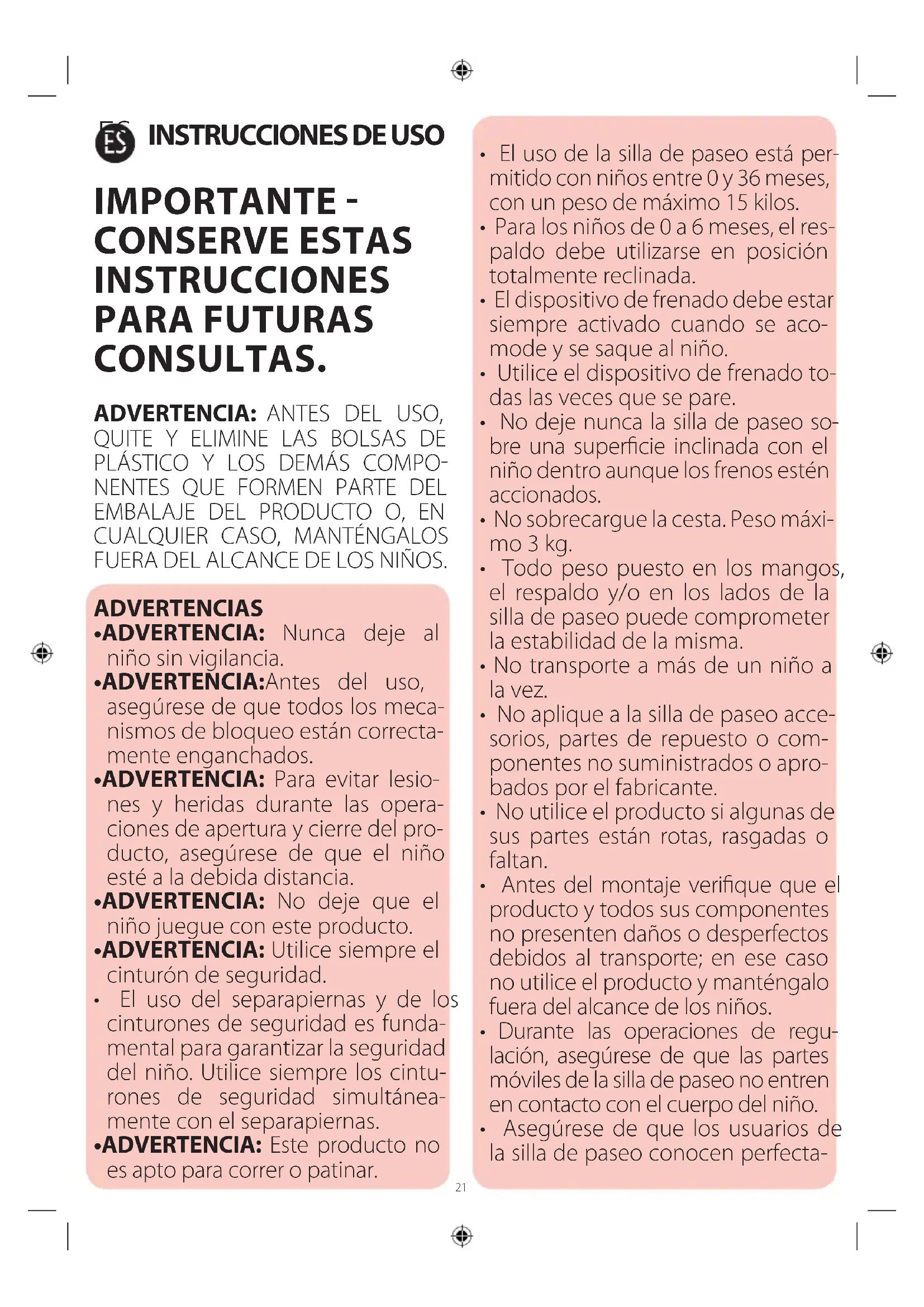 - El uso de la silla de paseo está per- mitido con niños entre 0 y 36 meses, con un peso de máximo 15 kilos.