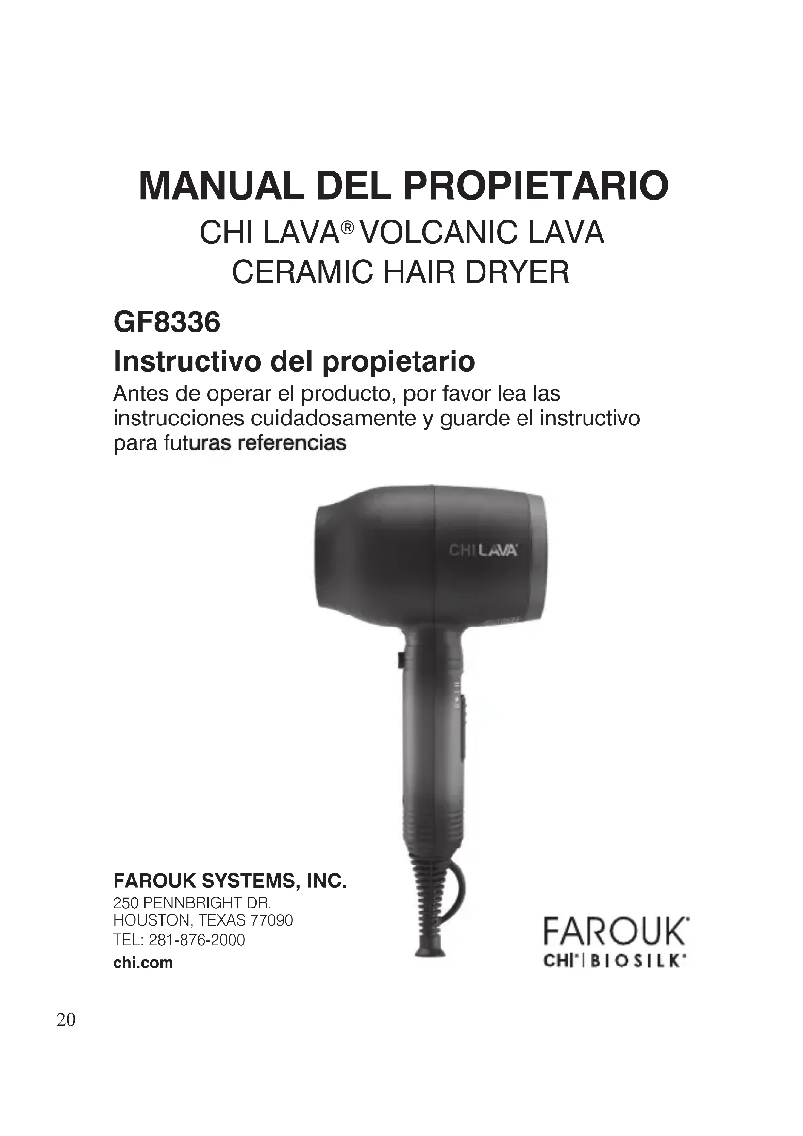 LAVA GF8336 - Secador de pelo CHI - Manual de uso y guía de instrucciones gratis