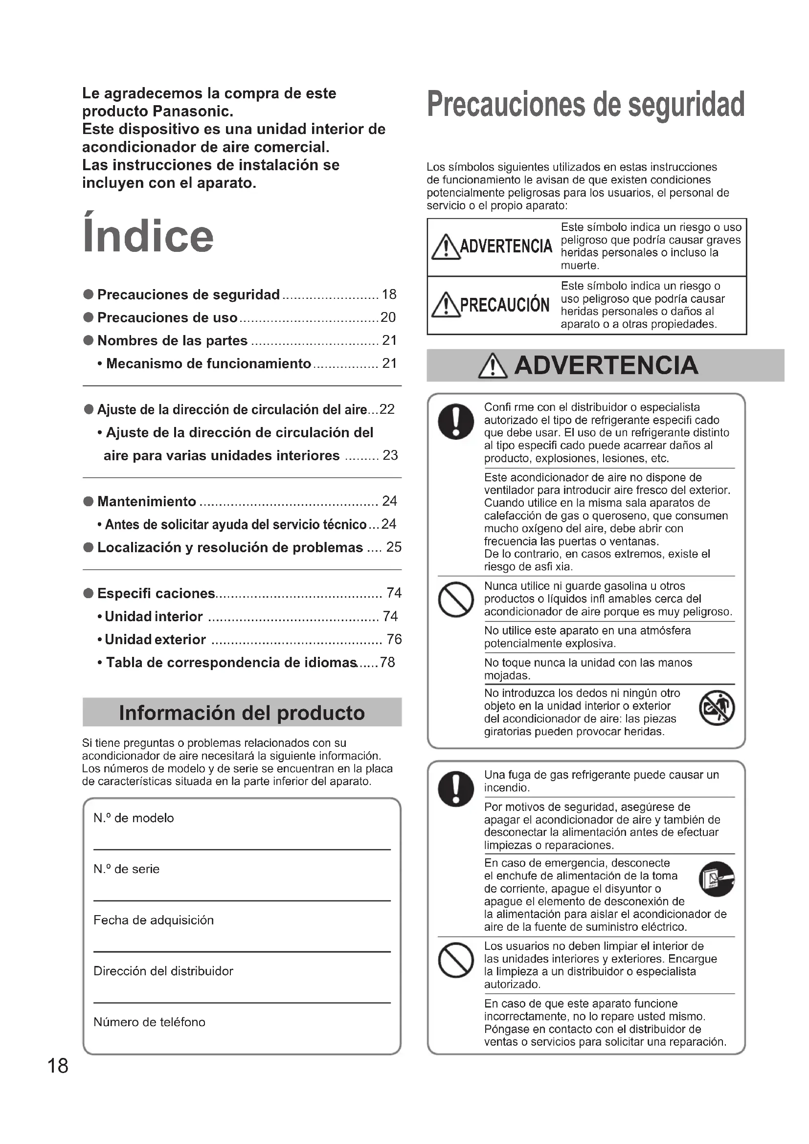 - • Tabla de correspondencia de idiomas Índice Precauciones de seguridad Información del producto Si tiene preguntas o problemas relacionados con su acondicionador de aire necesitará la siguiente información. Los números de modelo y de serie se encuentran en la placa de características situada en la parte inferior del aparato.N.º de modelo N.º de serie Fecha de adquisiciónDirección del distribuidorNúmero de teléfonoConfi rme con el distribuidor o especialista autorizado el tipo de refrigerante especifi cado que debe usar. El uso de un refrigerante distinto al tipo especifi cado puede acarrear daños al producto, explosiones, lesiones, etc.Este acondicionador de aire no dispone de ventilador para introducir aire fresco del exterior. Cuando utilice en la misma sala aparatos de calefacción de gas o queroseno, que consumen mucho oxígeno del aire, debe abrir con frecuencia las puertas o ventanas. De lo contrario, en casos extremos, existe el riesgo de asfi xia.Nunca utilice ni guarde gasolina u otros productos o líquidos infl amables cerca del acondicionador de aire porque es muy peligroso.No utilice este aparato en una atmósfera potencialmente explosiva.No toque nunca la unidad con las manos mojadas.No introduzca los dedos ni ningún otro objeto en la unidad interior o exterior del acondicionador de aire: las piezas giratorias pueden provocar heridas.Una fuga de gas refrigerante puede causar un incendio.Por motivos de seguridad, asegúrese de apagar el acondicionador de aire y también de desconectar la alimentación antes de efectuar limpiezas o reparaciones.En caso de emergencia, desconecte el enchufe de alimentación de la toma de corriente, apague el disyuntor o apague el elemento de desconexión de la alimentación para aislar el acondicionador de aire de la fuente de suministro eléctrico.Los usuarios no deben limpiar el interior de las unidades interiores y exteriores. Encargue la limpieza a un distribuidor o especialista autorizado.En caso de que este aparato funcione incorrectamente, no lo repare usted mismo. Póngase en contacto con el distribuidor de ventas o servicios para solicitar una reparación.Los símbolos siguientes utilizados en estas instrucciones de funcionamiento le avisan de que existen condiciones potencialmente peligrosas para los usuarios, el personal de servicio o el propio aparato: ADVERTENCIA Este símbolo indica un riesgo o uso peligroso que podría causar graves heridas personales o incluso la muerte. PRECAUCIÓN Este símbolo indica un riesgo o uso peligroso que podría causar heridas personales o daños al aparato o a otras propiedades. ADVERTENCIA Le agradecemos la compra de este producto Panasonic.Este dispositivo es una unidad interior de acondicionador de aire comercial.Las instrucciones de instalación se incluyen con el aparato. OI00F569616EU.indb18OI00F569616EU.indb18 2014/02/289:31:082014/02/289:31:0819 ESPAÑOL Este aparato está pensado para ser utilizado por expertos o usuarios con la cualifi cación necesaria en tiendas, en la industria ligera y en granjas, o por no expertos en usos comerciales. Este dispositivo podrá ser utilizado por niños de más de 8 años y por personas con capacidades físicas, sensoriales o mentales reducidas o con falta de experiencia y conocimientos, siempre que estén bajo supervisión o hayan recibido instrucciones relativas al uso seguro del dispositivo y comprendan los riesgos que dicho uso conlleva. Instale la alarma contra incendios y la salida de aire a una distancia mínima de 1,5 m de la unidad. No caliente ni enfríe demasiado la sala si en ella se encuentran bebés o personas discapacitadas. No apague ni encienda el acondicionador de aire con el interruptor de alimentación. Utilice para ello el botón de operación de encendido/apagado (ON/ OFF). No introduzca nada en las salidas de aire de la unidad exterior. Esto es muy peligroso, porque el ventilador gira a alta velocidad. No toque la entrada de aire ni las afi ladas aletas de aluminio de la unidad exterior. Podría hacerse daño. No pegue ningún objeto en la CARCASA DEL VENTILADOR. Podría sufrir lesiones y la unidad podría dañarse. Proporcione una toma de corriente que pueda utilizarse exclusivamente para cada unidad, e instale un disyuntor de circuito, un elemento de desconexión de la alimentación y un disyuntor de fugas a modo de protección contra sobrecorriente en la línea exclusiva. Proporcione una toma de corriente para cada unidad; y en el cableado fi jo deberán incorporarse medios para la desconexión completa del suministro eléctrico que tengan una separación de contacto en todos los polos en conformidad con las normas del cableado. Para prevenir posibles peligros a causa de un fallo en el aislamiento, la unidad debe conectarse a tierra. No utilice cables manipulados, empalmados, prolongados o de origen desconocido, para evitar sobrecalentamientos y riesgo de incendios. Deje de utilizar el producto cuando haya cualquier anormalidad/fallo y desconecte el cable de corriente o desactive el interruptor de alimentación y el interruptor. (Riesgo de humo/incendio/descarga eléctrica) Ejemplos de anormalidad o fallo: p. 78