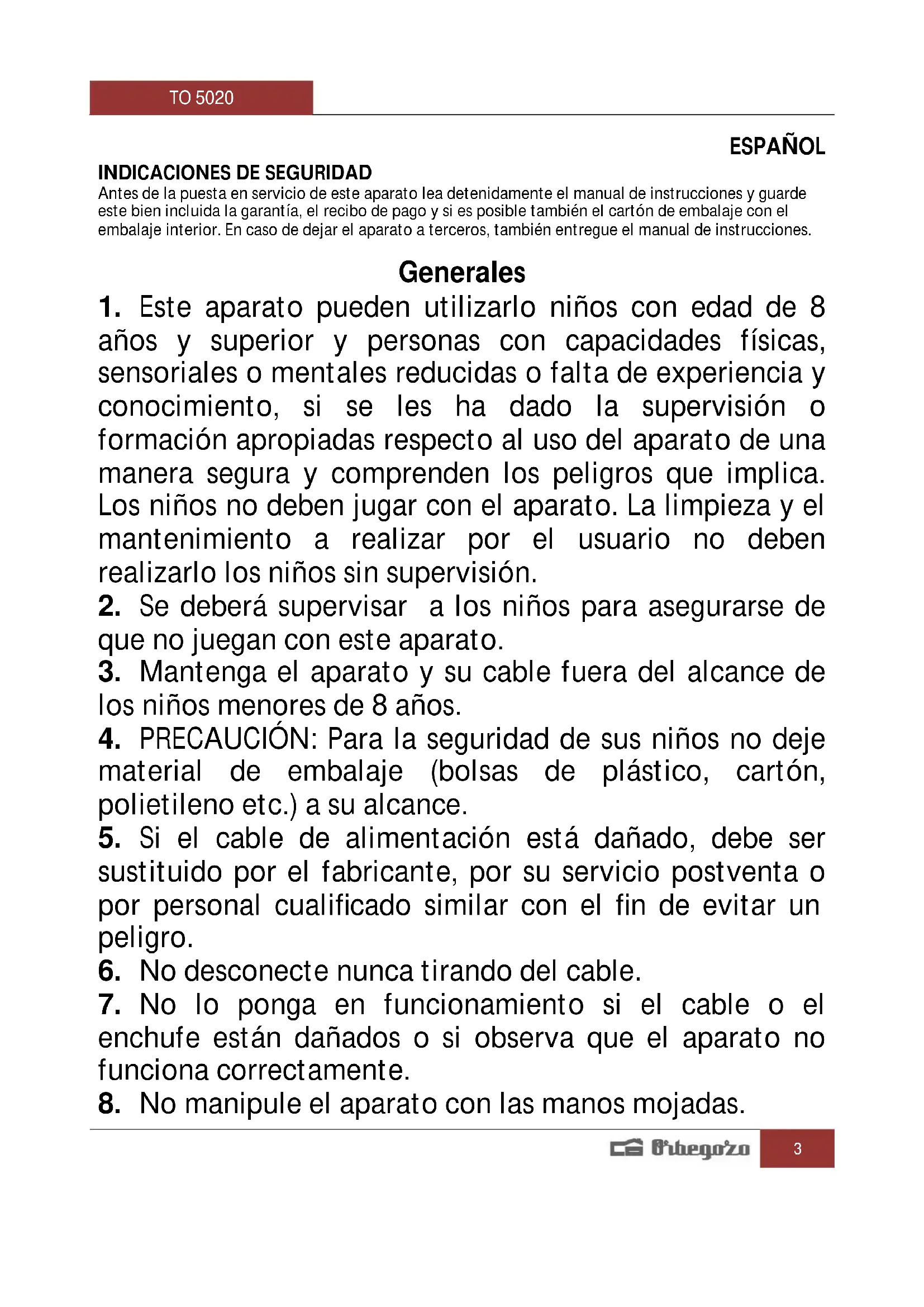 MANUAL DE USUARIO TO 5020 Orbegozo