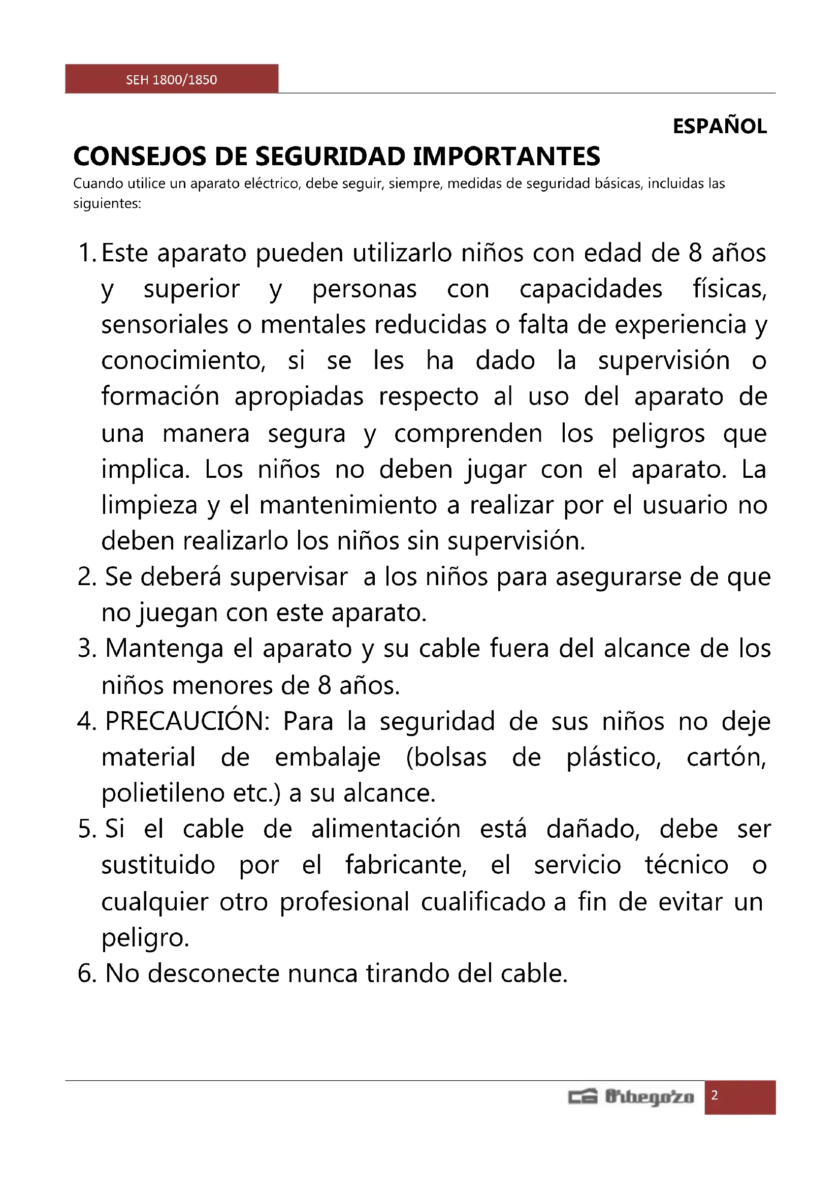MANUAL DE USUARIO SEH 1800 Orbegozo