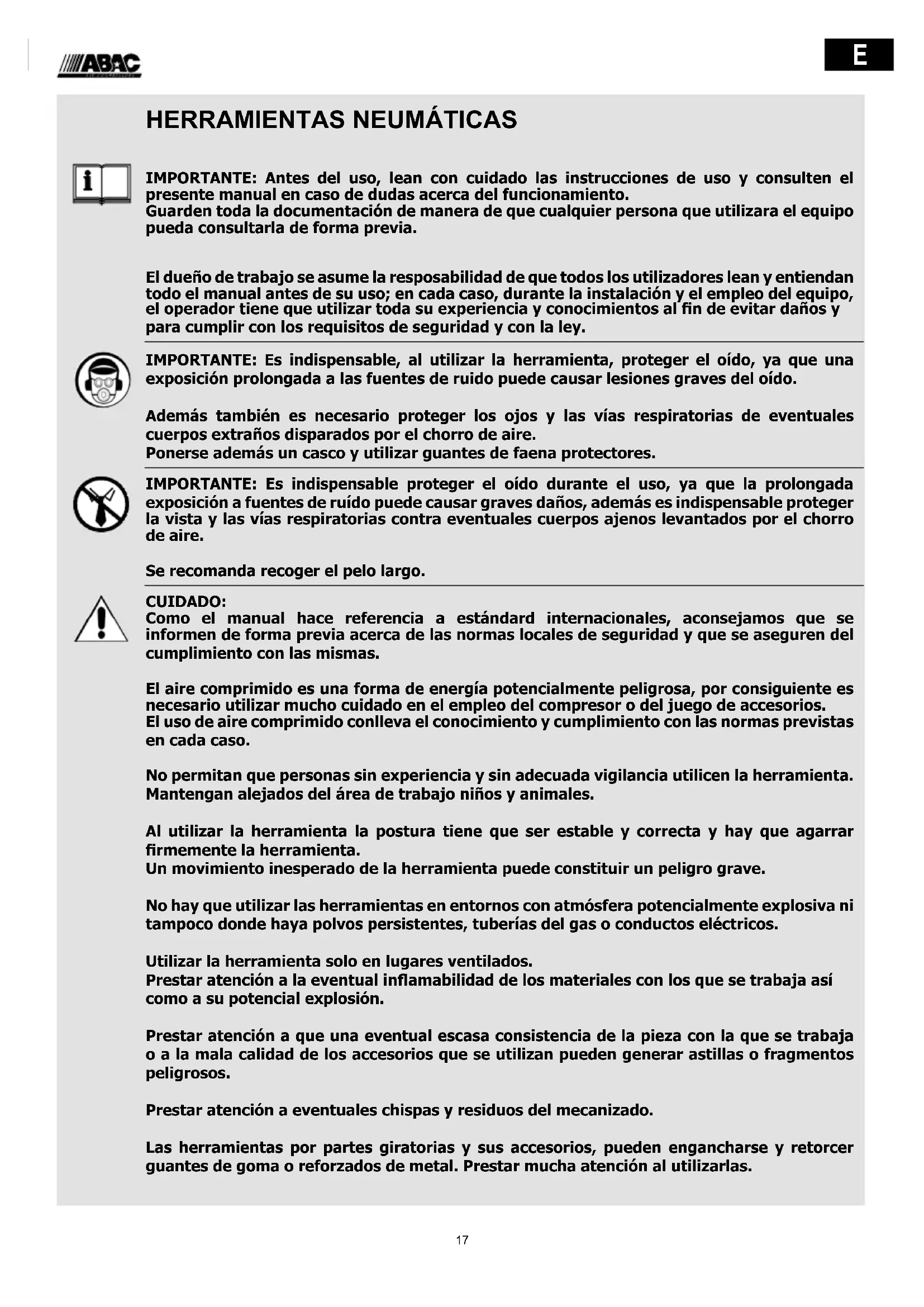 IMPORTANTE: Antes del uso, lean con cuidado las instrucciones de uso y consulten el presente manual en caso de dudas acerca del funcionamiento. Guarden toda la documentación de manera de que cualquier persona que utilizara el equipo pueda consultarla de forma previa. El dueño de trabajo se asume la resposabilidad de que todos los utilizadores lean y entiendan todo el manual antes de su uso; en cada caso, durante la instalación y el empleo del equipo, el operador tiene que utilizar toda su experiencia y conocimientos al n de evitar daños y para cumplir con los requisitos de seguridad y con la ley. IMPORTANTE: Es indispensable, al utilizar la herramienta, proteger el oído, ya que una exposición prolongada a las fuentes de ruido puede causar lesiones graves del oído. Además también es necesario proteger los ojos y las vías respiratorias de eventuales cuerpos extraños disparados por el chorro de aire. Ponerse además un casco y utilizar guantes de faena protectores. IMPORTANTE: Es indispensable proteger el oído durante el uso, ya que la prolongada exposición a fuentes de ruído puede causar graves daños, además es indispensable proteger la vista y las vías respiratorias contra eventuales cuerpos ajenos levantados por el chorro de aire. Se recomanda recoger el pelo largo. CUIDADO: Como el manual hace referencia a estándard internacionales, aconsejamos que se informen de forma previa acerca de las normas locales de seguridad y que se aseguren del cumplimiento con las mismas. El aire comprimido es una forma de energía potencialmente peligrosa, por consiguiente es necesario utilizar mucho cuidado en el empleo del compresor o del juego de accesorios. El uso de aire comprimido conlleva el conocimiento y cumplimiento con las normas previstas en cada caso. No permitan que personas sin experiencia y sin adecuada vigilancia utilicen la herramienta. Mantengan alejados del área de trabajo niños y animales. Al utilizar la herramienta la postura tiene que ser estable y correcta y hay que agarrar rmemente la herramienta. Un movimiento inesperado de la herramienta puede constituir un peligro grave. No hay que utilizar las herramientas en entornos con atmósfera potencialmente explosiva ni tampoco donde haya polvos persistentes, tuberías del gas o conductos eléctricos. Utilizar la herramienta solo en lugares ventilados. Prestar atención a la eventual inamabilidad de los materiales con los que se trabaja así como a su potencial explosión. Prestar atención a que una eventual escasa consistencia de la pieza con la que se trabaja o a la mala calidad de los accesorios que se utilizan pueden generar astillas o fragmentos peligrosos. Prestar atención a eventuales chispas y residuos del mecanizado. Las herramientas por partes giratorias y sus accesorios, pueden engancharse y retorcer guantes de goma o reforzados de metal. Prestar mucha atención al utilizarlas.18