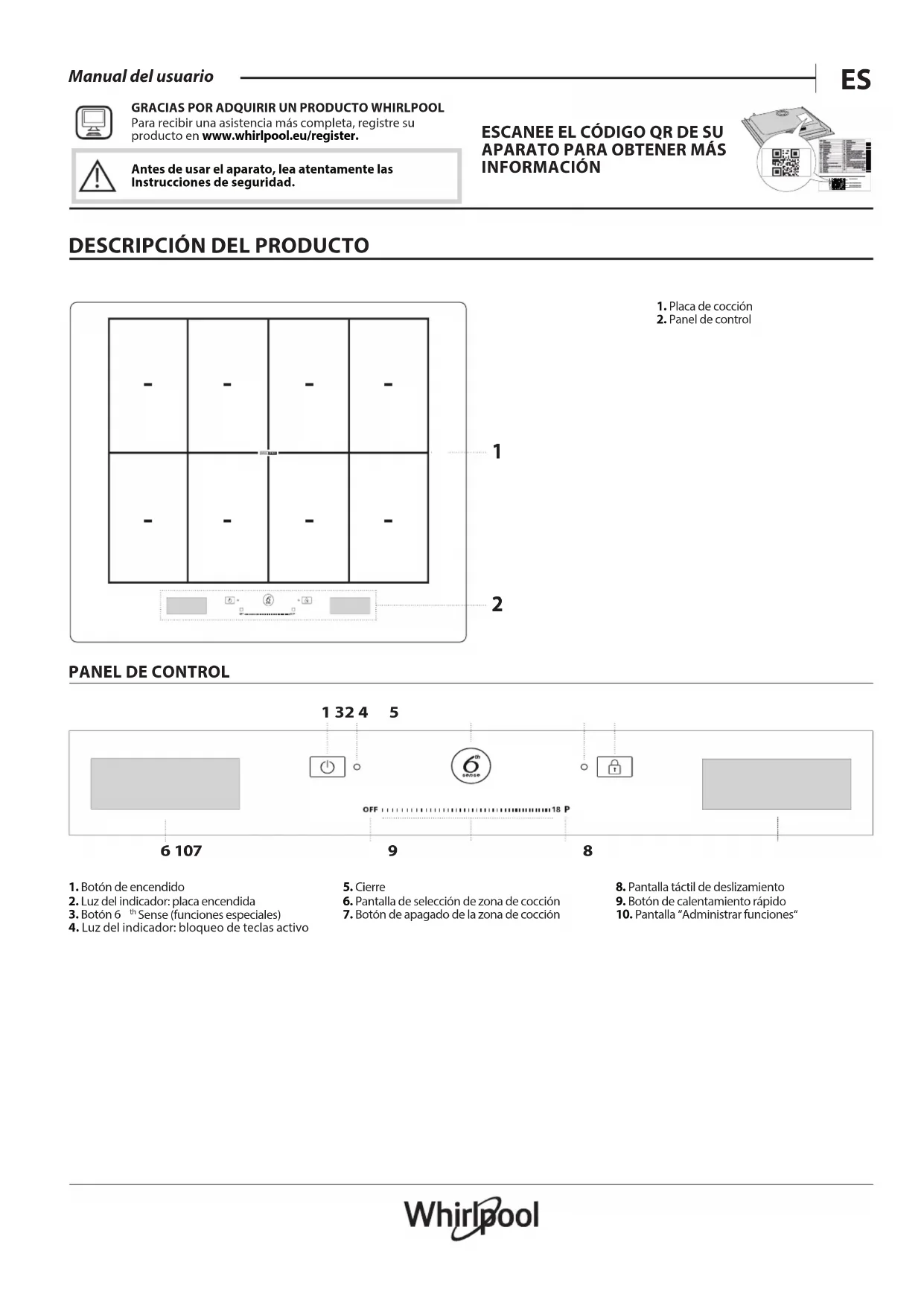 La siguiente tabla se ha creado especialmente para que los organismos de inspección puedan utilizar nuestros productos. Distribución de calor, prueba de “Tortitas“ de acuerdo con la norma EN 60350-2 §7.3 Rendimiento térmico, prueba de “Patatas fritas“ de acuerdo con la norma EN 60350-2 §7.4 Derretir “chocolate“ y mantenerlo caliente Cocer a fuego lento “arroz con leche“ DISEÑO ECO: La prueba se ha realizado de conformidad con las normativas, seleccionando todas las zonas de cocción de la placa para formar una sola área o utilizando la función Flexifull. Cocción vericada Posiciones de cocción vericadaSERVICIO POSTVENTA Para recibir una asistencia más completa, registre su producto en www.whirpool.eu/register. ANTES DE LLAMAR AL SERVICIO POSTVENTA: