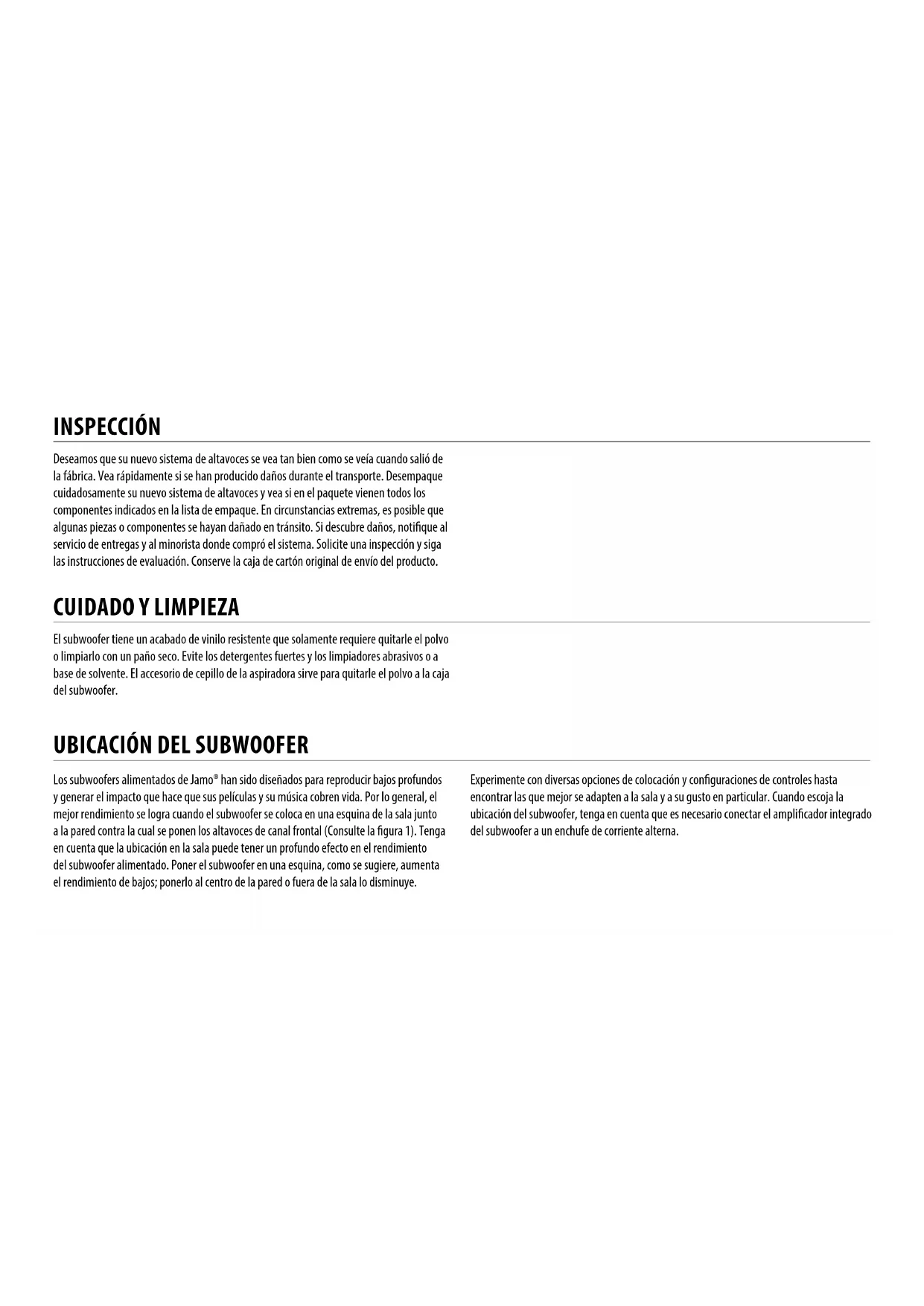 AUTO OFF LFE DOWN UP 40Hz 80Hz 120Hz LFE Abbildung 2 Anschluss Für Den Subwoofer Surround-A/V-Receiver LFE Abbildung 3 GummifüßchenUBICACIÓN DEL SUBWOOFER Los subwoofers alimentados de Jamo® han sido diseñados para reproducir bajos profundos y generar el impacto que hace que sus películas y su música cobren vida. Por lo general, el mejor rendimiento se logra cuando el subwoofer se coloca en una esquina de la sala junto a la pared contra la cual se ponen los altavoces de canal frontal (Consulte la gura 1). Tenga en cuenta que la ubicación en la sala puede tener un profundo efecto en el rendimiento del subwoofer alimentado. Poner el subwoofer en una esquina, como se sugiere, aumenta el rendimiento de bajos; ponerlo al centro de la pared o fuera de la sala lo disminuye. Experimente con diversas opciones de colocación y conguraciones de controles hasta encontrar las que mejor se adapten a la sala y a su gusto en particular. Cuando escoja la ubicación del subwoofer, tenga en cuenta que es necesario conectar el amplicador integrado del subwoofer a un enchufe de corriente alterna. Deseamos que su nuevo sistema de altavoces se vea tan bien como se veía cuando salió de la fábrica. Vea rápidamente si se han producido daños durante el transporte. Desempaque cuidadosamente su nuevo sistema de altavoces y vea si en el paquete vienen todos los componentes indicados en la lista de empaque. En circunstancias extremas, es posible que algunas piezas o componentes se hayan dañado en tránsito. Si descubre daños, notique al servicio de entregas y al minorista donde compró el sistema. Solicite una inspección y siga las instrucciones de evaluación. Conserve la caja de cartón original de envío del producto. INSPECCIÓN El subwoofer tiene un acabado de vinilo resistente que solamente requiere quitarle el polvo o limpiarlo con un paño seco. Evite los detergentes fuertes y los limpiadores abrasivos o a base de solvente. El accesorio de cepillo de la aspiradora sirve para quitarle el polvo a la caja del subwoofer.
