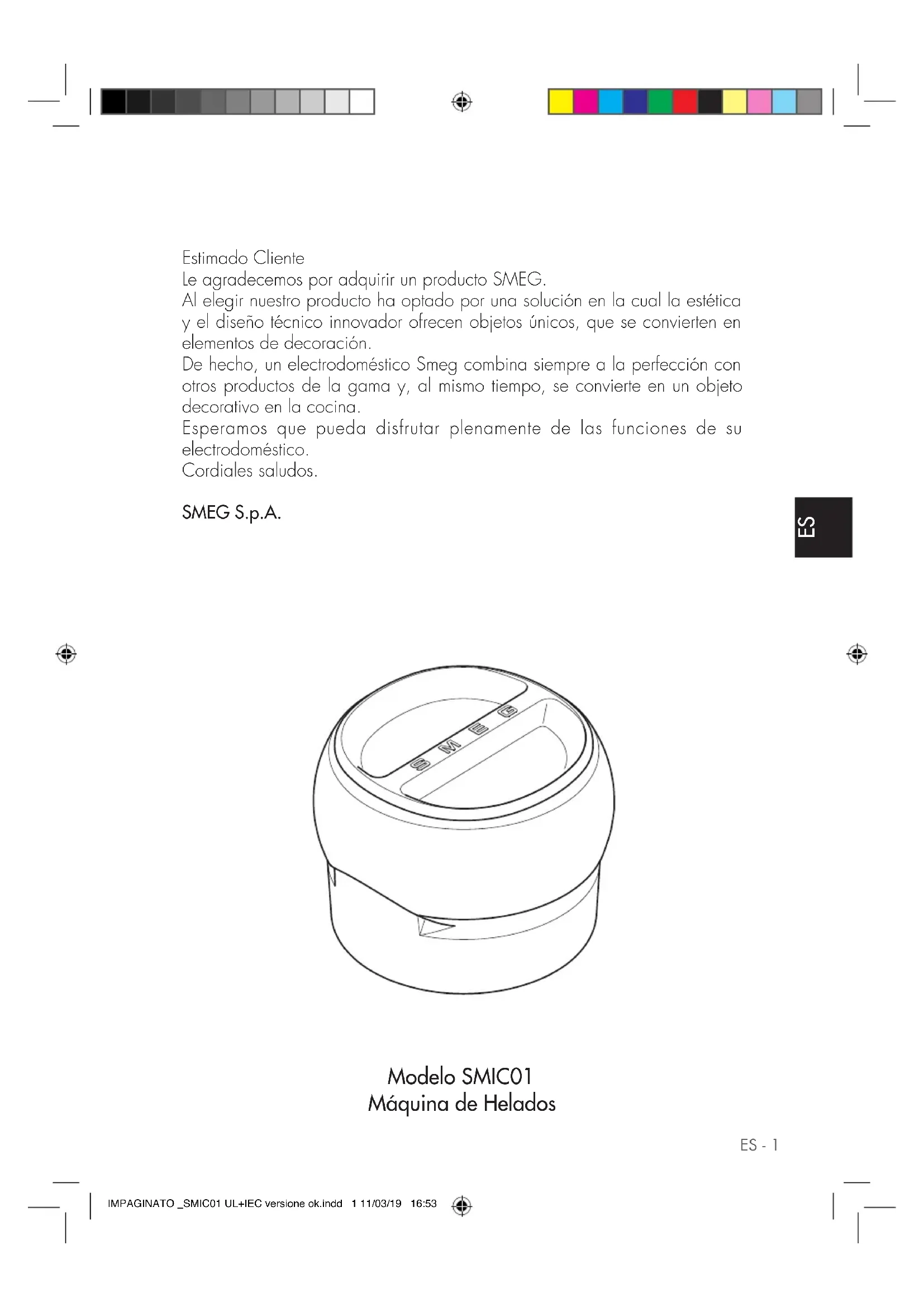 - Plaats de kom in de koelkast tot het mengsel tot de temperatuur van de koelkast is afgekoeld. IMPAGINATO _SMIC01 UL+IEC versione ok.indd 7 11/03/19 16:538 - NL IMPAGINATO _SMIC01 UL+IEC versione ok.indd 8 11/03/19 16:53ES ES - 1 Modelo SMIC01 Máquina de Helados Estimado Cliente Le agradecemos por adquirir un producto SMEG. Al elegir nuestro producto ha optado por una solución en la cual la estética y el diseño técnico innovador ofrecen objetos únicos, que se convierten en elementos de decoración. De hecho, un electrodoméstico Smeg combina siempre a la perfección con otros productos de la gama y, al mismo tiempo, se convierte en un objeto decorativo en la cocina. Esperamos que pueda disfrutar plenamente de las funciones de su electrodoméstico. Cordiales saludos. SMEG S.p.A. IMPAGINATO _SMIC01 UL+IEC versione ok.indd 1 11/03/19 16:532 - ES Instrucciones importantes