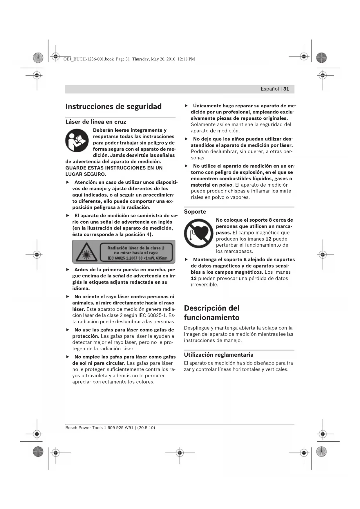 LUGAR SEGURO. f Atención: en caso de utilizar unos dispositi- vos de manejo y ajuste diferentes de los aquí indicados, o al seguir un procedimien- to diferente, ello puede comportar una ex- posición peligrosa a la radiación. f El aparato de medición se suministra de se- rie con una señal de advertencia en inglés (en la ilustración del aparato de medición, ésta corresponde a la posición 4). f Antes de la primera puesta en marcha, pe- gue encima de la señal de advertencia en in- glés la etiqueta adjunta redactada en su idioma. f No oriente el rayo láser contra personas ni animales, ni mire directamente hacia el rayo láser. Este aparato de medición genera radia- ción láser de la clase 2 según IEC 60825-1. Es- ta radiación puede deslumbrar a las personas. f No use las gafas para láser como gafas de protección. Las gafas para láser le ayudan a detectar mejor el rayo láser, pero no le pro- tegen de la radiación láser. f No emplee las gafas para láser como gafas de sol ni para circular. Las gafas para láser no le protegen suficientemente contra los ra- yos ultravioleta y además no le permiten apreciar correctamente los colores. f Únicamente haga reparar su aparato de me- dición por un profesional, empleando exclu- sivamente piezas de repuesto originales. Solamente así se mantiene la seguridad del aparato de medición. f No deje que los niños puedan utilizar des- atendidos el aparato de medición por láser. Podrían deslumbrar, sin querer, a otras per- sonas. f No utilice el aparato de medición en un en- torno con peligro de explosión, en el que se encuentren combustibles líquidos, gases o material en polvo. El aparato de medición puede producir chispas e inflamar los mate- riales en polvo o vapores. Soporte No coloque el soporte 8 cerca de personas que utilicen un marca- pasos. El campo magnético que producen los imanes 12 puede perturbar el funcionamiento de los marcapasos. f Mantenga el soporte 8 alejado de soportes de datos magnéticos y de aparatos sensi- bles a los campos magnéticos. Los imanes 12 pueden provocar una pérdida de datos irreversible. Descripción del funcionamiento Despliegue y mantenga abierta la solapa con la imagen del aparato de medición mientras lee las instrucciones de manejo. Utilización reglamentaria El aparato de medición ha sido diseñado para tra- zar y controlar líneas horizontales y verticales. OBJ_BUCH-1236-001.book Page 31 Thursday, May 20, 2010 12:18 PM32 | Español 1 609 929 W91 | (20.5.10) Bosch Power Tools Datos técnicos Componentes principales La numeración de los componentes está referi- da a la imagen del aparato de medición en la pá- gina ilustrada. 1 Abertura de salida del rayo láser 2 Fijación para trípode 1/4" 3 Interruptor de conexión/desconexión 4 Señal de aviso láser 5 Número de serie 6 Enclavamiento de la tapa del alojamiento de las pilas 7 Tapa del alojamiento de las pilas 8 Soporte 9 Tornillo de fijación del soporte 10 Orificios de sujeción del soporte 11 Guía de la correa 12 Imanes 13 Fijación para trípode de 1/4" en el soporte 14 Fijación para trípode de 5/8" en el soporte 15 Estuche de protección 16 Gafas para láser* 17 Placa de medición con base* 18 Trípode*