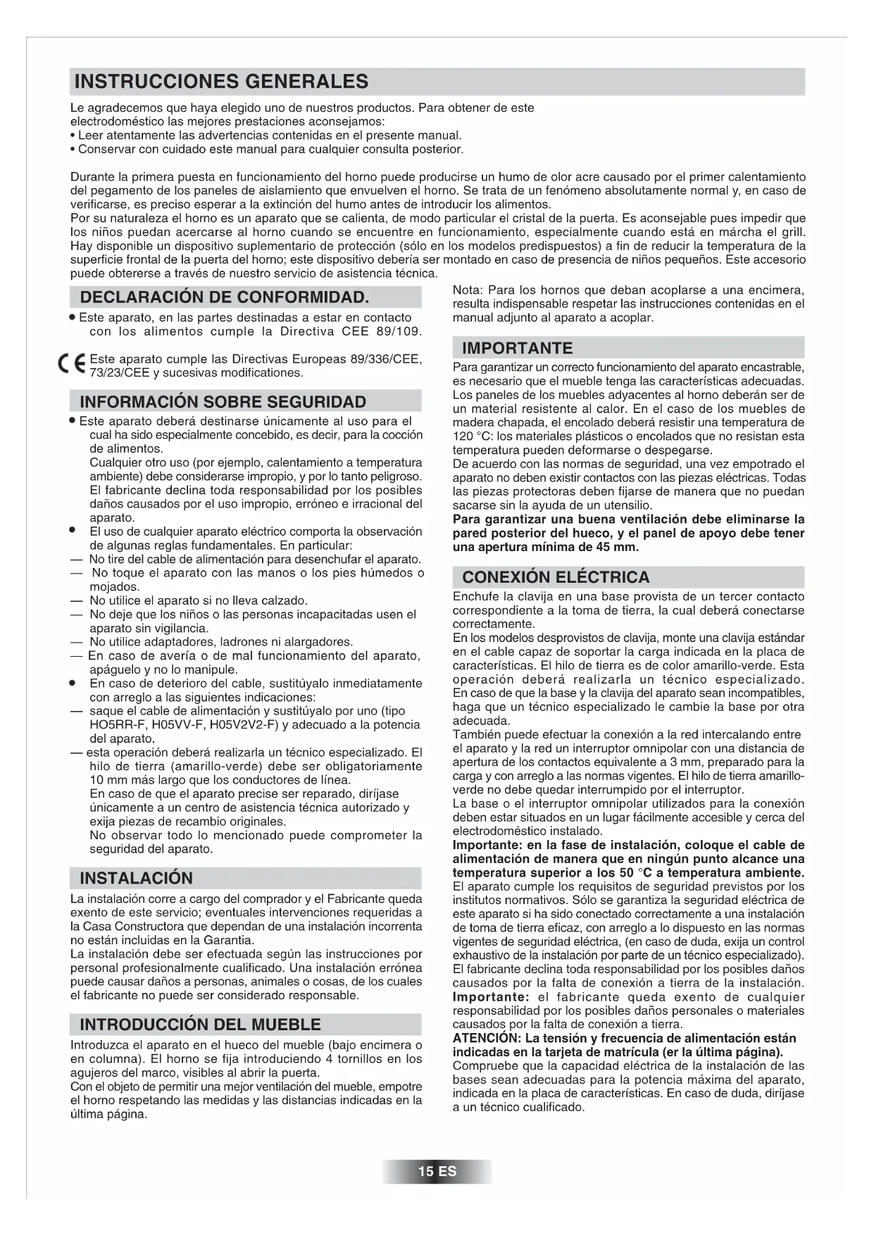 - Conservar con cuidado este manual para cualquier consulta posterior. Durante la primera puesta en funcionamiento del horno puede producirse un humo de olor acre causado por el primer calentamiento del pegamento de los paneles de aislamiento que envuelven el horno. Se trata de un fenómeno absolutamente normal y, en caso de verificarse, es preciso esperar a la extinción del humo antes de introducir los alimentos. Por su naturaleza el horno es un aparato que se calienta, de modo particular el cristal de la puerta. Es aconsejable pues impedir que los niños puedan acercarse al horno cuando se encuentre en funcionamiento, especialmente cuando está en márcha el grill. Hay disponible un dispositivo suplementario de protección (sólo en los modelos predispuestos) a fin de reducir la temperatura de la superficie frontal de la puerta del horno; este dispositivo debería ser montado en caso de presencia de niños pequeños. Este accesorio puede obtererse a través de nuestro servicio de asistencia técnica. INSTRUCCIONES GENERALES DECLARACIÓN DE CONFORMIDAD.