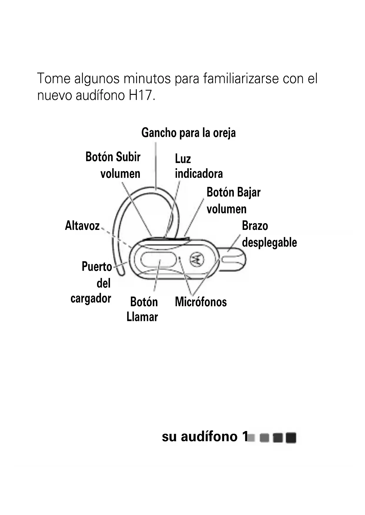 Manual Number: 68000202346-AGuía de Inicio Rápido motorola H17su audífono 1 su audí fono Tome algunos minutos para familiarizarse con el nuevo audífono H17. Brazo desplegable Puerto del cargador Botón Bajar volumen Botón Llamar Altavoz Luz indicadora Micrófonos Botón Subir volumen Gancho para la orejacárguelo2 cárgue lo Debe cargar el audífono antes de usarlo. Cierre el brazo desplegable y enchufe el cargador en el puerto de carga del audífono y a un tomacorriente de pared. La luz indicadora se enciende en rojo o amarillo mientras la batería se está cargando. Cuando la batería está totalmente cargada, la luz indicadora cambia a verde. Nota: el audífono no funciona mientras se carga. Nota: la batería está diseñada para durar lo que dura el producto. Sólo se debe eliminar en una instalación de reciclaje. Cualquier intento de retirar o reemplazar la batería dañará el audífono.asociar y conectar 3 asoci ar y conec tar Asociemos y conectemos el audífono con teléfonos Bluetooth. asociar y conectar el primer teléfono