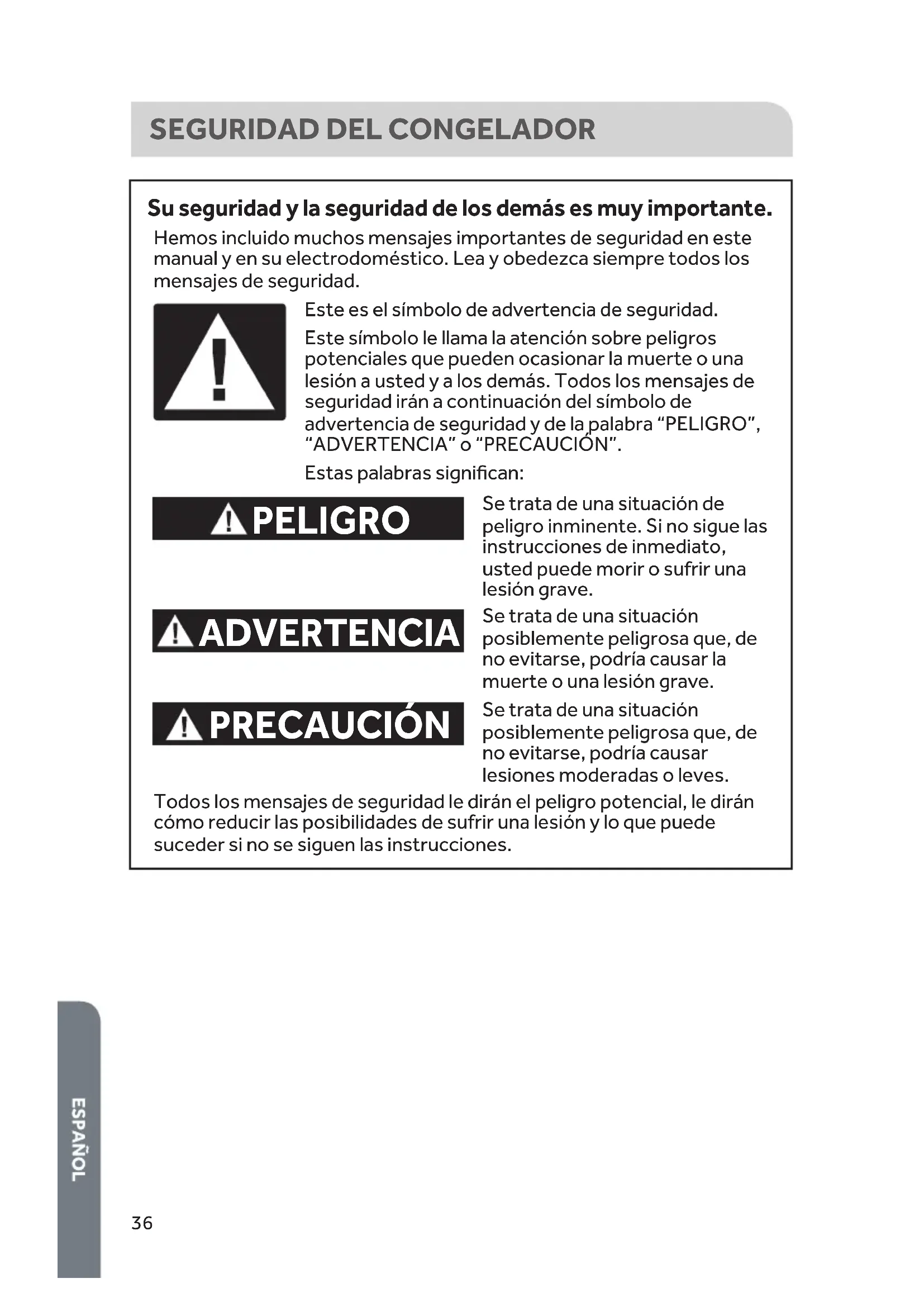 Su seguridad y la seguridad de los demás es muy importante. PELIGRO ADVERTENCIA PRECAUCIÓN Este es el símbolo de advertencia de seguridad. Este símbolo le llama la atención sobre peligros potenciales que pueden ocasionar la muerte o una lesión a usted y a los demás. Todos los mensajes de seguridad irán a continuación del símbolo de advertencia de seguridad y de la palabra “PELIGRO”, “ADVERTENCIA” o “PRECAUCIÓN”. Estas palabras significan: Se trata de una situación de peligro inminente. Si no sigue las instrucciones de inmediato, usted puede morir o sufrir una lesión grave. Se trata de una situación posiblemente peligrosa que, de no evitarse, podría causar la muerte o una lesión grave. Se trata de una situación posiblemente peligrosa que, de no evitarse, podría causar lesiones moderadas o leves. Todos los mensajes de seguridad le dirán el peligro potencial, le dirán cómo reducir las posibilidades de sufrir una lesión y lo que puede suceder si no se siguen las instrucciones. Hemos incluido muchos mensajes importantes de seguridad en este manual y en su electrodoméstico. Lea y obedezca siempre todos los mensajes de seguridad.37 INSTRUCCIONES IMPORTANTES DE SEGURIDAD ADVERTENCIA: Para reducir el riesgo de incendio, choque eléctrico, lesiones a personas o daños al utilizar el congelador, siga precauciones básicas, incluyendo las siguientes: