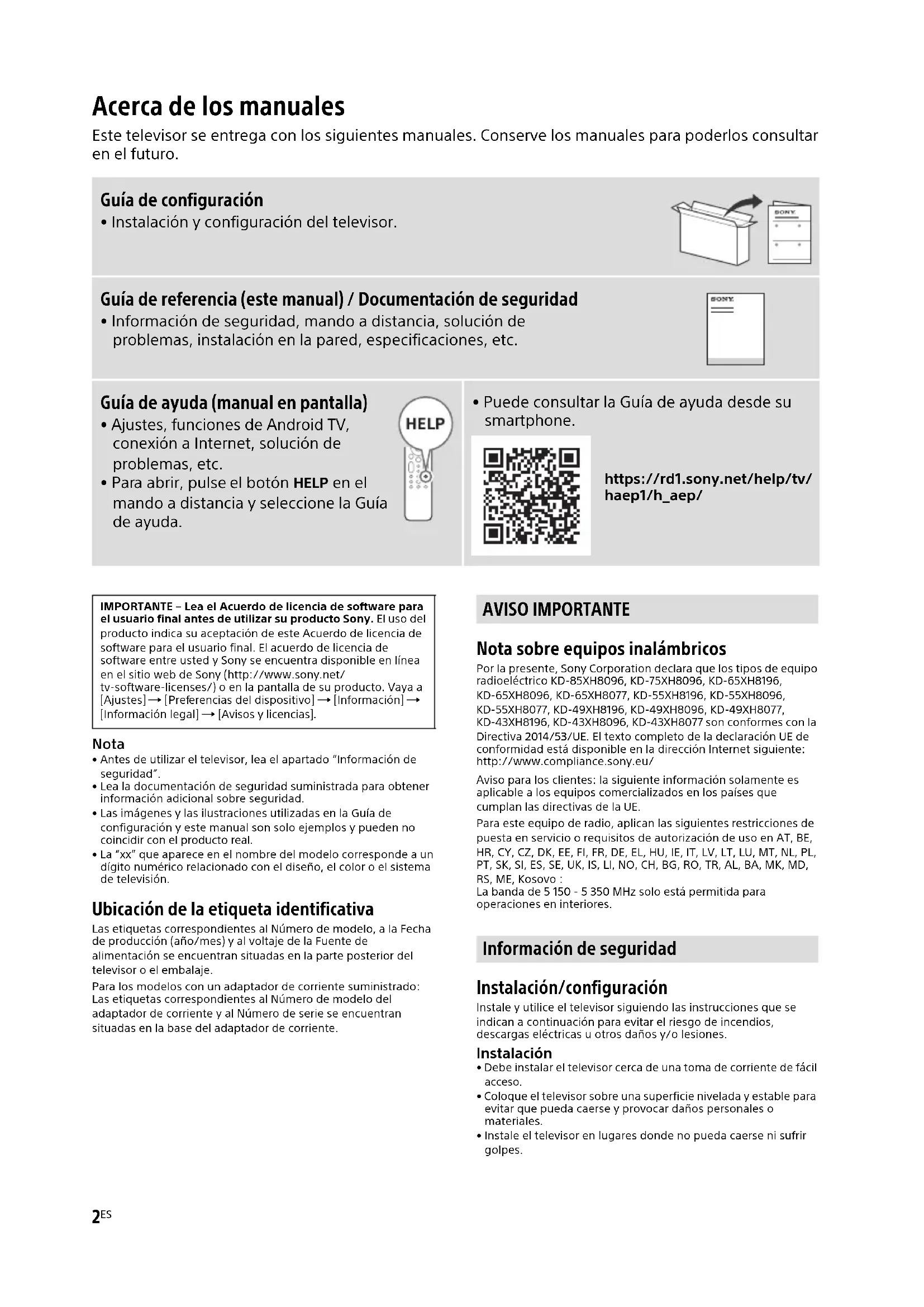 - Puede consultar la Guía de ayuda desde su smartphone. https://rd1.sony.net/help/tv/ haep1/h_aep/ IMPORTANTE – Lea el Acuerdo de licencia de software para el usuario final antes de utilizar su producto Sony. El uso del producto indica su aceptación de este Acuerdo de licencia de software para el usuario final. El acuerdo de licencia de software entre usted y Sony se encuentra disponible en línea en el sitio web de Sony (http://www.sony.net/ tv-software-licenses/) o en la pantalla de su producto. Vaya a [Ajustes] [Preferencias del dispositivo] [Información] [Información legal] [Avisos y licencias]. AVISO IMPORTANTE Información de seguridad3
