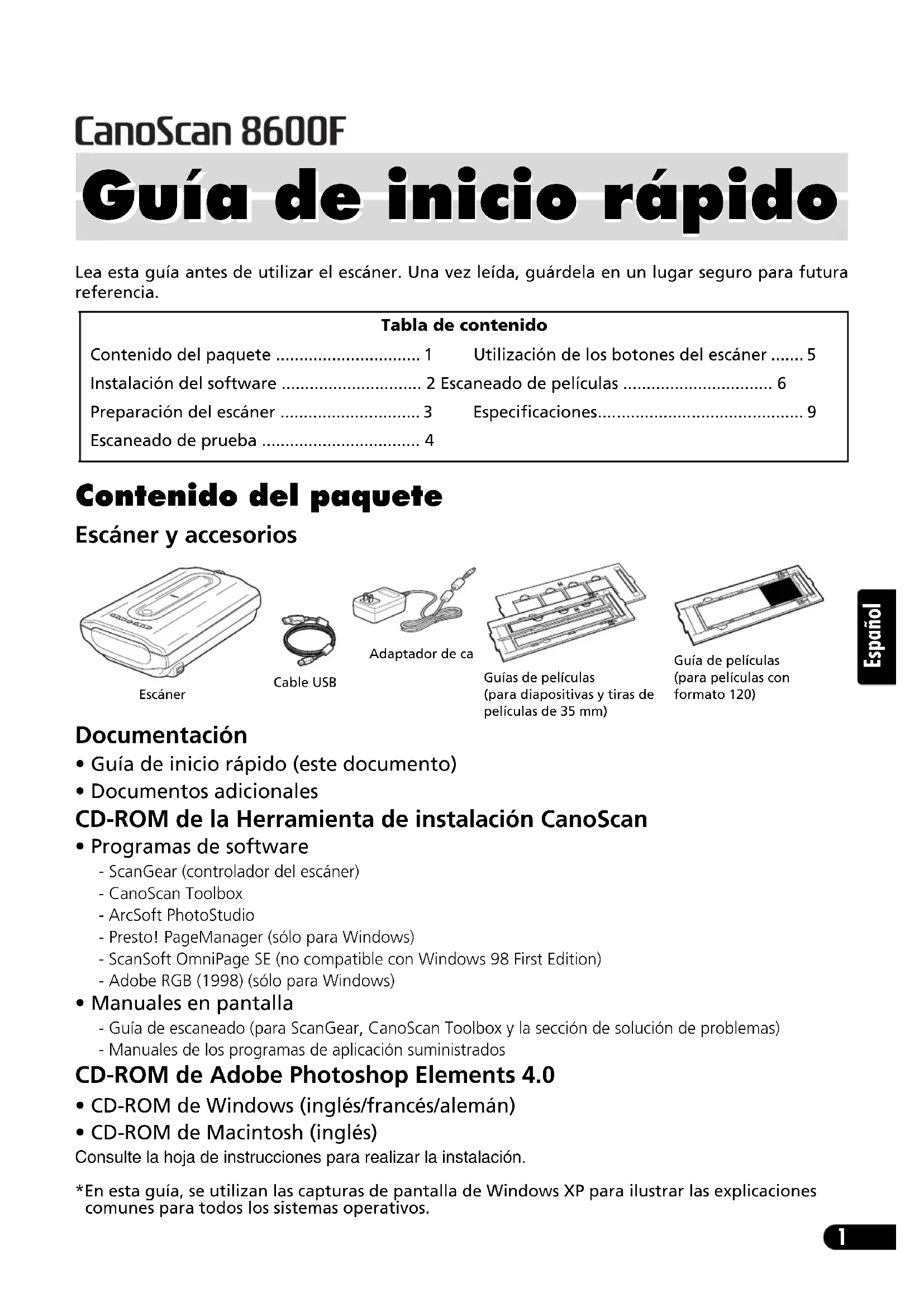 - CD-ROM de Macintosh (inglés) Consulte la hoja de instrucciones para realizar la instalación. *En esta guía, se utilizan las capturas de pantalla de Windows XP para ilustrar las explicaciones comunes para todos los sistemas operativos. Tabla de contenido Contenido del paquete ............................... 1 Utilización de los botones del escáner ....... 5 Instalación del software .............................. 2 Escaneado de películas ................................ 6 Preparación del escáner .............................. 3 Especificaciones............................................ 9 Escaneado de prueba .................................. 4 Guía de inicio rápido Guía de inicio rápido EscánerCable USBGuías de películas(para diapositivas y tiras de películas de 35 mm)Adaptador de caGuía de películas(para películas con formato 120)Instalación del software