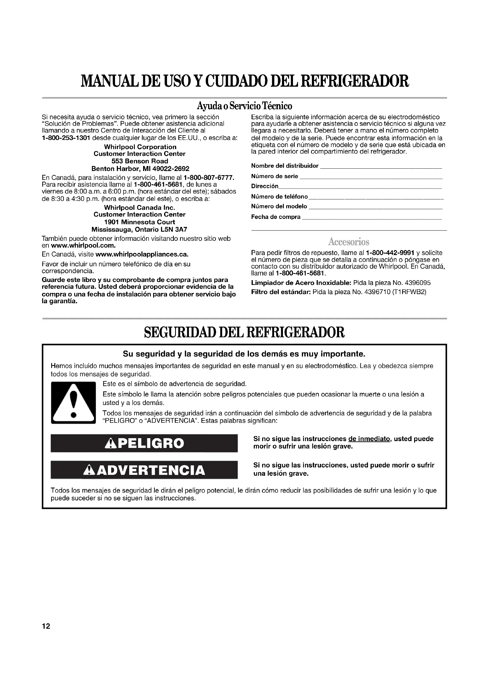 WHIRLPOOL CORPORATION AND WHIRLPOOL CANADA INC. SHALL NOT BE LIABLE FORINCIDENTALORCONSEQUENTIALDAMAGES Some states or provinces do not allow the exclusion or limitation of incidental or consequential damages, so this exclusion or limitation may not apply to you. This warranty gives you specific legal rights, and you may also have other rights which vary from state to state or province to province. Outside the 50 United States and Canada, this warranty does not apply. Contact your authorized Whirlpool dealer to determine if another warranty applies. If you need service, first see the “Troubleshooting” section of this book. After checking “Troubleshooting,” additional help can be found by checking the “Assistance or Service” section or by calling the Whirlpool Customer Interaction Center, 1-800-253-1301 (toll-free), from anywhere in the U.S.A. In Canada, contact your Whirlpool Canada Inc. designated service company or call 1-800-807-6777. 8/0112 MANUAL DE USO Y CUIDADO DEL REFRIGERADOR Ayuda o Servicio Técnico Si necesita ayuda o servicio técnico, vea primero la sección “Solución de Problemas”. Puede obtener asistencia adicional llamando a nuestro Centro de Interacción del Cliente al 1-800-253-1301 desde cualquier lugar de los EE.UU., o escriba a:Whirlpool CorporationCustomer Interaction Center553 Benson RoadBenton Harbor, MI 49022-2692 En Canadá, para instalación y servicio, llame al 1-800-807-6777. Para recibir asistencia llame al 1-800-461-5681, de lunes a viernes de 8:00 a.m. a 6:00 p.m. (hora estándar del este); sábados de 8:30 a 4:30 p.m. (hora estándar del este), o escriba a: Whirlpool Canada Inc.Customer Interaction Center1901 Minnesota CourtMississauga, Ontario L5N 3A7 También puede obtener información visitando nuestro sitio web en www.whirlpool.com. En Canadá, visite www.whirlpoolappliances.ca. Favor de incluir un número telefónico de día en su correspondencia.Guarde este libro y su comprobante de compra juntos para referencia futura. Usted deberá proporcionar evidencia de la compra o una fecha de instalación para obtener servicio bajo la garantía. Escriba la siguiente información acerca de su electrodoméstico para ayudarle a obtener asistencia o servicio técnico si alguna vez llegara a necesitarlo. Deberá tener a mano el número completo del modelo y de la serie. Puede encontrar esta información en la etiqueta con el número de modelo y de serie que está ubicada en la pared interior del compartimiento del refrigerador.Nombre del distribuidor _________________________________________Número de serie ________________________________________________Dirección_______________________________________________________ Número de teléfono _____________________________________________ Número del modelo _____________________________________________Fecha de compra _______________________________________________ Accesorios Para pedir filtros de repuesto, llame al 1-800-442-9991 y solicite el número de pieza que se detalla a continuación o póngase en contacto con su distribuidor autorizado de Whirlpool. En Canadá, llame al 1-800-461-5681.Limpiador de Acero Inoxidable: Pida la pieza No. 4396095 Filtro del estándar: Pida la pieza No. 4396710 (T1RFWB2)