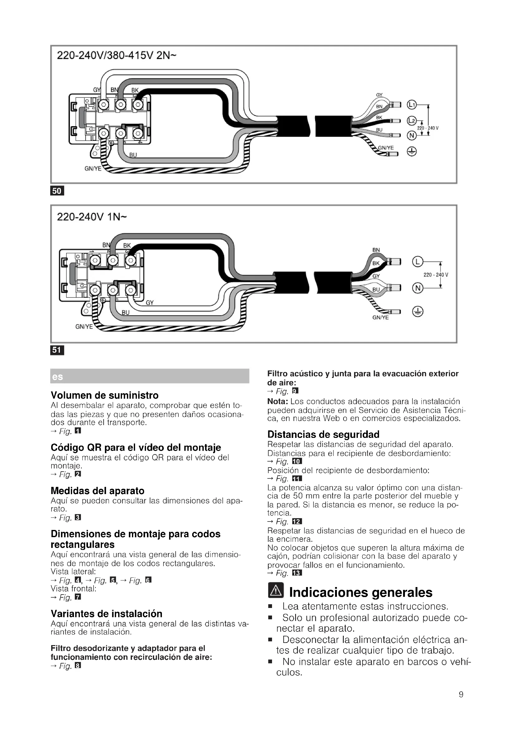 Indicaciones generales ¡ Lea atentamente estas instrucciones. ¡ Solo un profesional autorizado puede co- nectar el aparato. ¡ Desconectar la alimentación eléctrica an- tes de realizar cualquier tipo de trabajo. ¡ No instalar este aparato en barcos o vehí- culos.10 ¡ Siga las recomendaciones del fabricante de la encimera. Montaje seguro Tener en cuenta estas indicaciones de seguridad al montar el aparato. Solamente un montaje profesional conforme a las instrucciones de montaje puede garantizar un uso seguro del aparato. El instalador es responsable del funcionamiento perfecto en el lugar de instalación. Nota:Este aparato está diseñado para capturar los humos de los recipientes colocados sobre las zonas de cocción. Si se utiliza para capturar los humos de otros aparatos (como procesadores de alimentos u otras placas de cocción), la eficacia del sistema de ventilación dependerá de la distancia entre la entra- da de aire y la fuente de los humos. ADVERTENCIA‒Peligro: magnetismo! El aparato contiene imanes permanentes. Estos pue- den repercutir en el correcto funcionamiento de im- plantes electrónicos como marcapasos o bombas de insulina. ▶ Las personas con implantes electrónicos deberán mantener una distancia mínima de 10cm respec- to al aparato. ADVERTENCIA‒Riesgo de envenenamiento! Los gases de combustión que se vuelven a aspirar pueden ocasionar intoxicaciones. Los equipos cale- factores que dependen del aire del recinto de insta- lación (p. ej., calefactores de gas, aceite, madera o carbón, calentadores de salida libre, calentadores de agua) adquieren aire de combustión del recinto de instalación y evacuan los gases de escape al ex- terior a través de un sistema extractor (p. ej., una chimenea). En combinación con una campana ex- tractora encendida se extrae aire de la cocina y de las habitaciones próximas. sin una entrada de aire suficiente se genera una depresión. Los gases tóxi- cos procedentes de la chimenea o del hueco de ventilación se vuelven a aspirar en las habitaciones. ▶ Garantizar una entrada de aire suficiente si el apa- rato se emplea en el modo de evacuación del aire al exterior junto con un equipo calefactor depen- diente del aire del recinto de instalación. ▶ Con el fin de garantizar un funcionamiento seguro, la depresión en el recinto de instalación de los equipos calefactores no debe superar los 4Pa(0,04mbar). Esto se consigue si, mediante aberturas que no se pueden cerrar, p. ej., en puer- tas, ventanas, en combinación con un pasamuros de entrada/salida de aire o mediante otras medi- das técnicas, se puede hacer recircular el aire ne- cesario para la combustión. Un pasamuros de en- trada/salida de aire no es garantía por sí solo del cumplimiento del valor límite. ▶ Pedir siempre asesoramiento al técnico compe- tente de su región, que estará en condiciones de evaluar todo el sistema de ventilación de su hogar y recomendarle las medidas adecuadas en mate- ria de ventilación. ▶ No hay limitaciones para el funcionamiento si el aparato se utiliza exclusivamente en el modo con recirculación de aire. ADVERTENCIA‒Riesgo de incendio! Los depósitos de grasa del filtro antigrasa pueden prenderse. ▶ No trabajar nunca con una llama directa cerca del aparato (p. ej., flambear). ▶ Instalar el aparato cerca de un equipo calefactor para combustibles sólidos (p. ej., madera o car- bón) solo si se dispone de una cubierta cerrada no desmontable. No deben saltar chispas. ADVERTENCIA‒Riesgo de lesiones! La realización de modificaciones en la estructura eléctrica o mecánica resulta peligrosa y puede pro- vocar un funcionamiento erróneo. ▶ No realizar modificaciones en la estructura eléctri- ca ni mecánica. Las piezas que estén accesibles durante el montaje pueden tener los bordes afilados o causar cortes al tocarlas. ▶ Usar guantes de protección. El aparato es pesado. ▶ Para mover el aparato se necesitan 2 personas. ▶ Utilizar únicamente los medios auxiliares apropia- dos. ADVERTENCIA‒Riesgo de asfixia! Los niños pueden ponerse el material de embalaje por encima de la cabeza, o bien enrollarse en él, y asfixiarse. ▶ Mantener el material de embalaje fuera del alcan- ce de los niños. ▶ No permita que los niños jueguen con el embala- je. ADVERTENCIA‒Riesgo de envenenamiento! Los gases de combustión que se vuelven a aspirar pueden ocasionar intoxicaciones. ▶ No conducir el aire de salida hacia una chimenea de humos o gases de escape que esté en servi- cio. ▶ No conducir el aire de salida hacia un hueco des- tinado a ventilar recintos de instalación de equi- pos calefactores. ▶ Si el aire de salida se evacua hacia una chimenea de humos o gases de escape que no está en ser- vicio, será necesario contar previamente con la aprobación del técnico competente que corres- ponda. Los gases de combustión que se vuelven a aspirar pueden ocasionar intoxicaciones. ▶ Si hay instalada una campana extractora con chi- menea estanca, se debe equipar el suministro eléctrico de la campana extractora con un circuito de protección adecuado. Indicaciones relativas a la conexión eléctrica Para conectar eléctricamente el aparato de forma segura, consultar estas indicaciones. ADVERTENCIA‒Riesgo de descarga eléctrica! Debe ser posible desenchufar el aparato de la red eléctrica en cualquier momento. El aparato solo po- drá conectarse a una toma de corriente debidamen- te instalada. ▶ Se debe instalar un dispositivo de separación om- nipolar en la instalación eléctrica fija, de acuerdo con las condiciones de la categoría de sobreten- sión III y las normas de instalación. ▶ Solo un electricista cualificado puede efectuar la instalación eléctrica fija. Se recomienda la instala- ción de un interruptor de corriente de defecto (in- terruptor diferencial) en el circuito de alimentación del aparato.11 ¡ No doblar ni aprisionar el cable de conexión y mantenerlo alejado de bordes afilados. ¡