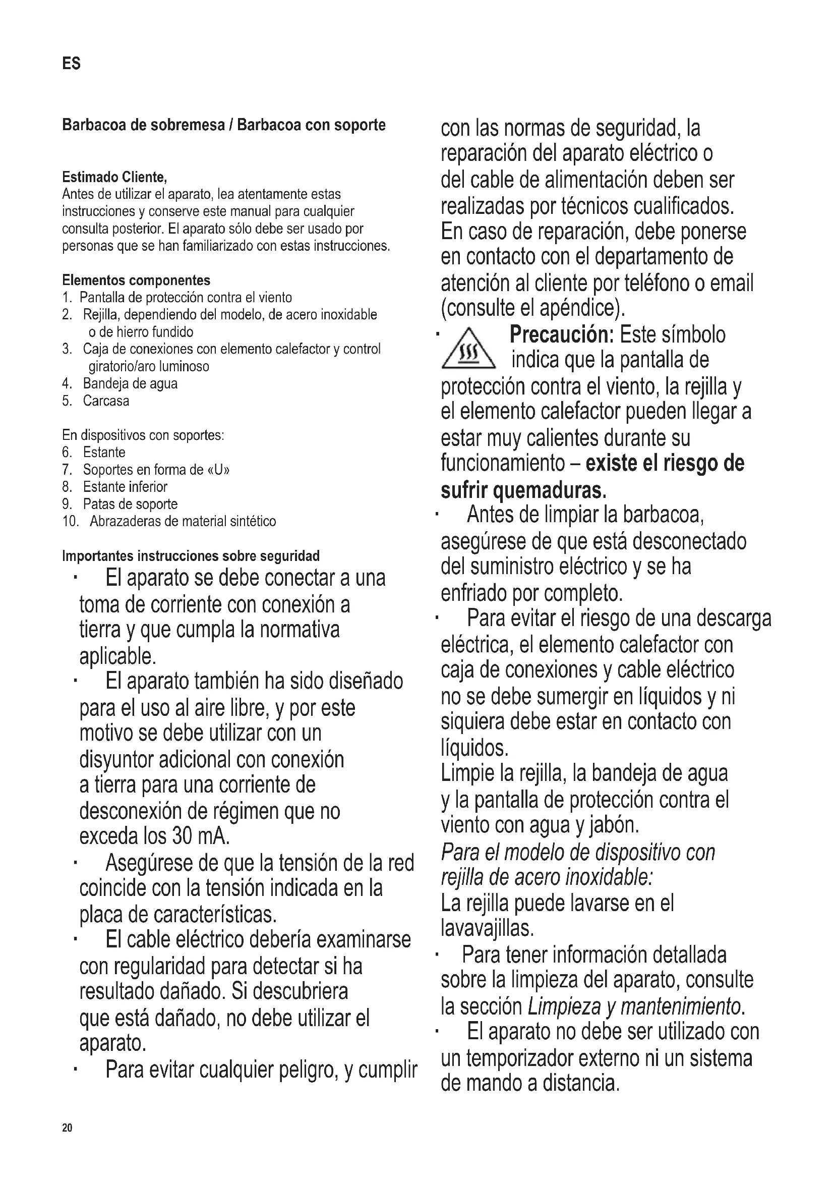 - Durante el funciona, la barbacoa debe ser colocada sobre una superficie termorresidente, insensible a salpicaduras y manchas. Cuando se cocinan alimentos con un contenido alto de grasa o humedad, no se pueda siempre estar las salpicaduras.