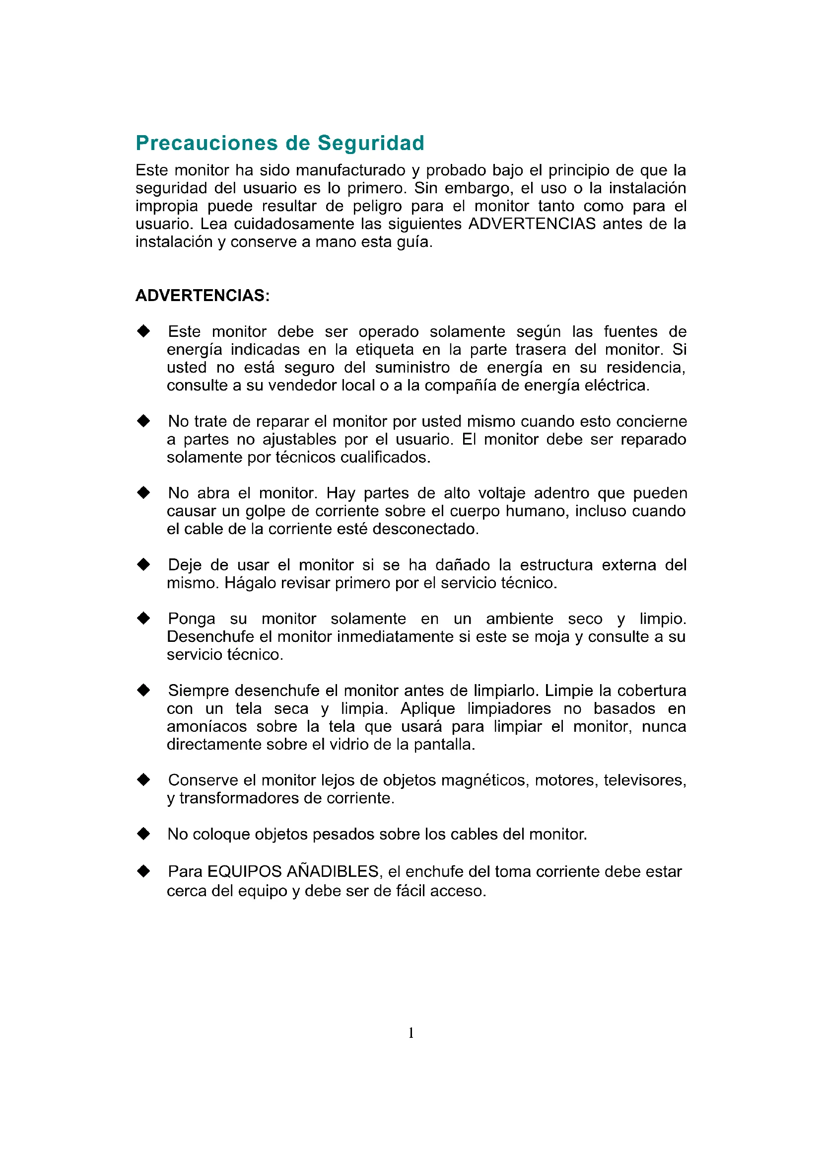 ADVERTENCIAS: Este monitor debe ser operado solamente según las fuentes de energía indicadas en la etiqueta en la parte trasera del monitor. Si usted no está seguro del suministro de energía en su residencia, consulte a su vendedor local o a la compañía de energía eléctrica. No trate de reparar el monitor por usted mismo cuando esto concierne a partes no ajustables por el usuario. El monitor debe ser reparado solamente por técnicos cualificados. No abra el monitor. Hay partes de alto voltaje adentro que pueden causar un golpe de corriente sobre el cuerpo humano, incluso cuando el cable de la corriente esté desconectado. Deje de usar el monitor si se ha dañado la estructura externa del mismo. Hágalo revisar primero por el servicio técnico. Ponga su monitor solamente en un ambiente seco y limpio. Desenchufe el monitor inmediatamente si este se moja y consulte a su servicio técnico. Siempre desenchufe el monitor antes de limpiarlo. Limpie la cobertura con un tela seca y limpia. Aplique limpiadores no basados en amoníacos sobre la tela que usará para limpiar el monitor, nunca directamente sobre el vidrio de la pantalla. Conserve el monitor lejos de objetos magnéticos, motores, televisores, y transformadores de corriente. No coloque objetos pesados sobre los cables del monitor.