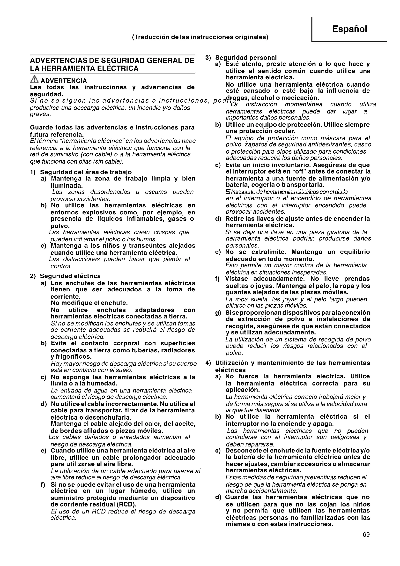 a) Esté atento, preste atención a lo que hace y utilice el sentido común cuando utilice una herramienta eléctrica. No utilice una herramienta eléctrica cuando esté cansado o esté bajo la infl uencia de drogas, alcohol o medicación. La distracción momentánea cuando utiliza herramientas eléctricas puede dar lugar a importantes daños personales. b) Utilice un equipo de protección. Utilice siempre una protección ocular. El equipo de protección como máscara para el polvo, zapatos de seguridad antideslizantes, casco o protección para oídos utilizado para condiciones adecuadas reducirá los daños personales. c) Evite un inicio involuntario. Asegúrese de que el interruptor está en “off ” antes de conectar la herramienta a una fuente de alimentación y/o batería, cogerla o transportarla. El transporte de herramientas eléctricas con el dedo en el interruptor o el encendido de herramientas eléctricas con el interruptor encendido puede provocar accidentes.