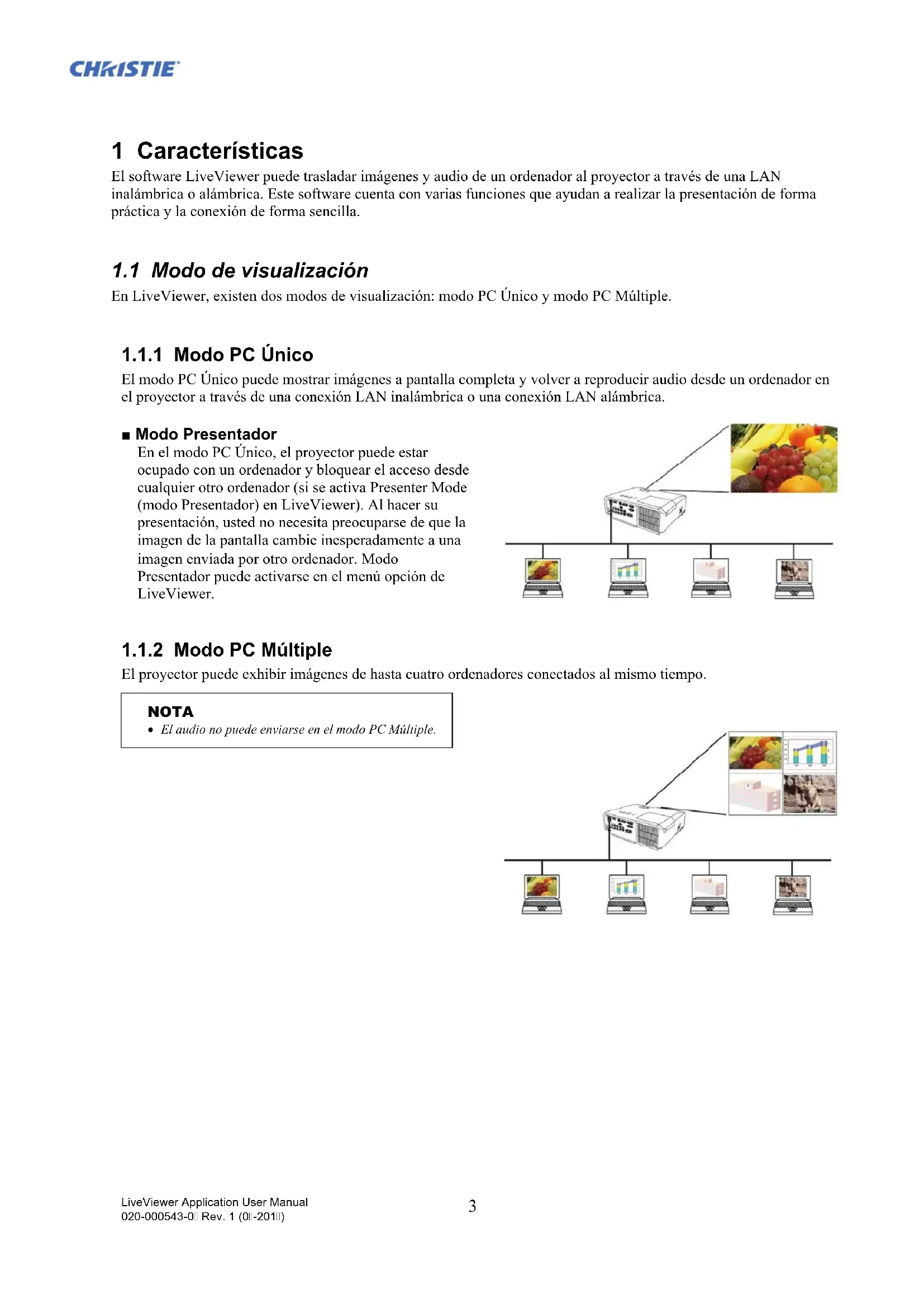 Verifique cuál es su versión, y obtenga la versión más reciente en el sitio Web de Christie. http://www.christiedigital.com Algunas funciones explicadas en este manual requieren la Versión 6.xx de “LiveViewer”. (La letra “x” de la versión significa 0 o mayor.) LiveViewer Application User Manual 020-000543-0 Rev. 1 (0-201)7 3 Primeros pasos con LiveViewer Esta sección explica cómo utilizar LiveViewer. La idea general del proceso es la siguiente: PASO 1. Instale la aplicación LiveViewer ( abajo) PASO 2. Conexión a la red ( 9) La característica Conexión rápida prepara algunas opciones para realizar la conexión con el proyector. Puede seleccionar una que cumpla con sus requisitos. Seleccione de la lista Conexión con Código de acceso Conexión por perfil Conexión por historial Conexión manual Mi conexión En algunos casos existen varios proyectores conectados a la misma red. Antes de enviar su imagen, confirme que el proyector seleccionado sea el que corresponde. PASO 3. Inicio de la Presentación de Red ( 24) En la pantalla aparecerá el menú principal de LiveViewer. Ahora usted puede enviar sus imágenes al proyector a través de la red.