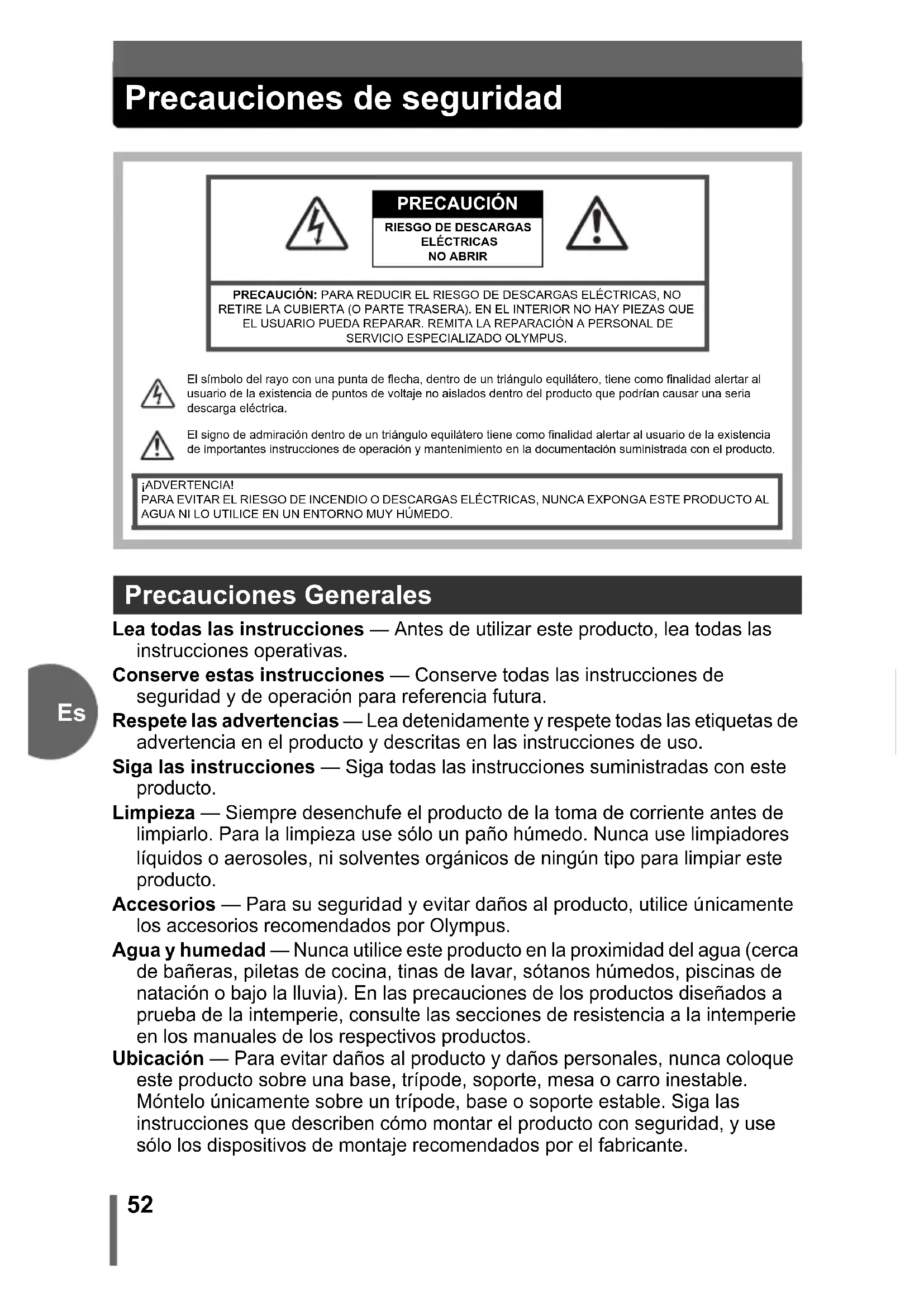 Precauciones de seguridad Lea todas las instrucciones — Antes de utilizar este producto, lea todas las instrucciones operativas. Conserve estas instrucciones — Conserve todas las instrucciones de seguridad y de operación para referencia futura. Respete las advertencias — Lea detenidamente y respete todas las etiquetas de advertencia en el producto y descritas en las instrucciones de uso. Siga las instrucciones — Siga todas las instrucciones suministradas con este producto. Limpieza — Siempre desenchufe el producto de la toma de corriente antes de limpiarlo. Para la limpieza use sólo un paño húmedo. Nunca use limpiadores líquidos o aerosoles, ni solventes orgánicos de ningún tipo para limpiar este producto. Accesorios — Para su seguridad y evitar daños al producto, utilice únicamente los accesorios recomendados por Olympus. Agua y humedad — Nunca utilice este producto en la proximidad del agua (cerca de bañeras, piletas de cocina, tinas de lavar, sótanos húmedos, piscinas de natación o bajo la lluvia). En las precauciones de los productos diseñados a prueba de la intemperie, consulte las secciones de resistencia a la intemperie en los manuales de los respectivos productos. Ubicación — Para evitar daños al producto y daños personales, nunca coloque este producto sobre una base, trípode, soporte, mesa o carro inestable. Móntelo únicamente sobre un trípode, base o soporte estable. Siga las instrucciones que describen cómo montar el producto con seguridad, y use sólo los dispositivos de montaje recomendados por el fabricante. Precauciones Generales PRECAUCIÓN: PARA REDUCIR EL RIESGO DE DESCARGAS ELÉCTRICAS, NO RETIRE LA CUBIERTA (O PARTE TRASERA). EN EL INTERIOR NO HAY PIEZAS QUE EL USUARIO PUEDA REPARAR. REMITA LA REPARACIÓN A PERSONAL DE SERVICIO ESPECIALIZADO OLYMPUS.El símbolo del rayo con una punta de flecha, dentro de un triángulo equilátero, tiene como finalidad alertar al usuario de la existencia de puntos de voltaje no aislados dentro del producto que podrían causar una seria descarga eléctrica.El signo de admiración dentro de un triángulo equilátero tiene como finalidad alertar al usuario de la existencia de importantes instrucciones de operación y mantenimiento en la documentación suministrada con el producto.¡ADVERTENCIA!PARA EVITAR EL RIESGO DE INCENDIO O DESCARGAS ELÉCTRICAS, NUNCA EXPONGA ESTE PRODUCTO AL AGUA NI LO UTILICE EN UN ENTORNO MUY HÚMEDO. PRECAUCIÓN