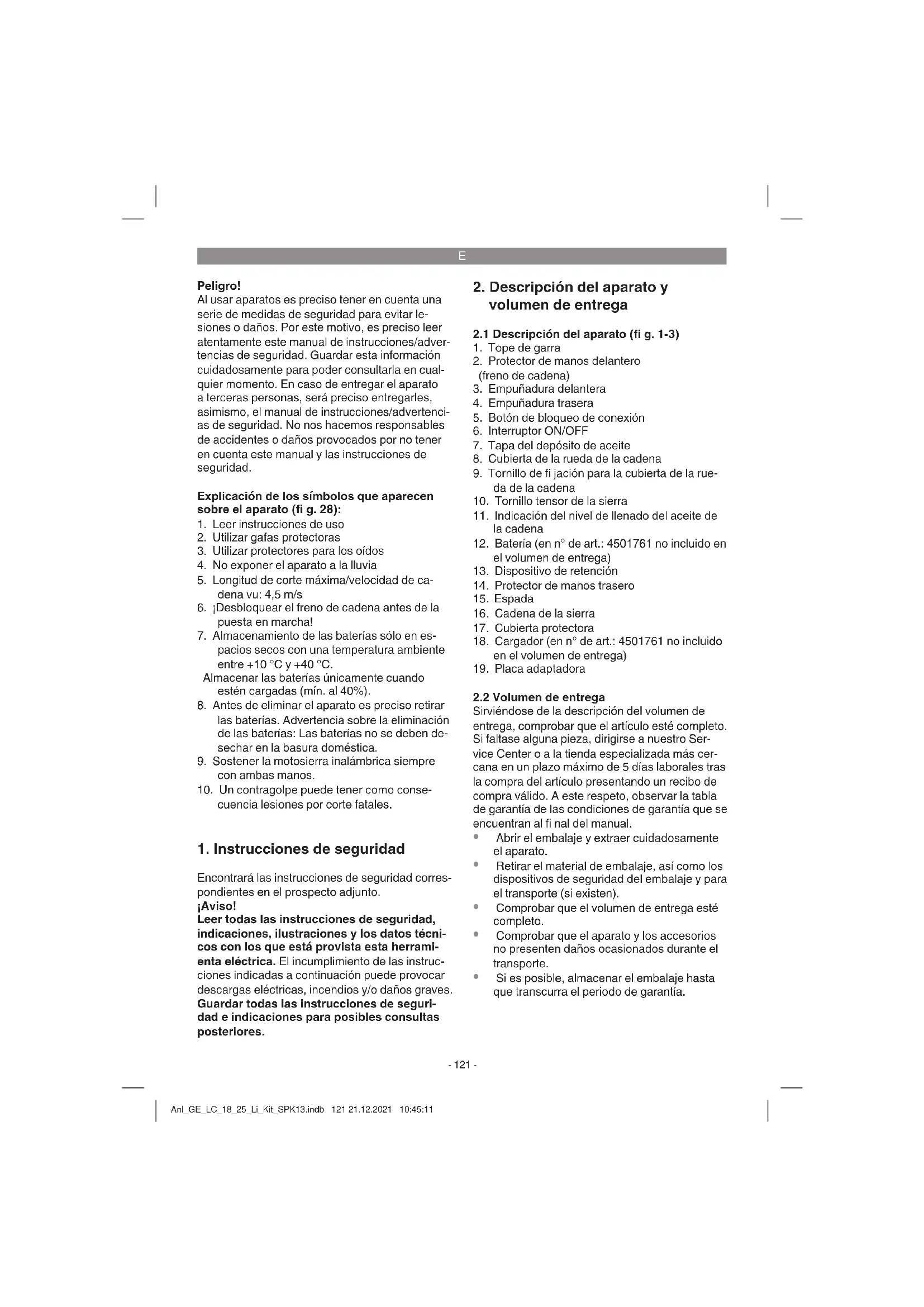 Si es posible, almacenar el embalaje hasta que transcurra el periodo de garantía. Anl_GE_LC_18_25_Li_Kit_SPK13.indb 121 21.12.2021 10:45:11E