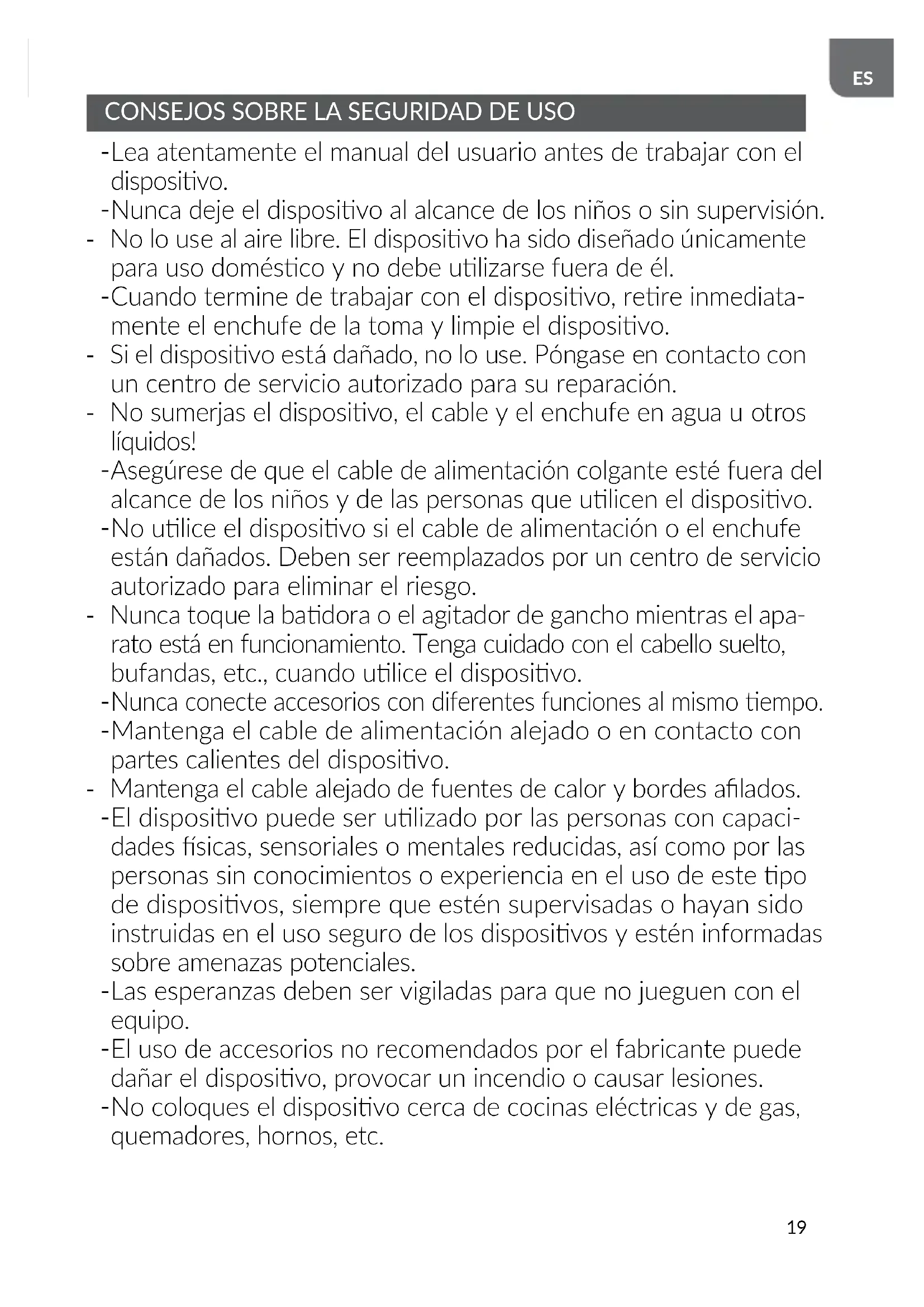 No conectes el enchufe a la toma de corriente con las manos mojadas. - Antes de limpiar, montar o desmontar el disposivo, desconecte siempre el cable de alimentación de la toma de corriente. - No desconectes el enchufe de la red rando del cable. - Ulice el disposivo sobre una supercie lisa e estable.