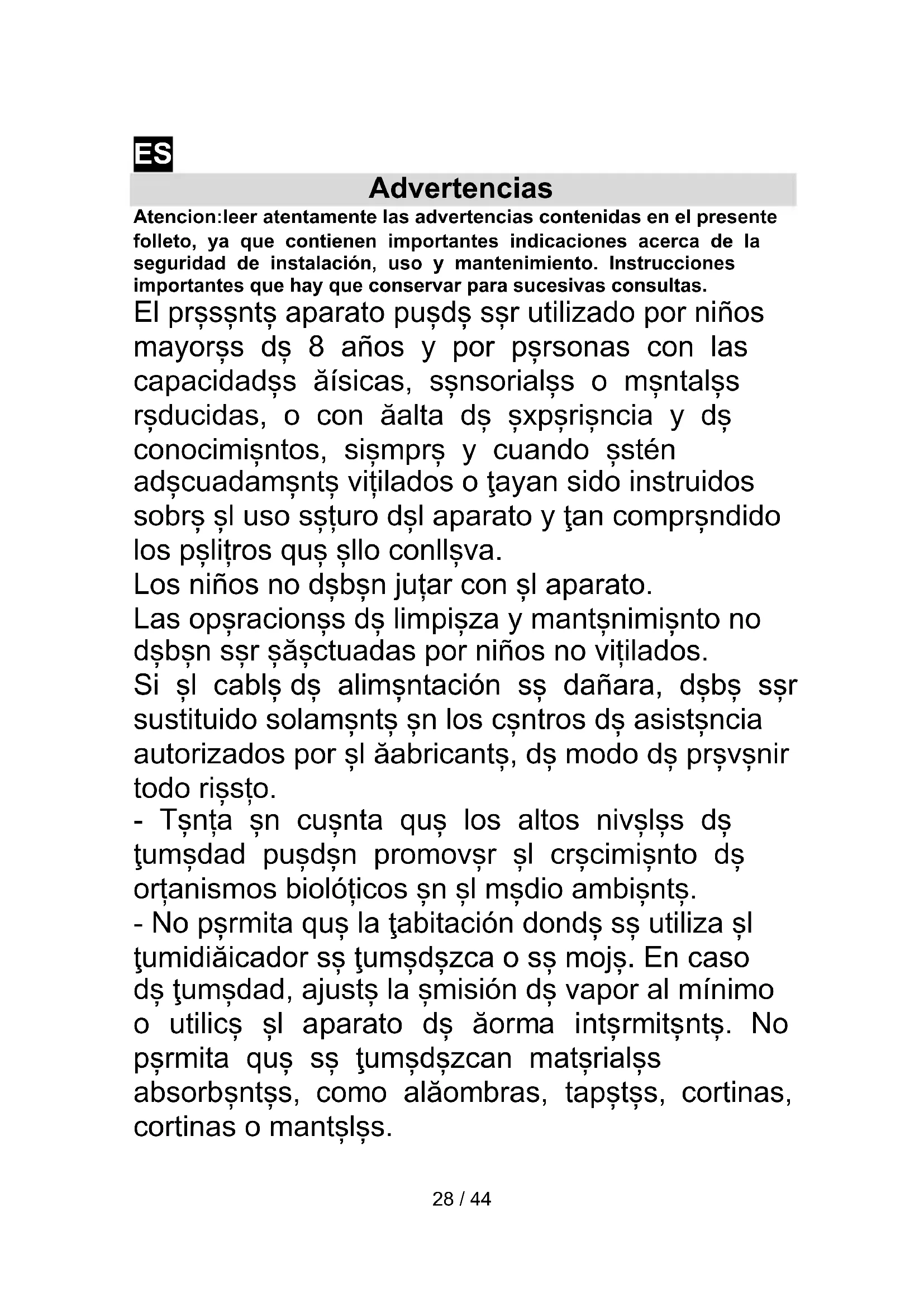 - ADVERTENCIA: Los microortanismos quṣ, puṣdìn shtar prṣṣṭntss sn sl aṭua o sn sl sntorno donds sṣ utilizes o almacṣna sl aparato, puṣdìn crṣcsr sn sl dśposito dṣ aṭua y ssr sxpulsados al airṣ provocando risṣtos muy travss para la salute cuando sl aṭua no sṣ rṣnuṣva y sl dśposito no sṣ limpia adscuadamṣnts cada 3 días.