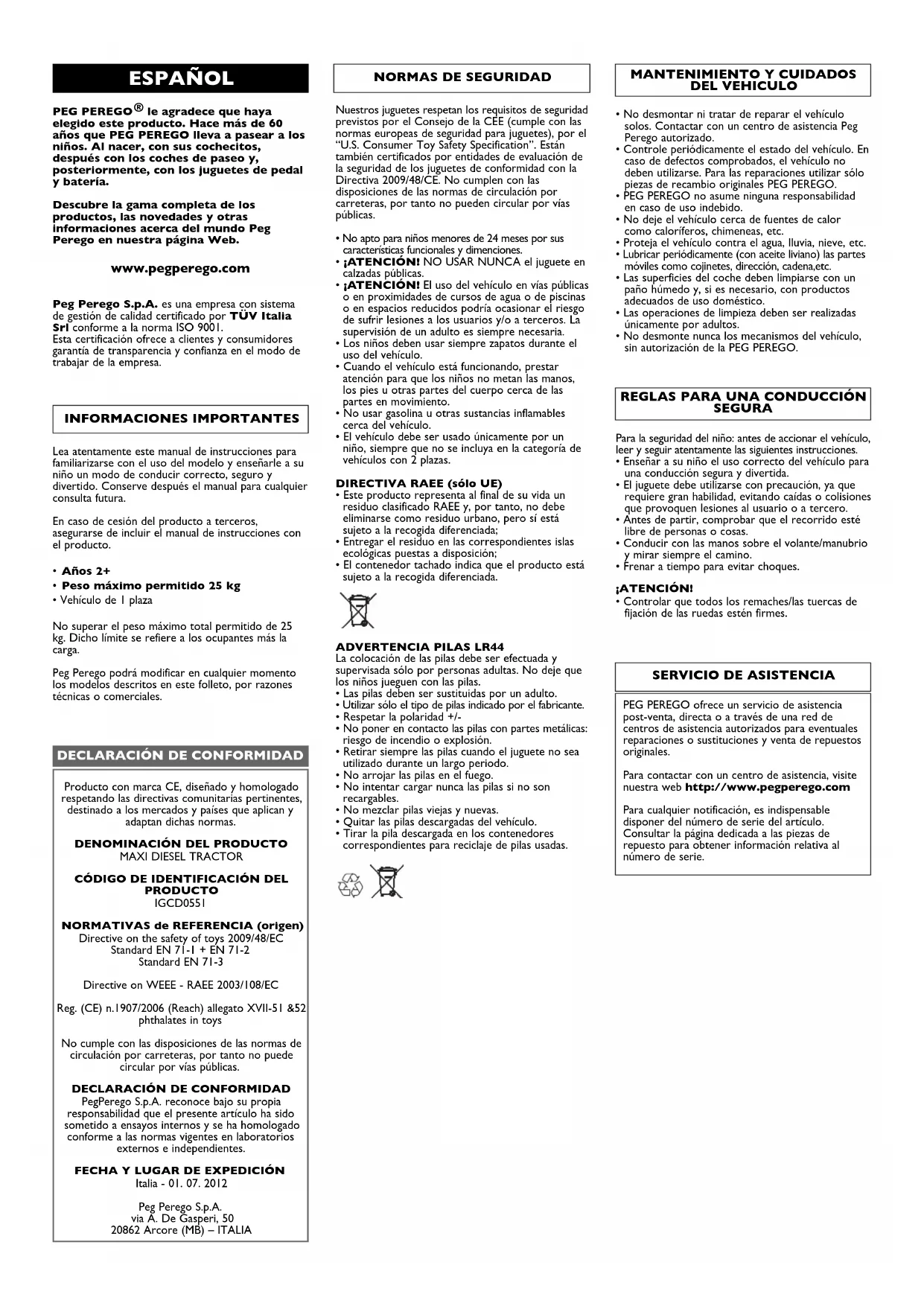 Italia - 01. 07. 2012 Peg Perego S.p.A. via A. De Gasperi, 50 20862 Arcore (MB) – ITALIA ESPAÑOL