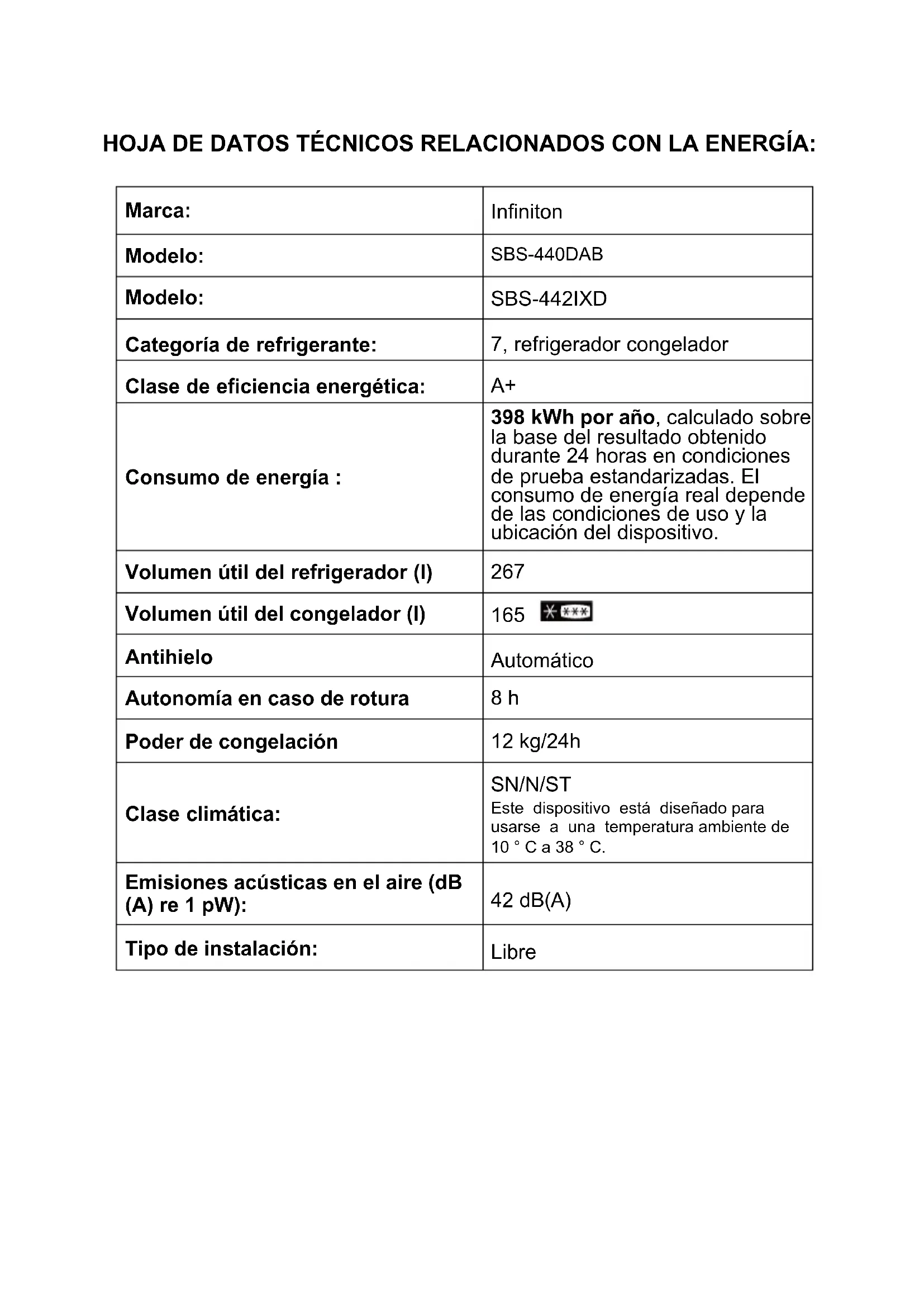 Potencia soportada 220-240V~ Potencia eléctrica 50Hz Dimensiones Largo x Ancho x Alto 836 x 1780 x 636 mm Peso neto 80 kg Tipo de instalación Libre Gas refrigerante R600a (75g) Aislante: CiclopentanoHOJA DE DATOS TÉCNICOS RELACIONADOS CON LA ENERGÍA: Marca: Infiniton SBS-440DAB Modelo: SBS-442IXD Categoría de refrigerante: 7, refrigerador congelador Clase de eficiencia energética: