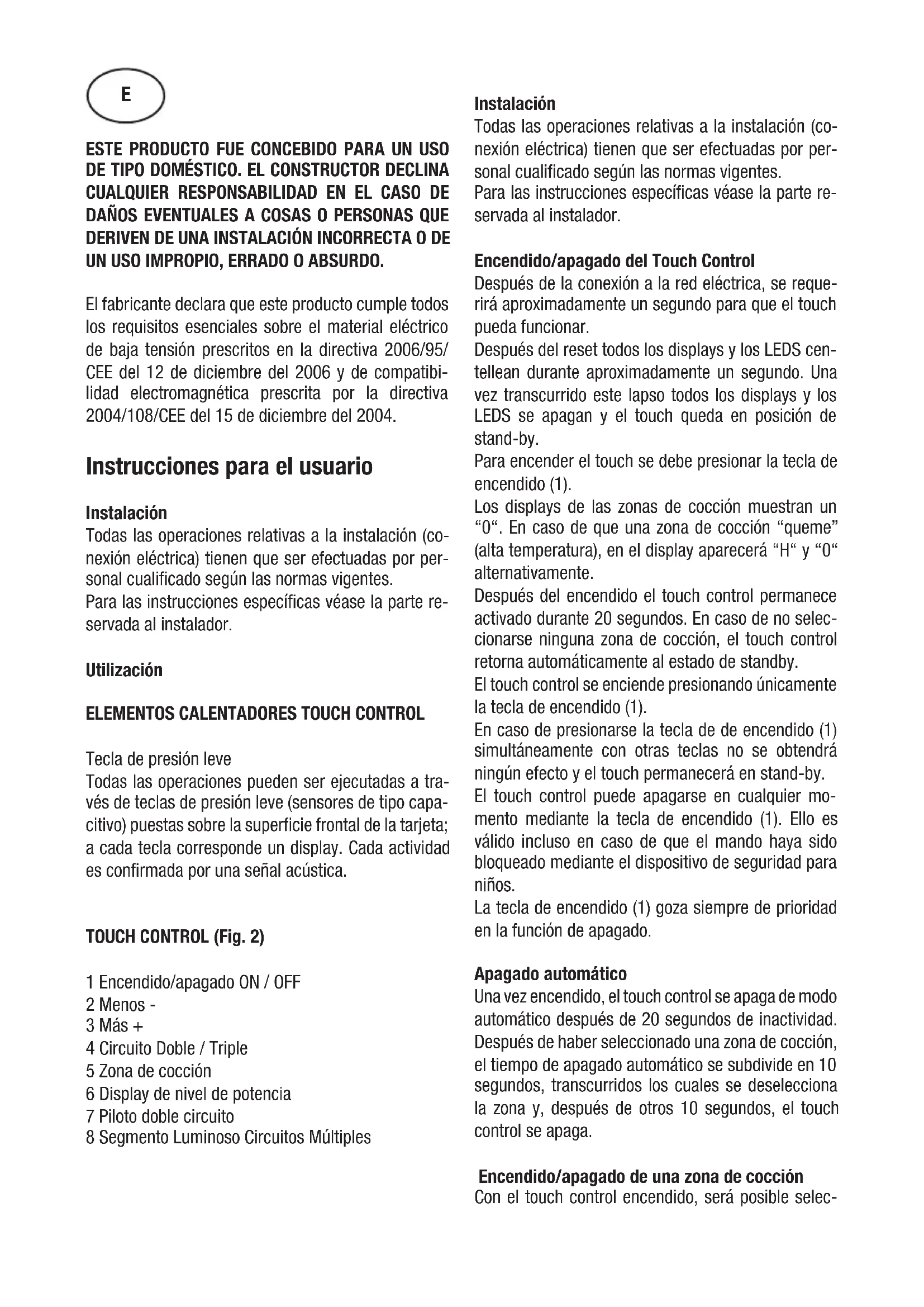 Tecla de presión leve Todas las operaciones pueden ser ejecutadas a tra- vés de teclas de presión leve (sensores de tipo capa- citivo) puestas sobre la superficie frontal de la tarjeta; a cada tecla corresponde un display. Cada actividad es confirmada por una señal acústica. TOUCH CONTROL (Fig. 2) 1 Encendido/apagado ON / OFF 2 Menos - 3 Más + 4 Circuito Doble / Triple 5 Zona de cocción 6 Display de nivel de potencia 7 Piloto doble circuito 8 Segmento Luminoso Circuitos Múltiples Instalación Todas las operaciones relativas a la instalación (co- nexión eléctrica) tienen que ser efectuadas por per- sonal cualificado según las normas vigentes. Para las instrucciones específicas véase la parte re- servada al instalador. Encendido/apagado del Touch Control Después de la conexión a la red eléctrica, se reque- rirá aproximadamente un segundo para que el touch pueda funcionar. Después del reset todos los displays y los LEDS cen- tellean durante aproximadamente un segundo. Una vez transcurrido este lapso todos los displays y los LEDS se apagan y el touch queda en posición de stand-by. Para encender el touch se debe presionar la tecla de encendido (1). Los displays de las zonas de cocción muestran un “0“. En caso de que una zona de cocción “queme” (alta temperatura), en el display aparecerá “H“ y “0“ alternativamente. Después del encendido el touch control permanece activado durante 20 segundos. En caso de no selec- cionarse ninguna zona de cocción, el touch control retorna automáticamente al estado de standby. El touch control se enciende presionando únicamente la tecla de encendido (1). En caso de presionarse la tecla de de encendido (1) simultáneamente con otras teclas no se obtendrá ningún efecto y el touch permanecerá en stand-by. El touch control puede apagarse en cualquier mo- mento mediante la tecla de encendido (1). Ello es válido incluso en caso de que el mando haya sido bloqueado mediante el dispositivo de seguridad para niños. La tecla de encendido (1) goza siempre de prioridad en la función de apagado. Apagado automático Una vez encendido, el touch control se apaga de modo automático después de 20 segundos de inactividad. Después de haber seleccionado una zona de cocción, el tiempo de apagado automático se subdivide en 10 segundos, transcurridos los cuales se deselecciona la zona y, después de otros 10 segundos, el touch control se apaga. Encendido/apagado de una zona de cocción Con el touch control encendido, será posible selec- Ecionar la zona de cocción presionando la tecla (5) de la zona correspondiente. El display (6) de la zona seleccionada se vuelve más brillante, mientras que el resto de displays pierde lu- minosidad. Si el área “quema” se visualizarán alter- nativamente “H” y “0”. Presionando la tecla MÁS (3) o MENOS (2), será po- sible seleccionar un nivel de potencia y la zona co- menzará a calentar. Una vez seleccionada la zona de cocción, podrá se- leccionarse el nivel de potencia manteniendo presio- nada para ello la tecla MÁS (3); partiendo desde el nivel 1 se incrementa en la medida de una unidad cada 0,4 segundos. Al alcanzarse el nivel 9 no será posible efectuar otros incrementos. Si el nivel de potencia ha sido seleccionado median- te la tecla MENOS (2), el nivel inicial es el “9” (nivel máximo). Manteniendo presionada la tecla, el nivel activo decrece en la medida de una unidad cada 0,4 segundos. Una vez alcanzado el nivel 0 no será posi- ble efectuar ulteriores decrementos. Sólo presionan- do nuevamente la tecla MENOS (2) o MÁS (3) será posible modificar el nivel de potencia. Apagado de una zona de cocción Seleccionar la zona que se desea apagar mediante la tecla (5) correspondiente. El display (6) de la zona seleccionada se vuelve más brillante, mientras que el resto de displays pierde luminosidad. Presionando las teclas MÁS (3) y MENOS (2) de modo simultáneo, el nivel de potencia de la zona se coloca a 0. Como alternativa la tecla MENOS (2) puede utilizarse para reducir el nivel de potencia hasta 0. Si una zona de cocción “quema”, aparecerá una “H” y un “0” alternativamente. Apagado de todas las zonas de cocción Presionando la tecla de encendido (1) podrá obte- nerse en cualquier momento el apagado inmediato de todas las zonas. En modalidad standby aparecerá una “H“ en el display de todas las zonas de cocción que “queman”. Todos los restantes displays estarán apagados. Nivel de potencia La potencia de la zona de cocción dispone de 9 ni- veles que aparecen indicados con los símbolos de “1“ a “9“ mediante los displays (6) de LED de siete segmentos. Indicador de calor residual Indica al usuario que el vidrio se encuentra a una temperatura peligrosa en caso de contacto con el área situada sobre la zona de cocción. La temperatu- ra es determinada según un modelo matemático y en caso de presencia de calor residual, ello es indicado con una “H” por el correspondiente display de siete segmentos. El calentamiento y el enfriamiento se calculan sobre la base de:
