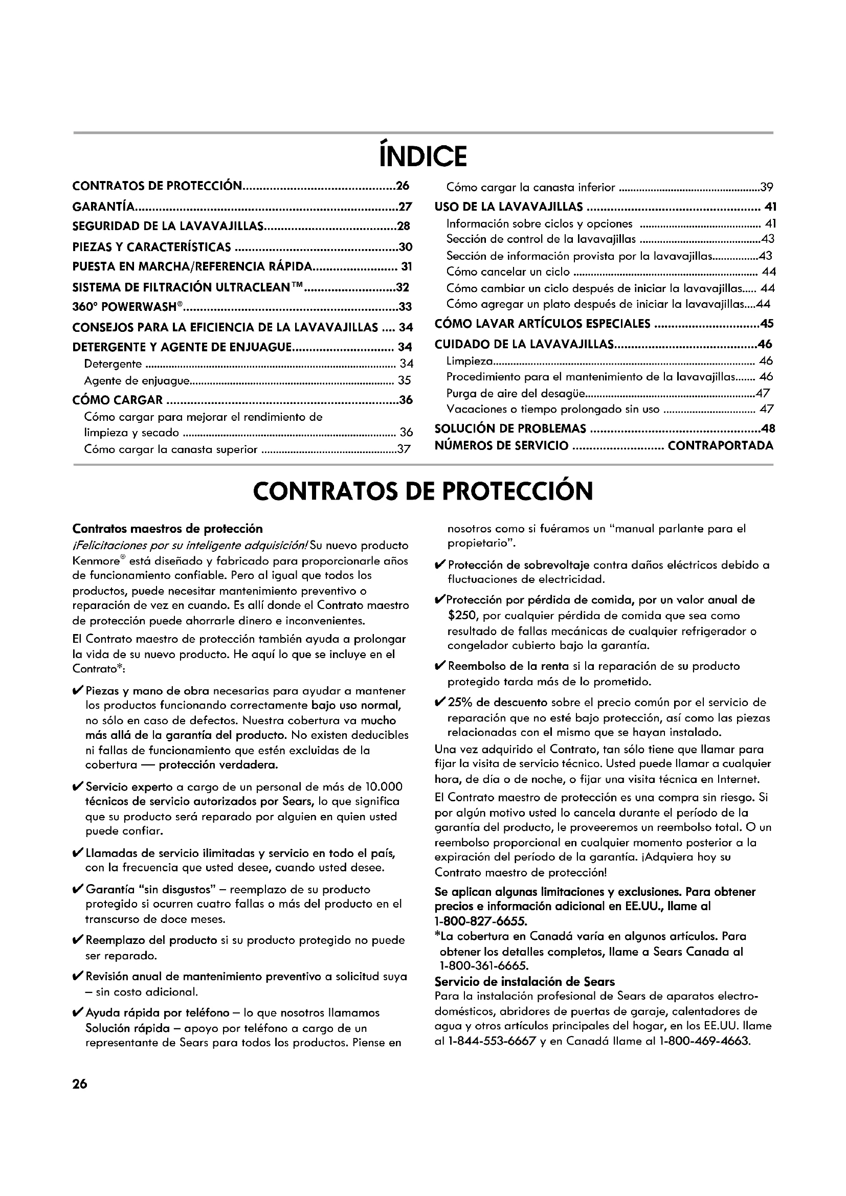 está diseñado y fabricado para proporcionarle años de funcionamiento confiable. Pero al igual que todos los productos, puede necesitar mantenimiento preventivo o reparación de vez en cuando. Es allí donde el Contrato maestro de protección puede ahorrarle dinero e inconvenientes. El Contrato maestro de protección también ayuda a prolongar la vida de su nuevo producto. He aquí lo que se incluye en el Contrato*: ✔Piezas y mano de obra necesarias para ayudar a mantener los productos funcionando correctamente bajo uso normal, no sólo en caso de defectos. Nuestra cobertura va mucho más allá de la garantía del producto. No existen deducibles ni fallas de funcionamiento que estén excluidas de la cobertura — protección verdadera. ✔Servicio experto a cargo de un personal de más de 10.000 técnicos de servicio autorizados por Sears, lo que significa que su producto será reparado por alguien en quien usted puede confiar. ✔Llamadas de servicio ilimitadas y servicio en todo el país, con la frecuencia que usted desee, cuando usted desee. ✔Garantía “sin disgustos” – reemplazo de su producto protegido si ocurren cuatro fallas o más del producto en el transcurso de doce meses. ✔Reemplazo del producto si su producto protegido no puede ser reparado. ✔Revisión anual de mantenimiento preventivo a solicitud suya – sin costo adicional. ✔Ayuda rápida por teléfono – lo que nosotros llamamos Solución rápida – apoyo por teléfono a cargo de un representante de Sears para todos los productos. Piense en nosotros como si fuéramos un “manual parlante para el propietario”. ✔Protección de sobrevoltaje contra daños eléctricos debido a fluctuaciones de electricidad. ✔Protección por pérdida de comida, por un valor anual de $250, por cualquier pérdida de comida que sea como resultado de fallas mecánicas de cualquier refrigerador o congelador cubierto bajo la garantía. ✔Reembolso de la renta si la reparación de su producto protegido tarda más de lo prometido. ✔25% de descuento sobre el precio común por el servicio de reparación que no esté bajo protección, así como las piezas relacionadas con el mismo que se hayan instalado. Una vez adquirido el Contrato, tan sólo tiene que llamar para fijar la visita de servicio técnico. Usted puede llamar a cualquier hora, de día o de noche, o fijar una visita técnica en Internet. El Contrato maestro de protección es una compra sin riesgo. Si por algún motivo usted lo cancela durante el período de la garantía del producto, le proveeremos un reembolso total. O un reembolso proporcional en cualquier momento posterior a la expiración del período de la garantía. ¡Adquiera hoy su Contrato maestro de protección! Se aplican algunas limitaciones y exclusiones. Para obtener precios e información adicional en EE.UU., llame al 1-800-827-6655. *La cobertura en Canadá varía en algunos artículos. Para obtener los detalles completos, llame a Sears Canada al 1-800-361-6665. Servicio de instalación de Sears Para la instalación profesional de Sears de aparatos electro- domésticos, abridores de puertas de garaje, calentadores de agua y otros artículos principales del hogar, en los EE.UU. llame al 1-844-553-6667 y en Canadá llame al 1-800-469-4663.27
