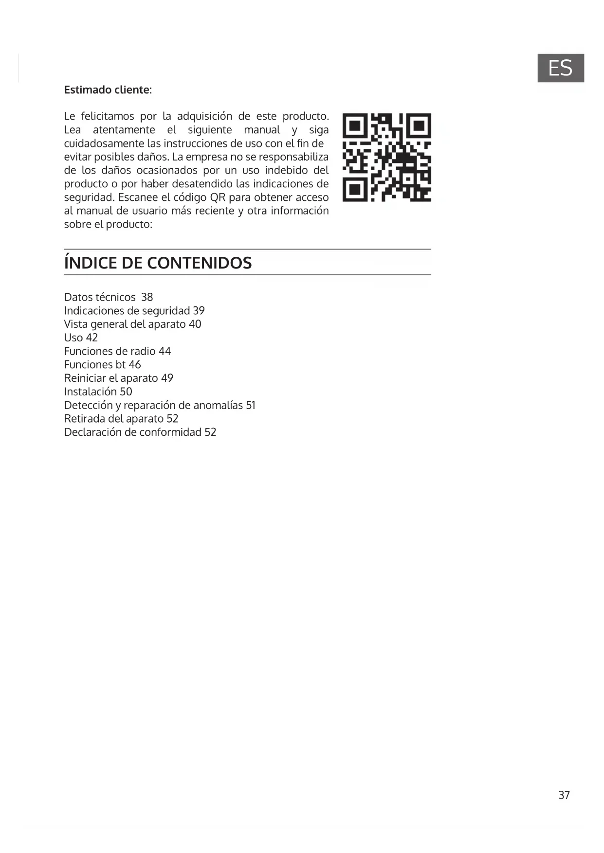 Datos técnicos 38 Indicaciones de seguridad 39 Vista general del aparato 40 Uso 42 Funciones de radio 44 Funciones bt 46 Reiniciar el aparato 49 Instalación 50 Detección y reparación de anomalías 51 Retirada del aparato 52 Declaración de conformidad 5238
