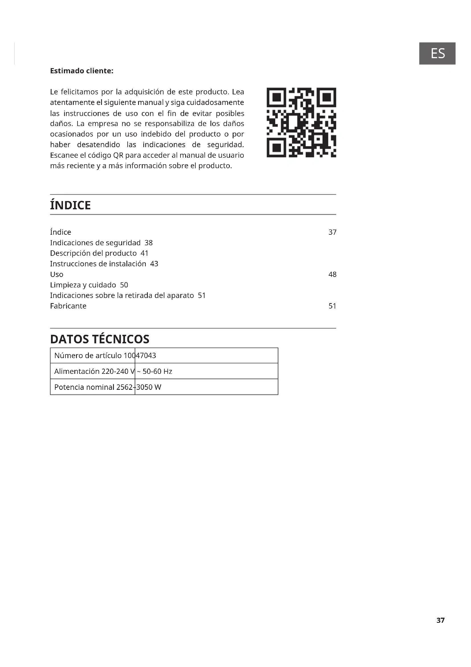 Número de artículo 10047043 Alimentación 220-240 V ~ 50-60 Hz Potencia nominal 2562–3050 W ÍNDICE Índice 37 Indicaciones de seguridad 38 Descripción del producto 41 Instrucciones de instalación 43 Uso 48 Limpieza y cuidado 50 Indicaciones sobre la retirada del aparato 51 Fabricante 51 Estimado cliente: Le felicitamos por la adquisición de este producto. Lea atentamente el siguiente manual y siga cuidadosamente las instrucciones de uso con el n de evitar posibles daños. La empresa no se responsabiliza de los daños ocasionados por un uso indebido del producto o por haber desatendido las indicaciones de seguridad. Escanee el código QR para acceder al manual de usuario más reciente y a más información sobre el producto.38