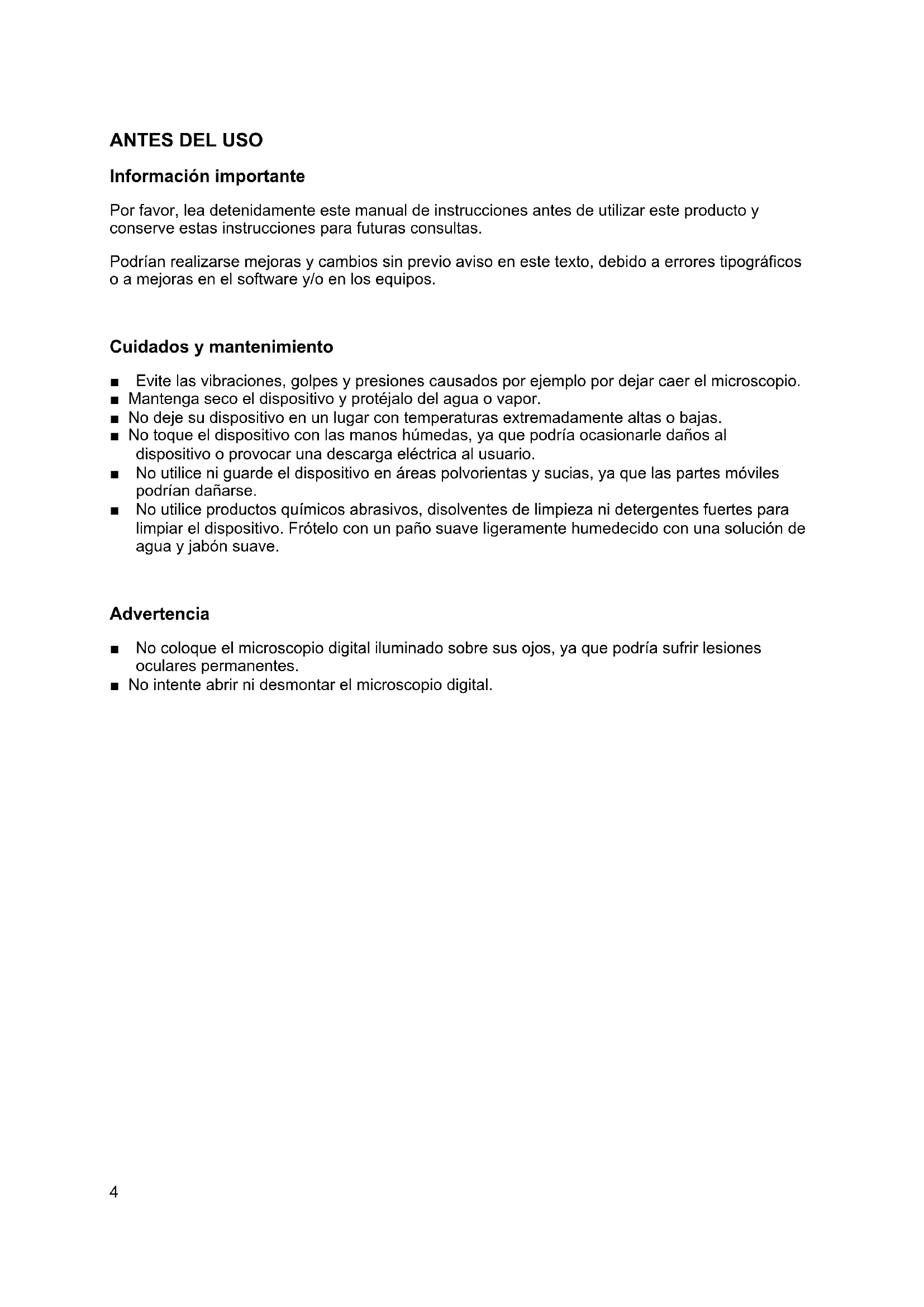 Información importante Por favor, lea detenidamente este manual de instrucciones antes de utilizar este producto y conserve estas instrucciones para futuras consultas. Podrían realizarse mejoras y cambios sin previo aviso en este texto, debido a errores tipográficos o a mejoras en el software y/o en los equipos. Cuidados y mantenimiento ■ Evite las vibraciones, golpes y presiones causados por ejemplo por dejar caer el microscopio. ■ Mantenga seco el dispositivo y protéjalo del agua o vapor. ■ No deje su dispositivo en un lugar con temperaturas extremadamente altas o bajas. ■ No toque el dispositivo con las manos húmedas, ya que podría ocasionarle daños al dispositivo o provocar una descarga eléctrica al usuario. ■ No utilice ni guarde el dispositivo en áreas polvorientas y sucias, ya que las partes móviles podrían dañarse. ■ No utilice productos químicos abrasivos, disolventes de limpieza ni detergentes fuertes para limpiar el dispositivo. Frótelo con un paño suave ligeramente humedecido con una solución de agua y jabón suave. Advertencia ■ No coloque el microscopio digital iluminado sobre sus ojos, ya que podría sufrir lesiones oculares permanentes. ■ No intente abrir ni desmontar el microscopio digital.5 Descripción del producto ■ Este microscopio digital es distinto de los microscopios ópticos tradicionales, ya que, en lugar de mirar a través de un ocular, la imagen ampliada o el vídeo en directo se visualiza en el monitor de un ordenador mediante una conexión USB. ■ Este dispositivo tiene 2 potencias de ampliación; puede ampliar las imágenes hasta 60 x y 250 x cuando se coloca directamente sobre el objeto y a través de un monitor de 17”. La potencia de ampliación depende del tamaño del monitor empleado: cuanto mayor sea el monitor, mayor será la ampliación. ■ Este dispositivo tiene 4 LEDs cuya intensidad puede ajustarse. Requisitos del ordenador PC con S.O. Windows Sistemas operativos compatibles Windows 10 (32 bit o 64 bit) Windows 8 (32 bit o 64 bit) Windows 7 (32 bit o 64 bit) Windows Vista (32 bit o 64 bit) Windows XP SP2, SP3 USB USB 2.0 PC con S.O. Mac Sistemas operativos compatibles Mac OS X 10.5.6 - Mac OS X 10.11.x USB USB 2.06