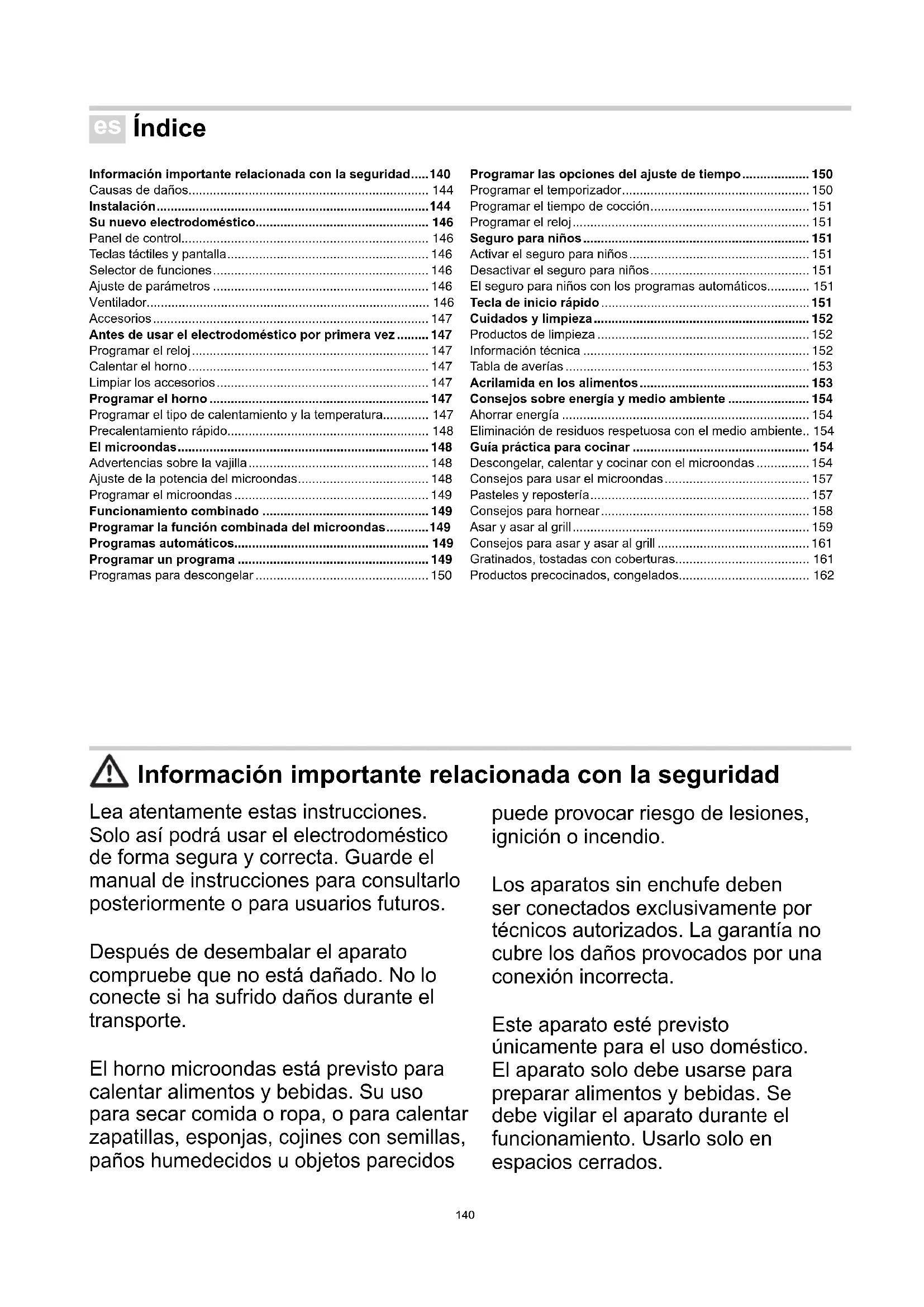 - Förvärm tillagningsutrymmet i 5 minuter. ** Placera maten i lämpliga, värmebeständiga tillagningskärl. Uppvärmningstyp Temperatur °C Mikrovågseffekt i watt Tillagningstid i minuter140 Índice Información importante relacionada con la seguridad Información importante relacionada con la seguridad ..... 140 Causas de daños.................................................................... 144 Instalación ............................................................................. 144 Su nuevo electrodoméstico................................................. 146 Panel de control...................................................................... 146 Teclas táctiles y pantalla ......................................................... 146 Selector de funciones ............................................................. 146 Ajuste de parámetros ............................................................. 146 Ventilador................................................................................ 146 Accesorios .............................................................................. 147 Antes de usar el electrodoméstico por primera vez ......... 147 Programar el reloj ................................................................... 147 Calentar el horno .................................................................... 147 Limpiar los accesorios ............................................................ 147 Programar el horno .............................................................. 147 Programar el tipo de calentamiento y la temperatura............. 147 Precalentamiento rápido......................................................... 148 El microondas ....................................................................... 148 Advertencias sobre la vajilla ................................................... 148 Ajuste de la potencia del microondas ..................................... 148 Programar el microondas ....................................................... 149 Funcionamiento combinado ............................................... 149 Programar la función combinada del microondas ............ 149 Programas automáticos....................................................... 149 Programar un programa ...................................................... 149 Programas para descongelar ................................................. 150 Programar las opciones del ajuste de tiempo ................... 150 Programar el temporizador ..................................................... 150 Programar el tiempo de cocción ............................................. 151 Programar el reloj ................................................................... 151 Seguro para niños ................................................................ 151 Activar el seguro para niños ................................................... 151 Desactivar el seguro para niños ............................................. 151 El seguro para niños con los programas automáticos............ 151 Tecla de inicio rápido ........................................................... 151 Cuidados y limpieza ............................................................. 152 Productos de limpieza ............................................................ 152 Información técnica ................................................................ 152 Tabla de averías ..................................................................... 153 Acrilamida en los alimentos ................................................ 153 Consejos sobre energía y medio ambiente ....................... 154 Ahorrar energía ...................................................................... 154 Eliminación de residuos respetuosa con el medio ambiente.. 154 Guía práctica para cocinar .................................................. 154 Descongelar, calentar y cocinar con el microondas ............... 154 Consejos para usar el microondas ......................................... 157 Pasteles y repostería .............................................................. 157 Consejos para hornear ........................................................... 158 Asar y asar al grill ................................................................... 159 Consejos para asar y asar al grill ........................................... 161 Gratinados, tostadas con coberturas...................................... 161 Productos precocinados, congelados..................................... 162 Lea atentamente estas instrucciones. Solo así podrá usar el electrodoméstico de forma segura y correcta. Guarde el manual de instrucciones para consultarlo posteriormente o para usuarios futuros. Después de desembalar el aparato compruebe que no está dañado. No lo conecte si ha sufrido daños durante el transporte. El horno microondas está previsto para calentar alimentos y bebidas. Su uso para secar comida o ropa, o para calentar zapatillas, esponjas, cojines con semillas, paños humedecidos u objetos parecidos puede provocar riesgo de lesiones, ignición o incendio. Los aparatos sin enchufe deben ser conectados exclusivamente por técnicos autorizados. La garantía no cubre los daños provocados por una conexión incorrecta. Este aparato esté previsto únicamente para el uso doméstico. El aparato solo debe usarse para preparar alimentos y bebidas. Se debe vigilar el aparato durante el funcionamiento. Usarlo solo en espacios cerrados. es141 Este electrodoméstico puede ser usado por niños mayores de 8 años y por personas con capacidades físicas, sensoriales o mentales reducidas o que carezcan de experiencia y conocimiento, siempre que estén supervisadas o se les haya instruido acerca del uso seguro del electrodoméstico y conozcan los riesgos que implica. Los niños no deben jugar con el electrodoméstico.La limpieza y el mantenimiento del usuario no deben ser hechos por niños sin supervisión