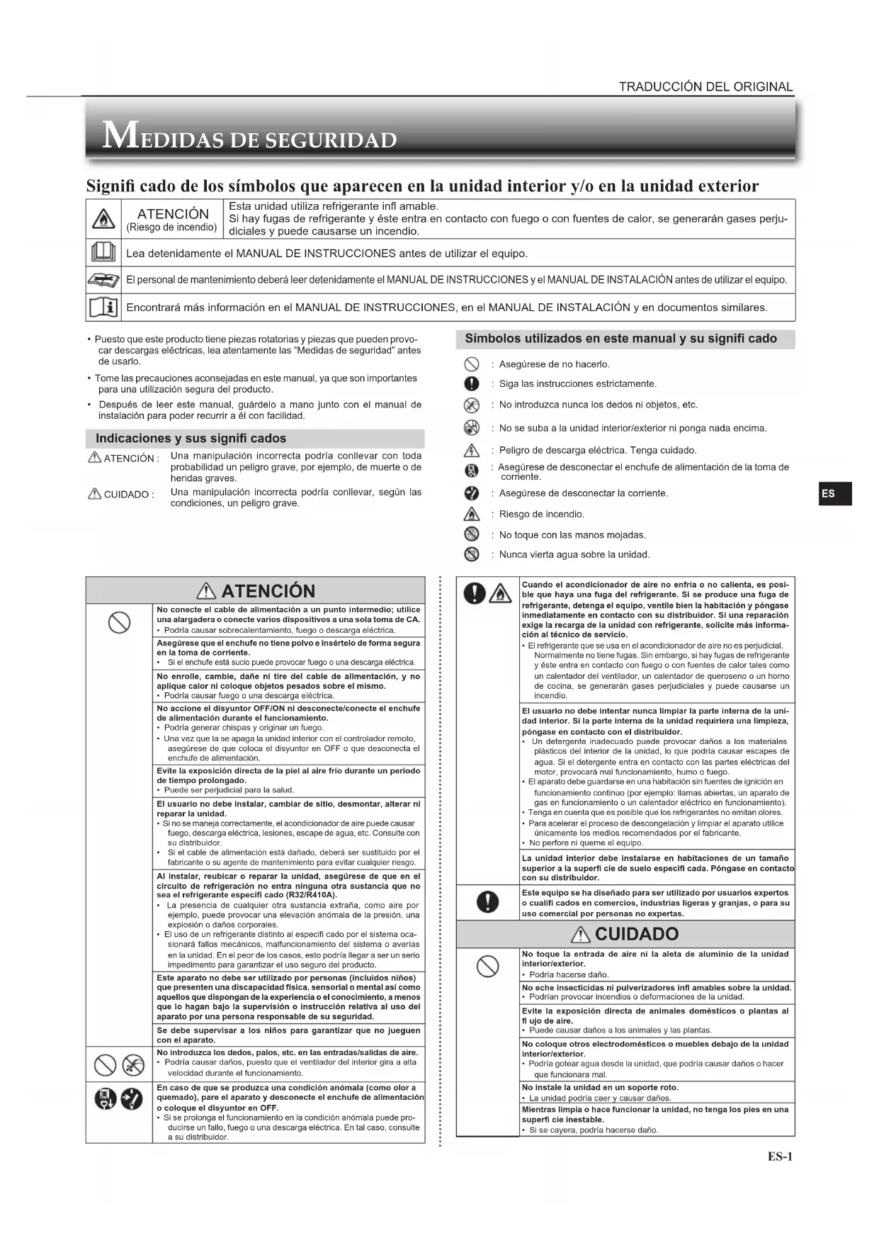 - Puesto que este producto tiene piezas rotatorias y piezas que pueden provo-car descargas eléctricas, lea atentamente las “Medidas de seguridad” antes de usarlo.• Tome las precauciones aconsejadas en este manual, ya que son importantes para una utilización segura del producto.• Después de leer este manual, guárdelo a mano junto con el manual de instalación para poder recurrir a él con facilidad. Indicaciones y sus signifi cados ATENCIÓN :Una manipulación incorrecta podría conllevar con toda probabilidad un peligro grave, por ejemplo, de muerte o de heridas graves. CUIDADO :Una manipulación incorrecta podría conllevar, según las condiciones, un peligro grave. Símbolos utilizados en este manual y su signifi cado : Asegúrese de no hacerlo. : Siga las instrucciones estrictamente. : No introduzca nunca los dedos ni objetos, etc. : No se suba a la unidad interior/exterior ni ponga nada encima. : Peligro de descarga eléctrica. Tenga cuidado. : Asegúrese de desconectar el enchufe de alimentación de la toma de corriente. : Asegúrese de desconectar la corriente. : Riesgo de incendio. : No toque con las manos mojadas. : Nunca vierta agua sobre la unidad. Signifi cado de los símbolos que aparecen en la unidad interior y/o en la unidad exterior ATENCIÓN (Riesgo de incendio)Esta unidad utiliza refrigerante infl amable.Si hay fugas de refrigerante y éste entra en contacto con fuego o con fuentes de calor, se generarán gases perju-diciales y puede causarse un incendio.Lea detenidamente el MANUAL DE INSTRUCCIONES antes de utilizar el equipo. El personal de mantenimiento deberá leer detenidamente el MANUAL DE INSTRUCCIONES y el MANUAL DE INSTALACIÓN antes de utilizar el equipo. Encontrará más información en el MANUAL DE INSTRUCCIONES, en el MANUAL DE INSTALACIÓN y en documentos similares. ATENCIÓN No conecte el cable de alimentación a un punto intermedio; utilice una alargadera o conecte varios dispositivos a una sola toma de CA.• Podría causar sobrecalentamiento, fuego o descarga eléctrica.Asegúrese que el enchufe no tiene polvo e insértelo de forma segura en la toma de corriente. Si el enchufe está sucio puede provocar fuego o una descarga eléctrica.No enrolle, cambie, dañe ni tire del cable de alimentación, y no aplique calor ni coloque objetos pesados sobre el mismo.• Podría causar fuego o una descarga eléctrica.No accione el disyuntor OFF/ON ni desconecte/conecte el enchufe de alimentación durante el funcionamiento.• Podría generar chispas y originar un fuego.• Una vez que la se apaga la unidad interior con el controlador remoto, asegúrese de que coloca el disyuntor en OFF o que desconecta el enchufe de alimentación. Evite la exposición directa de la piel al aire frío durante un periodo de tiempo prolongado.• Puede ser perjudicial para la salud.El usuario no debe instalar, cambiar de sitio, desmontar, alterar ni reparar la unidad.• Si no se maneja correctamente, el acondicionador de aire puede causar fuego, descarga eléctrica, lesiones, escape de agua, etc. Consulte con su distribuidor. Si el cable de alimentación está dañado, deberá ser sustituido por el fabricante o su agente de mantenimiento para evitar cualquier riesgo.Al instalar, reubicar o reparar la unidad, asegúrese de que en el circuito de refrigeración no entra ninguna otra sustancia que no sea el refrigerante especifi cado (R32/R410A).• La presencia de cualquier otra sustancia extraña, como aire por ejemplo, puede provocar una elevación anómala de la presión, una explosión o daños corporales.• El uso de un refrigerante distinto al especifi cado por el sistema oca-sionará fallos mecánicos, malfuncionamiento del sistema o averías en la unidad. En el peor de los casos, esto podría llegar a ser un serio impedimento para garantizar el uso seguro del producto.Este aparato no debe ser utilizado por personas (incluidos niños) que presenten una discapacidad física, sensorial o mental así como aquellos que dispongan de la experiencia o el conocimiento, a menos que lo hagan bajo la supervisión o instrucción relativa al uso del aparato por una persona responsable de su seguridad.Se debe supervisar a los niños para garantizar que no jueguen con el aparato. No introduzca los dedos, palos, etc. en las entradas/salidas de aire.• Podría causar daños, puesto que el ventilador del interior gira a alta velocidad durante el funcionamiento. En caso de que se produzca una condición anómala (como olor a quemado), pare el aparato y desconecte el enchufe de alimentación o coloque el disyuntor en OFF.• Si se prolonga el funcionamiento en la condición anómala puede pro-ducirse un fallo, fuego o una descarga eléctrica. En tal caso, consulte a su distribuidor. Cuando el acondicionador de aire no enfría o no calienta, es posi-ble que haya una fuga del refrigerante. Si se produce una fuga de refrigerante, detenga el equipo, ventile bien la habitación y póngase inmediatamente en contacto con su distribuidor. Si una reparación exige la recarga de la unidad con refrigerante, solicite más informa-ción al técnico de servicio.• El refrigerante que se usa en el acondicionador de aire no es perjudicial. Normalmente no tiene fugas. Sin embargo, si hay fugas de refrigerante y éste entra en contacto con fuego o con fuentes de calor tales como un calentador del ventilador, un calentador de queroseno o un horno de cocina, se generarán gases perjudiciales y puede causarse un incendio.El usuario no debe intentar nunca limpiar la parte interna de la uni-dad interior. Si la parte interna de la unidad requiriera una limpieza, póngase en contacto con el distribuidor.• Un detergente inadecuado puede provocar daños a los materiales plásticos del interior de la unidad, lo que podría causar escapes de agua. Si el detergente entra en contacto con las partes eléctricas del motor, provocará mal funcionamiento, humo o fuego.• El aparato debe guardarse en una habitación s