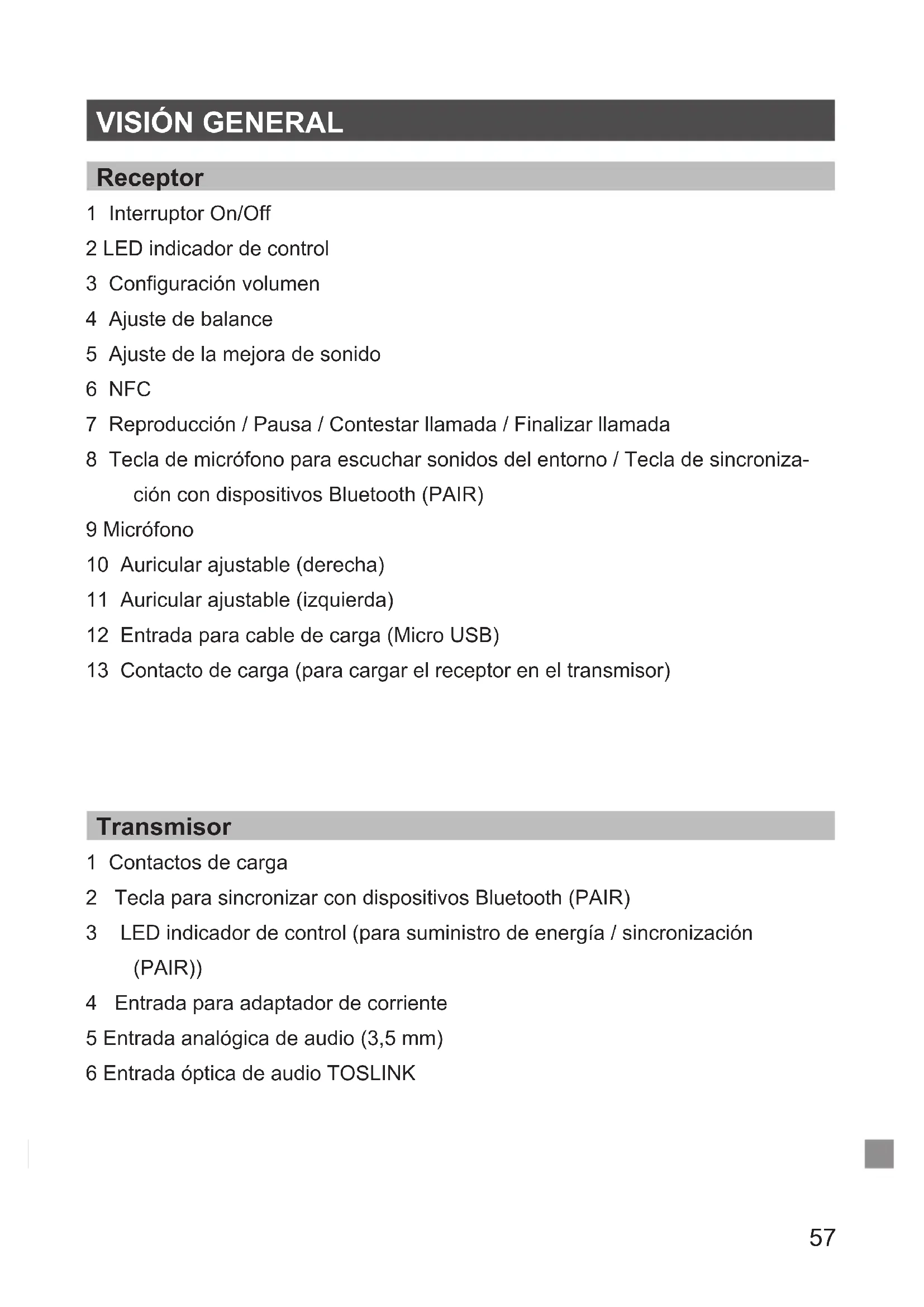 8 Tecla de micrófono para escuchar sonidos del entorno / Tecla de sincronización con dispositivos Bluetooth (PAIR)